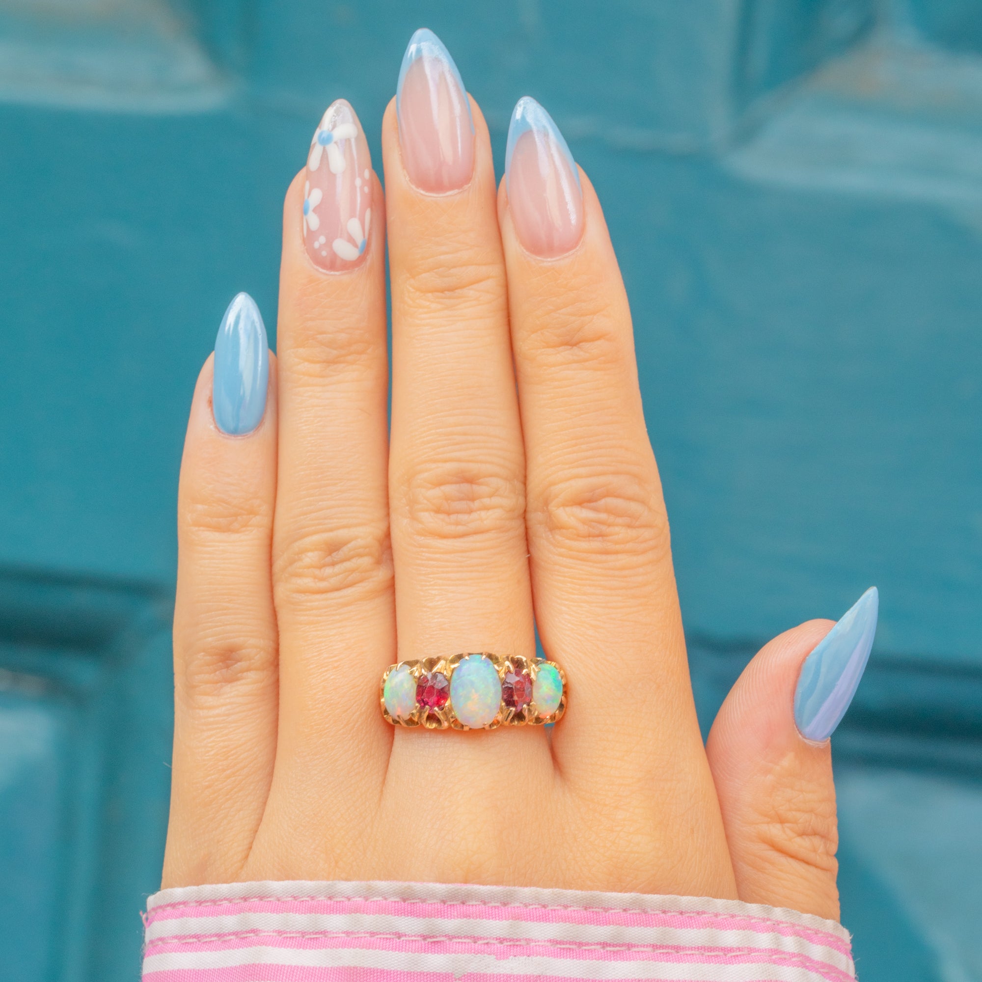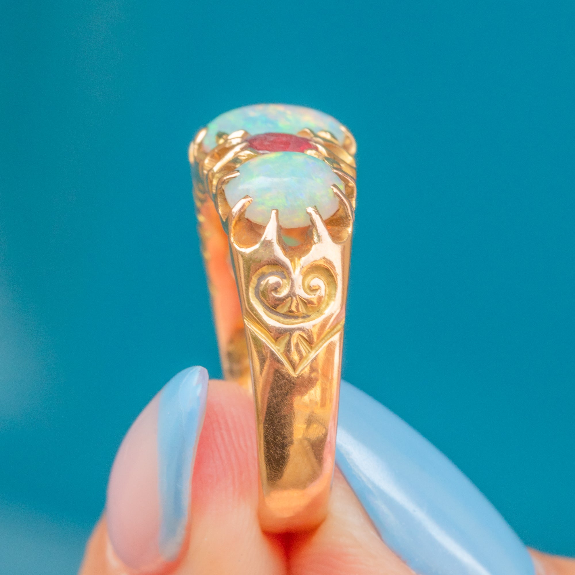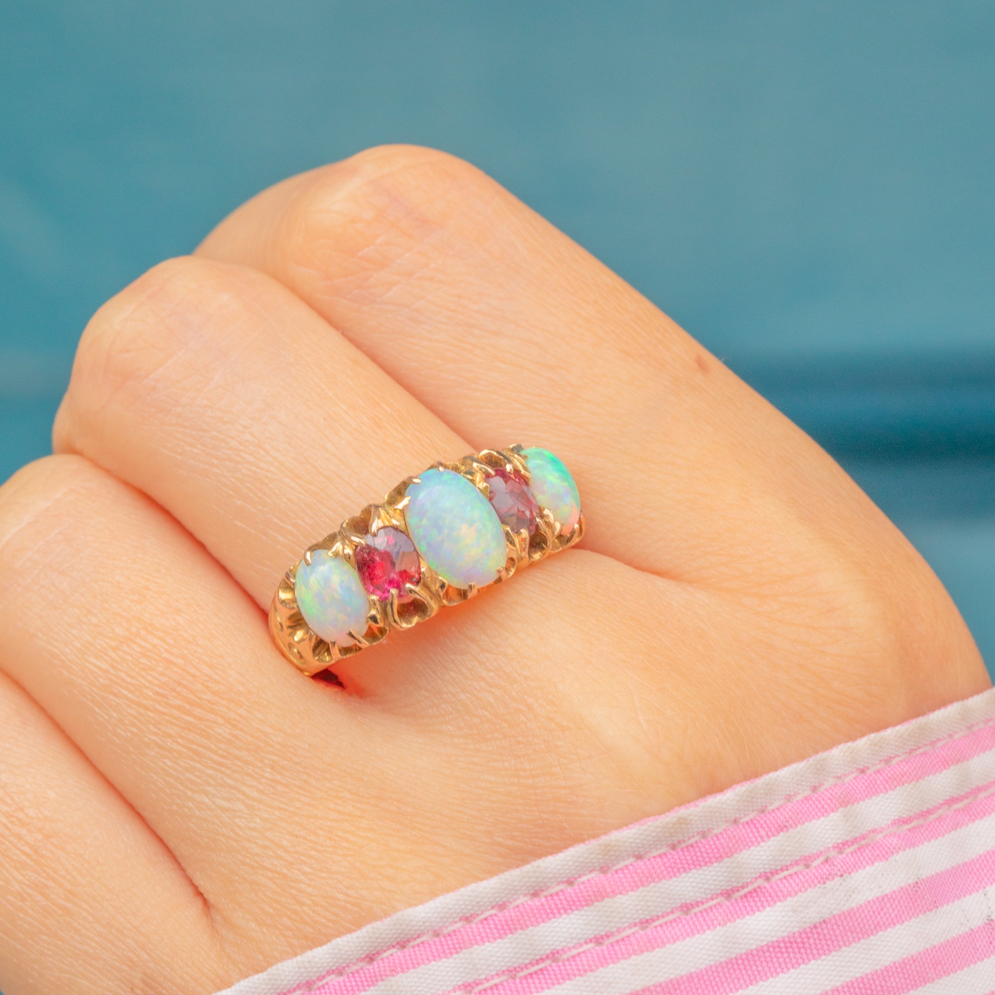 A resplendent antique ring, adorned by iridescent Opals and a vibrant Garnet, and Ruby to create a classic five stone ring. Each Opal projects a magical kaleidoscope of blues and greens, contrasted beautifully by the saturated fuchsia tones of the Ruby (right, hallmark facing) and Garnet (left, hallmark facing), all set in glossy 15ct Gold.