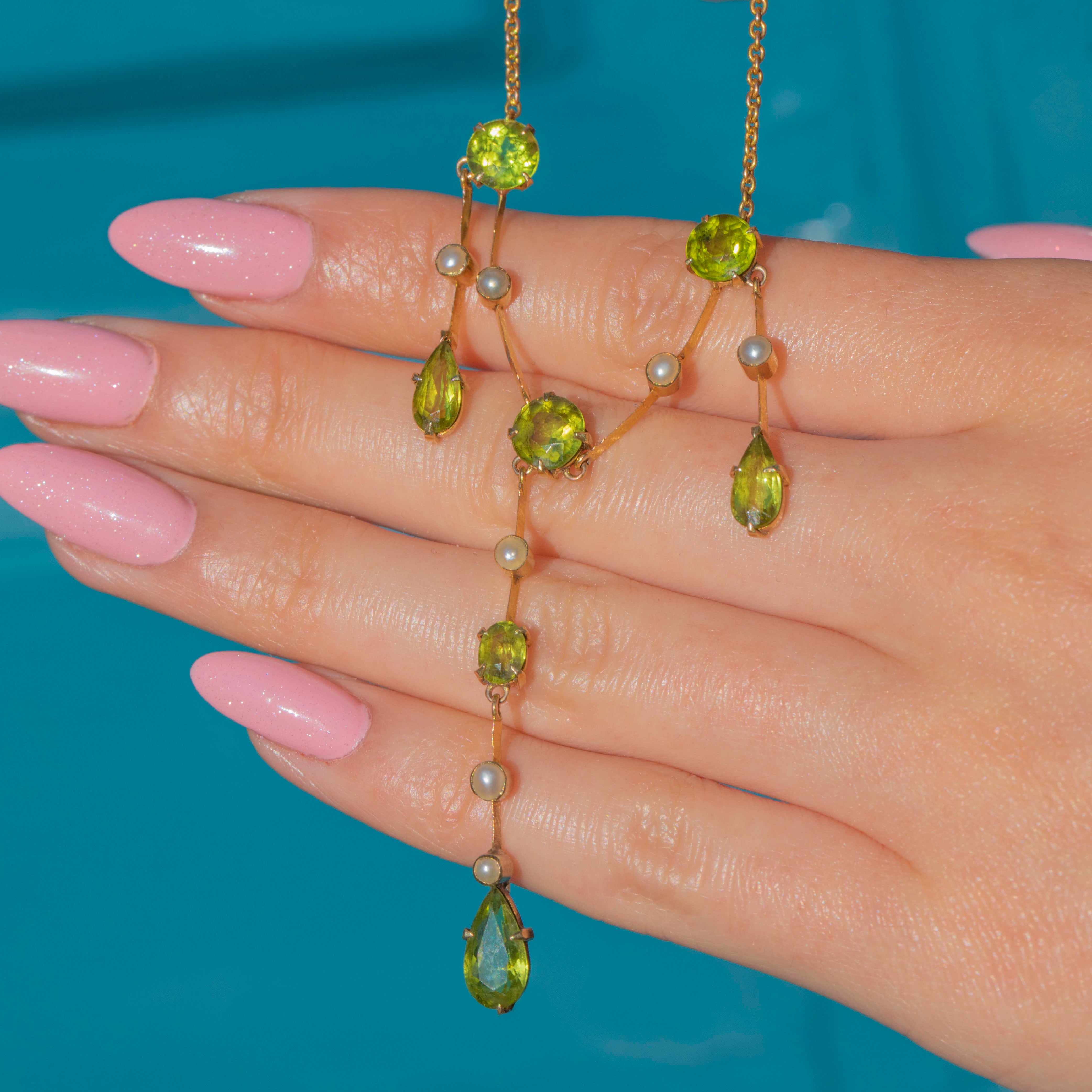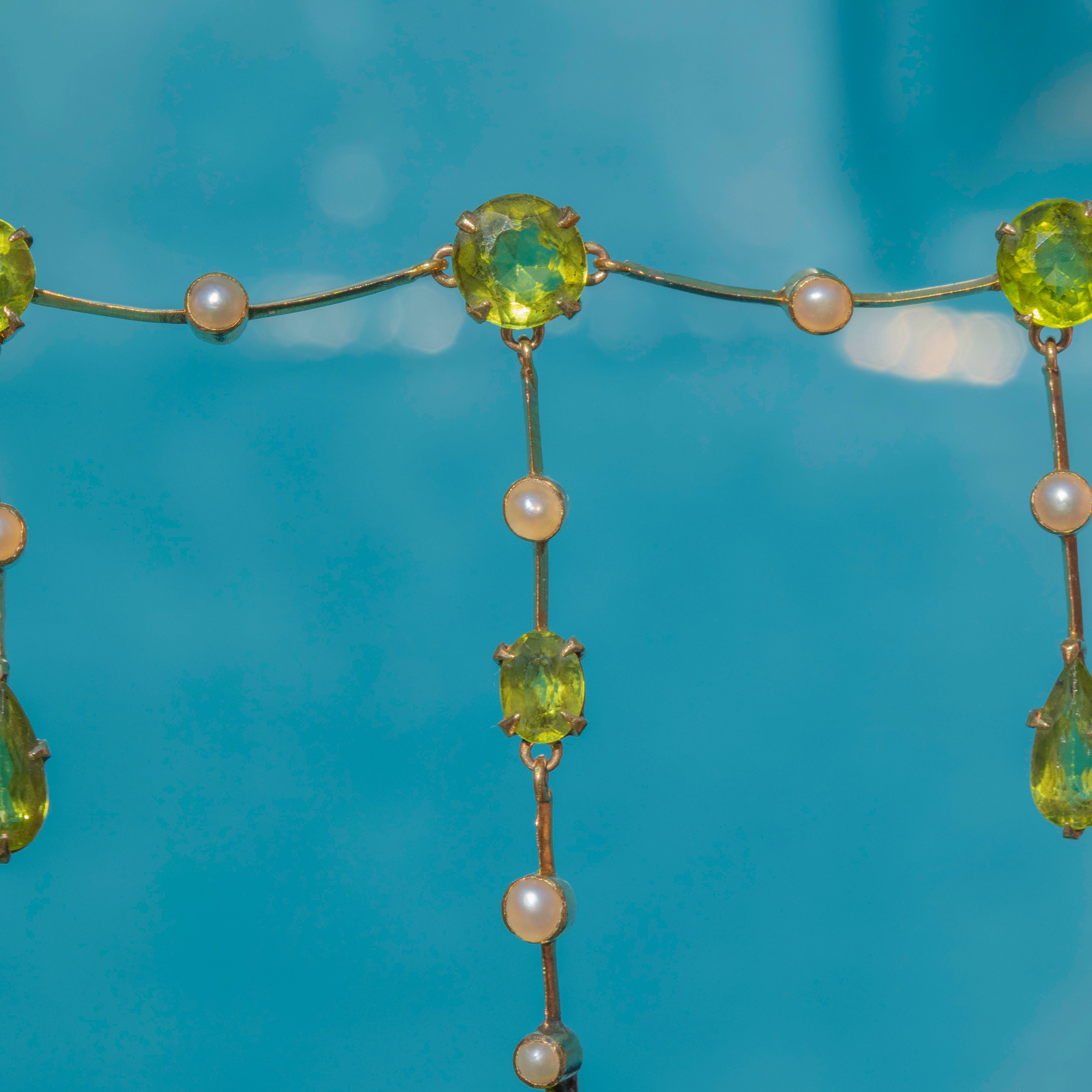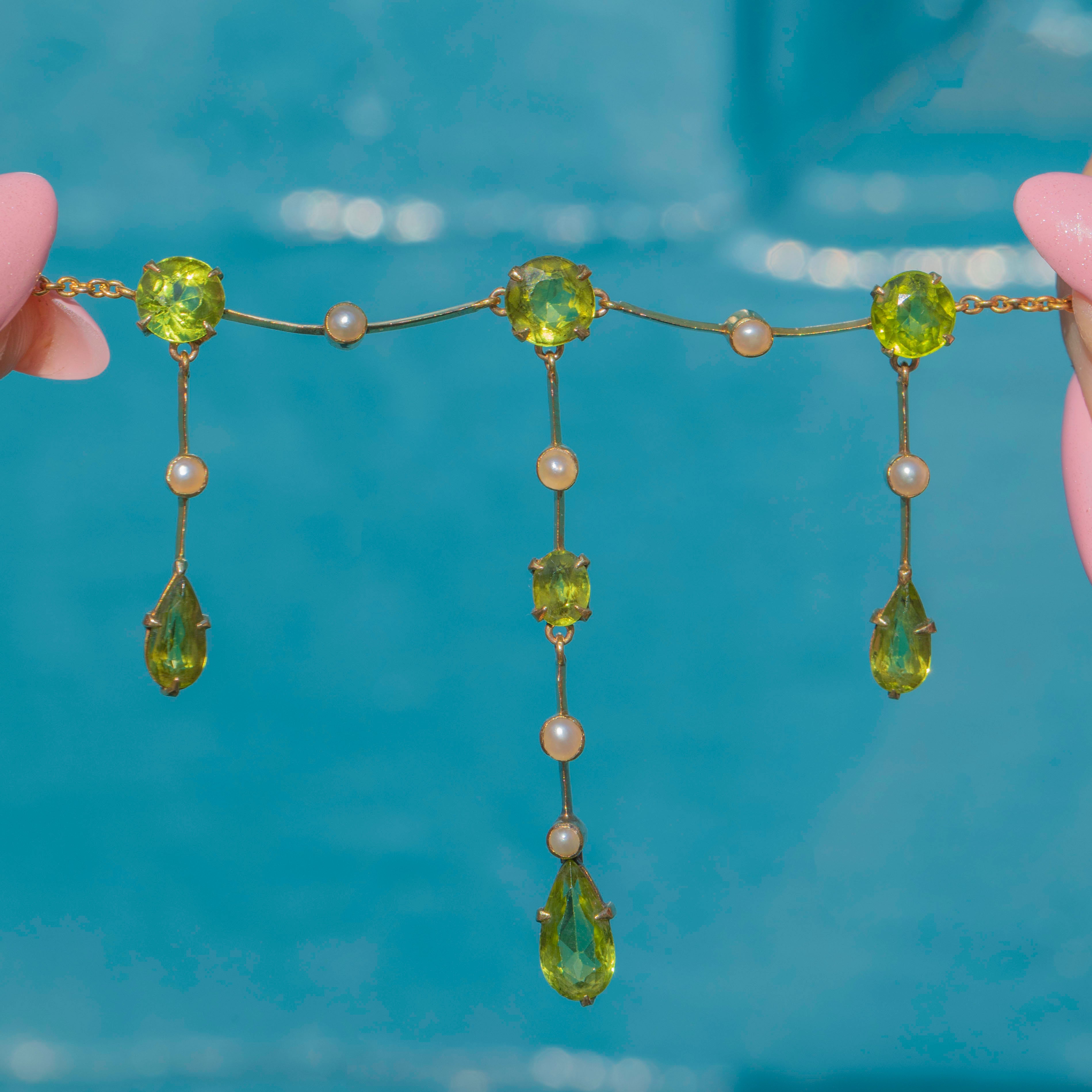 This Edwardian 15ct Gold Peridot Pearl fringe necklace is an exquisite antique piece! Crafted from glossy 15ct Gold, she boasts seven lime-green Peridots that gleam with a magnificent vibrancy as they capture the light.