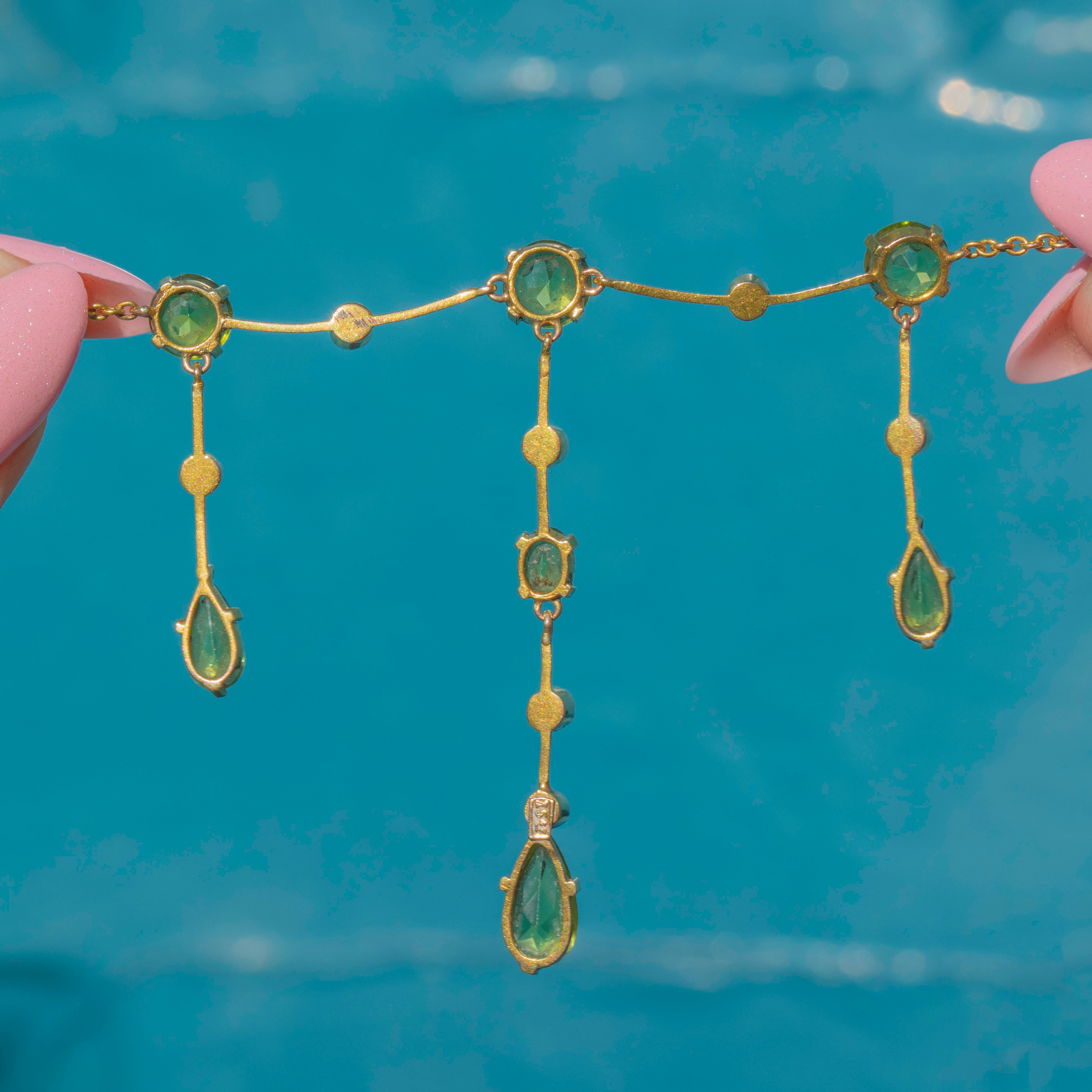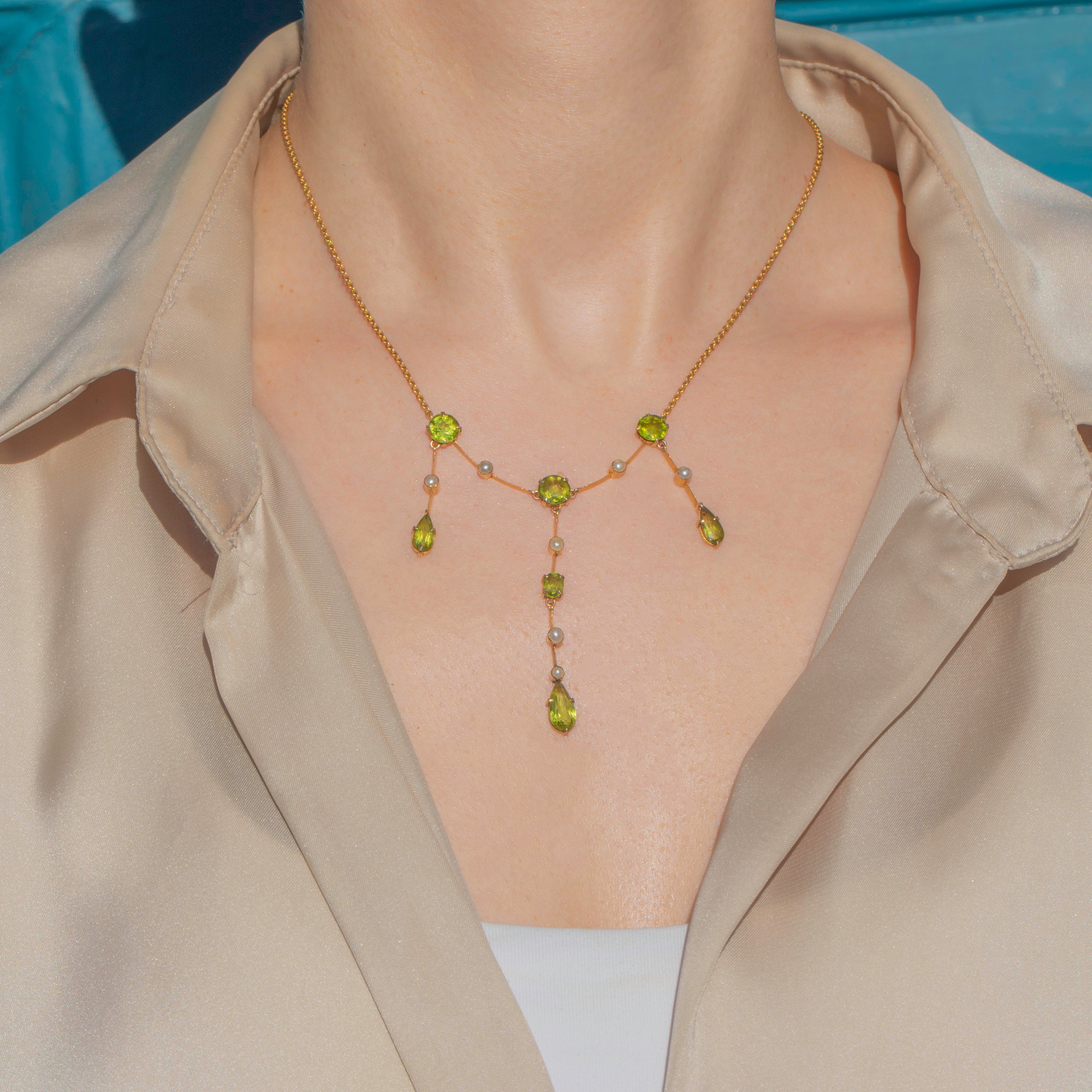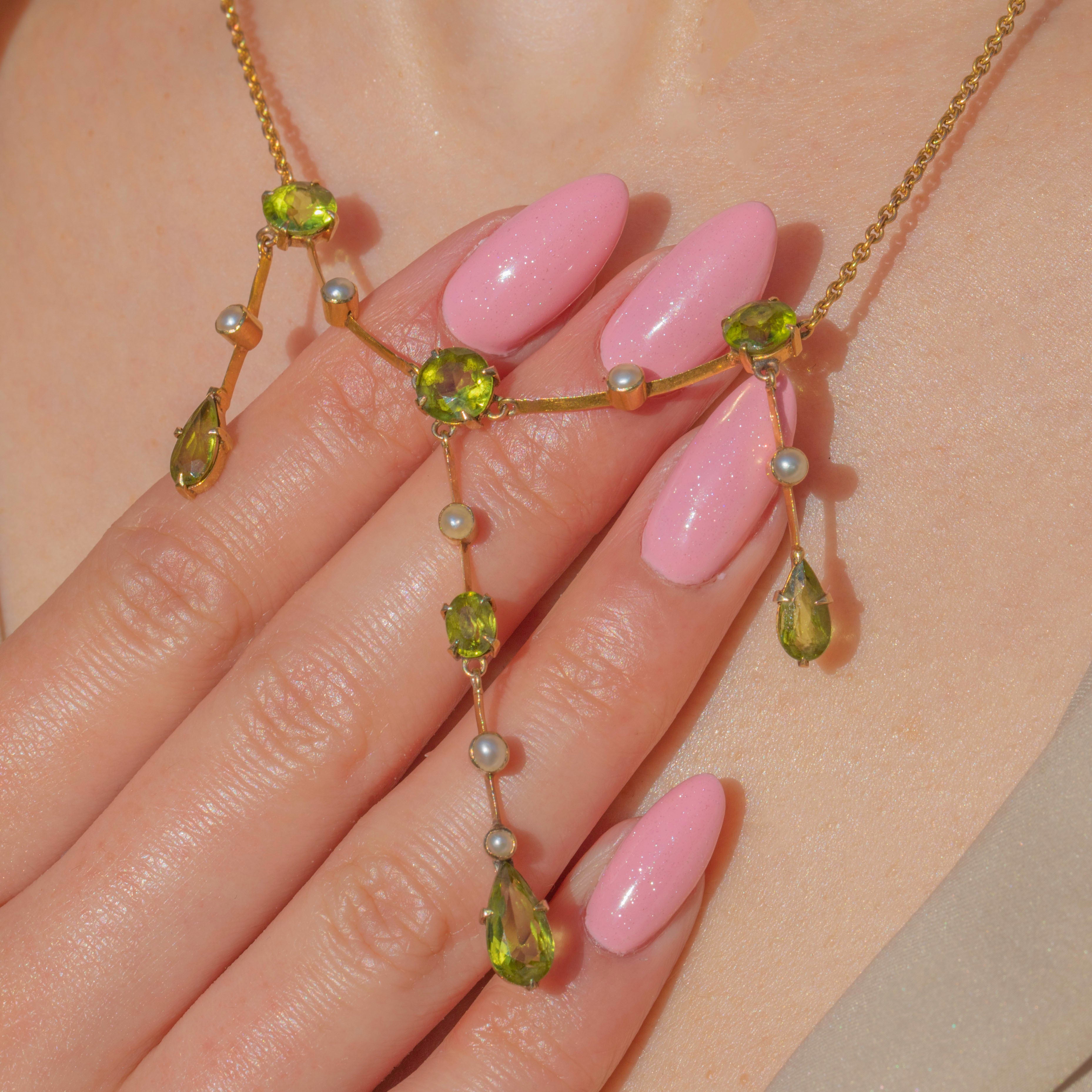 This Edwardian 15ct Gold Peridot Pearl fringe necklace is an exquisite antique piece! Crafted from glossy 15ct Gold, she boasts seven lime-green Peridots that gleam with a magnificent vibrancy as they capture the light.