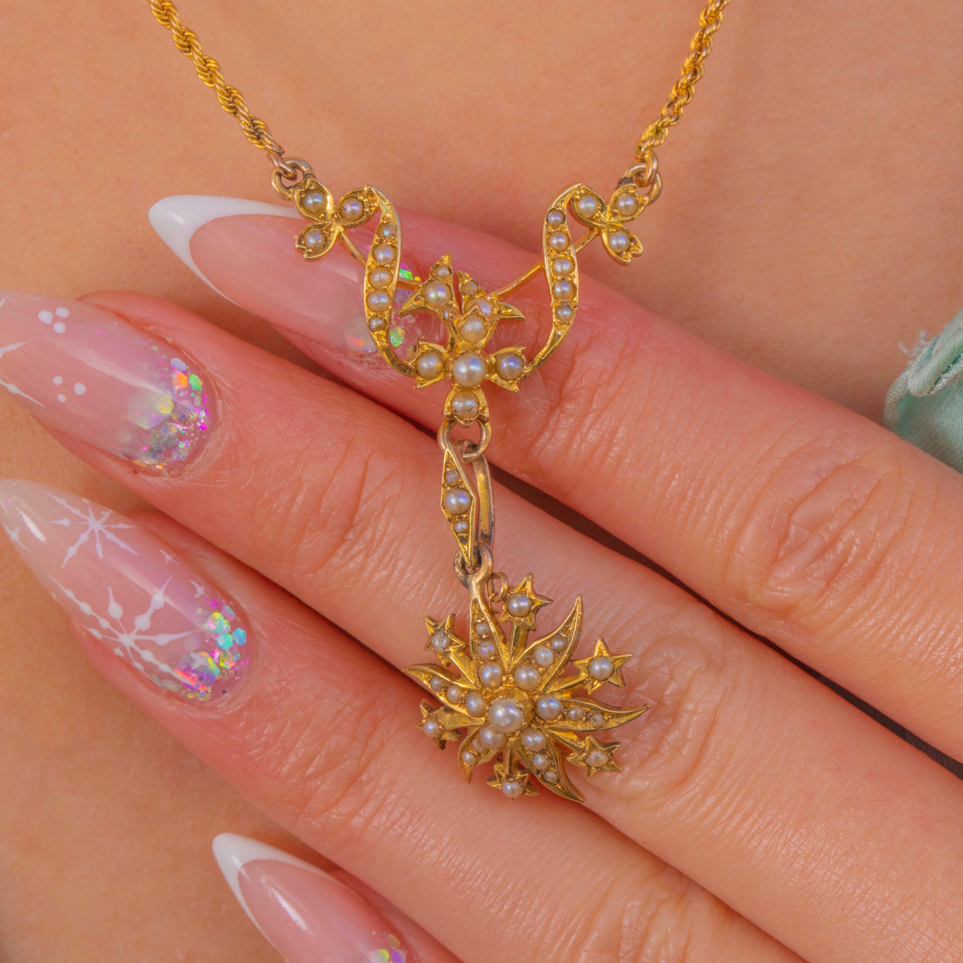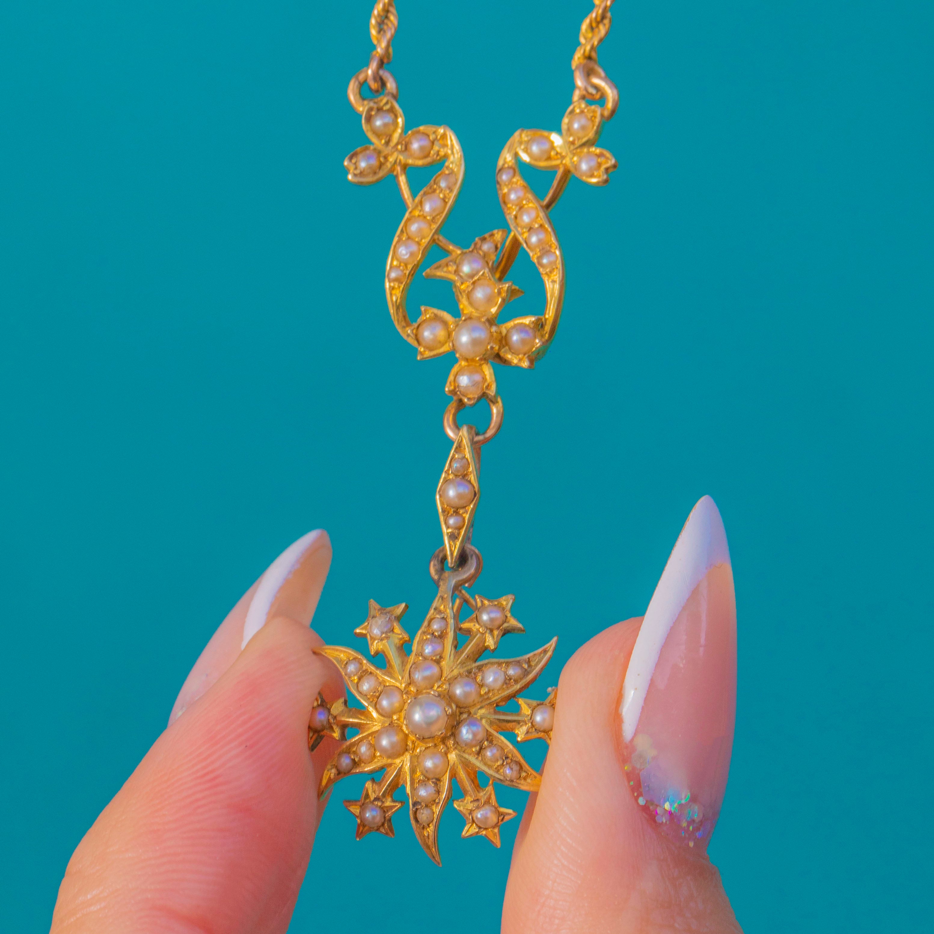 A luminous Edwardian necklace in rich 15ct Gold, its openwork bow and foliate scrolls shimmering with delicate Seed Pearls. The airy centre flows into an articulated link and a radiant starburst drop, each tiny Pearl neatly grain-set to catch the light with a soft, romantic glow.