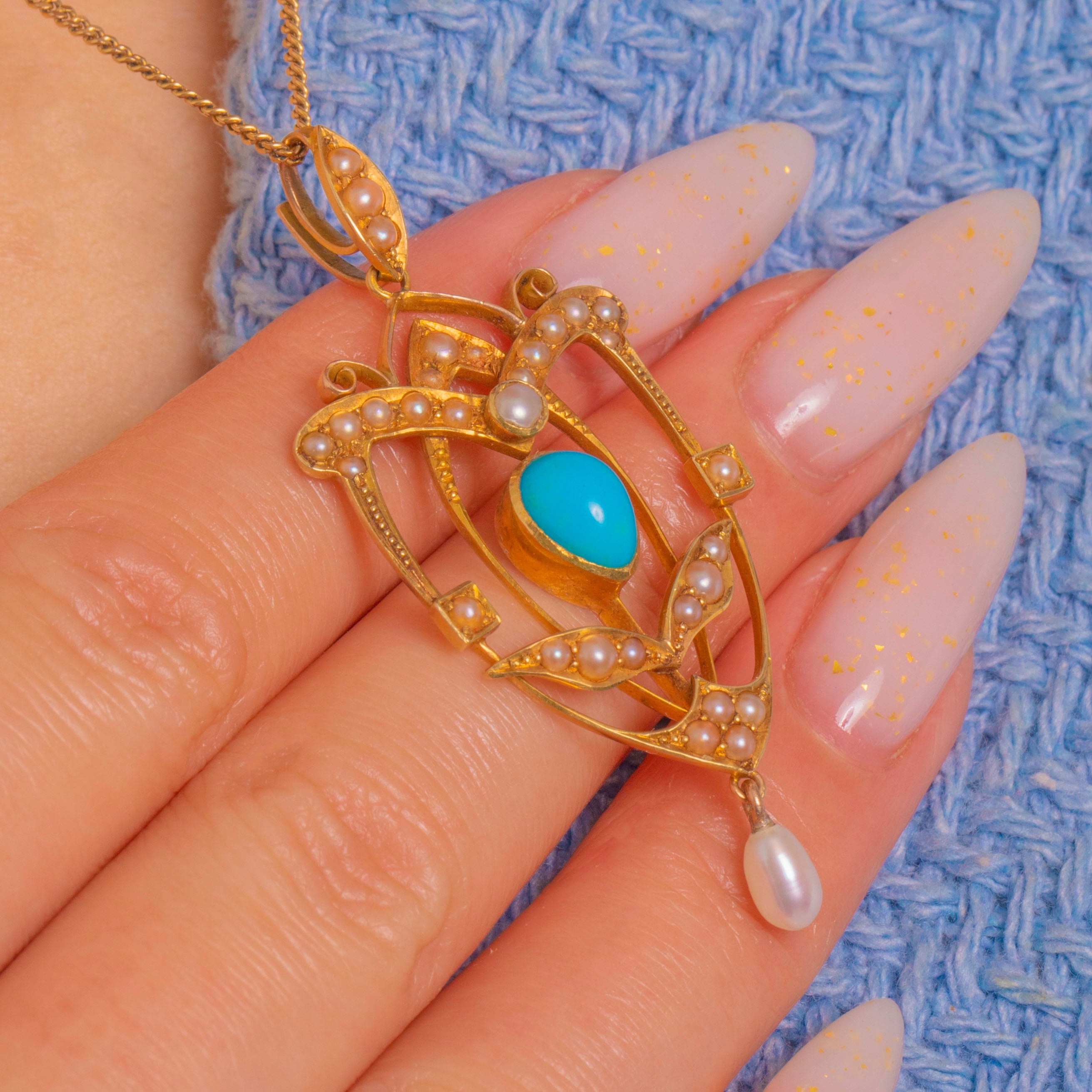 EXCELLENT: The Turquoise cabochon is smooth and glossy with no notable wear, and the Pearls are well-matched and intact. The 15ct Gold openwork and settings are crisp with only light surface wear, retaining a bright polish. The articulated drop and bail are secure with no visible repairs.