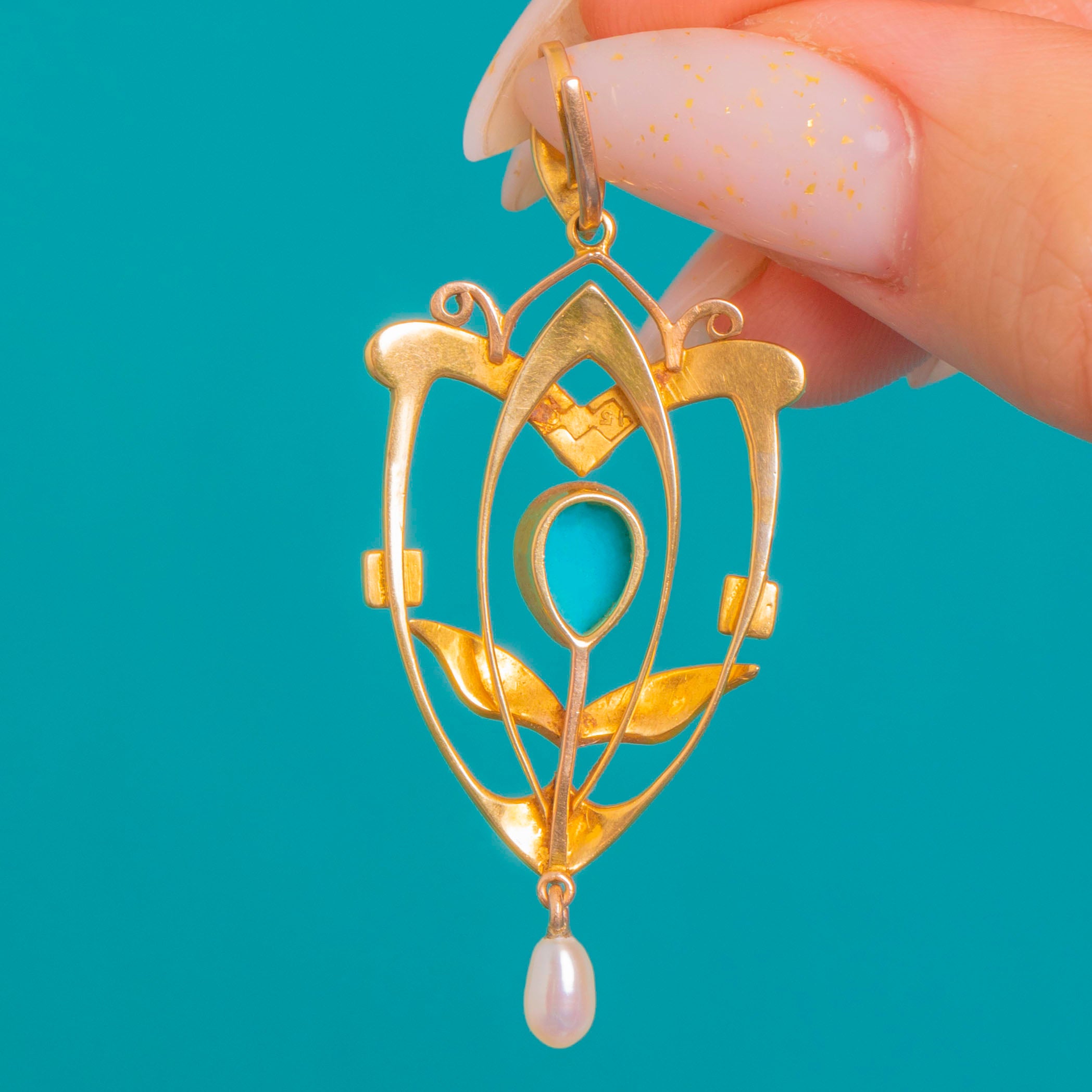 MATERIALS: Tests as 15ct Gold, Turquoise, Pearl.