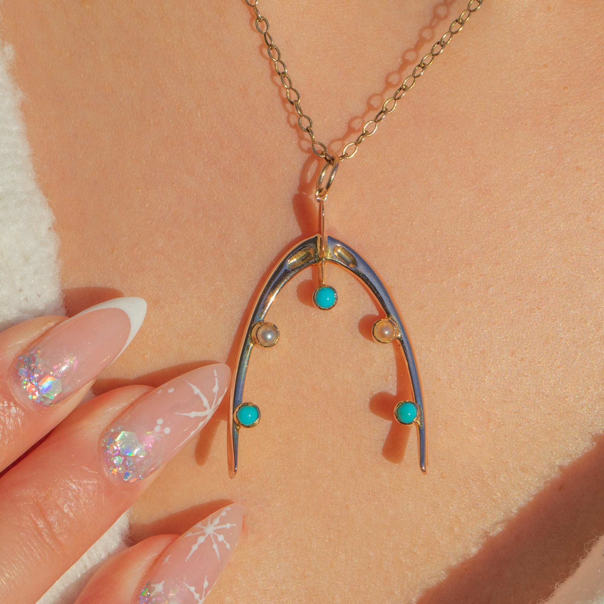 A charming Edwardian wishbone pendant crafted in rich 15ct Gold, set with petite Turquoise and a creamy Pearl along the inner arc. The open-frame silhouette feels airy and refined, adding a touch of luxury to every outfit.