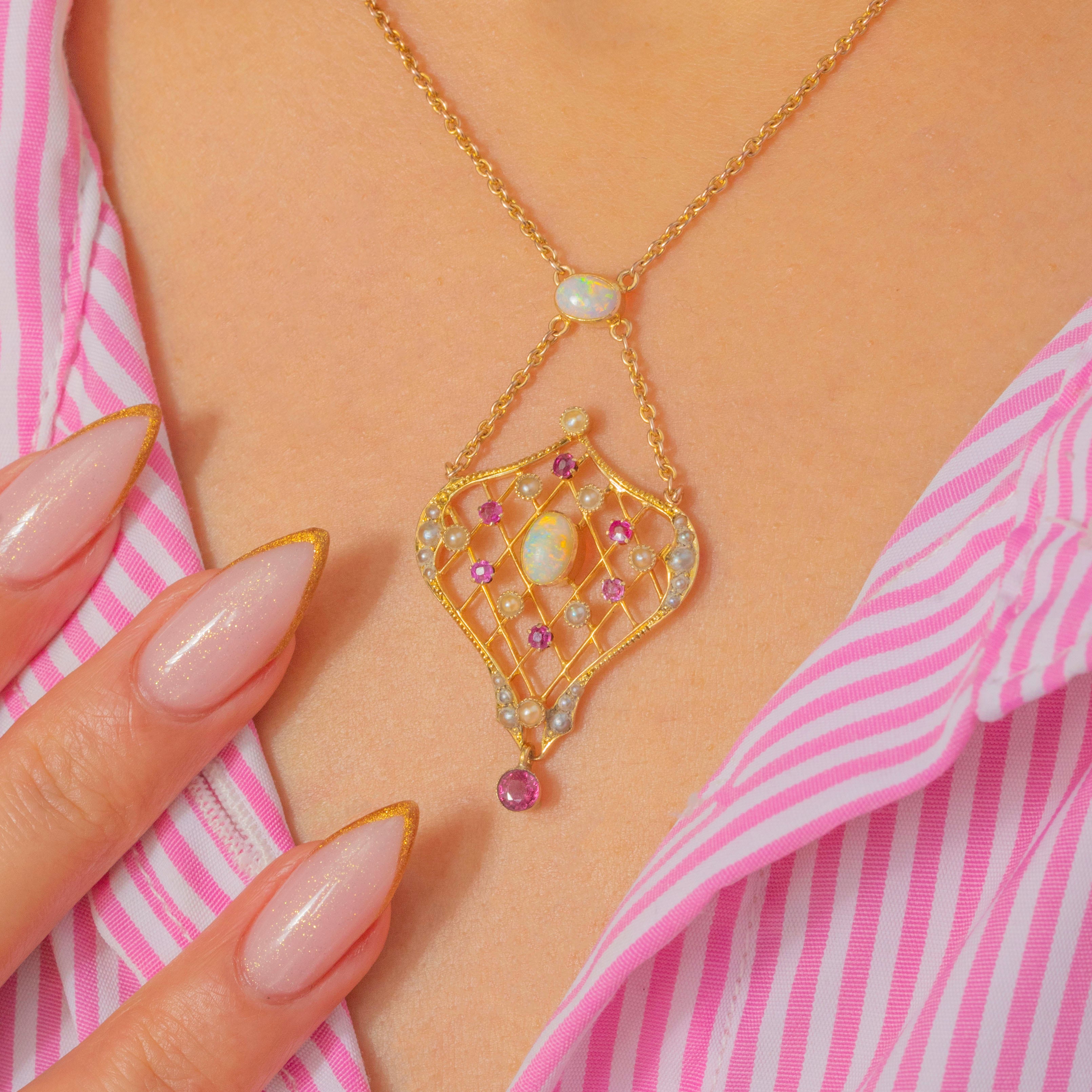 This exquisite Edwardian pendant necklace captures the grace and refinement of early 20th-century design. Crafted in rich 15ct Gold, the pendant features a delicate lattice pattern set with glowing Opals, romantic Rubies, and dainty Seed Pearls.