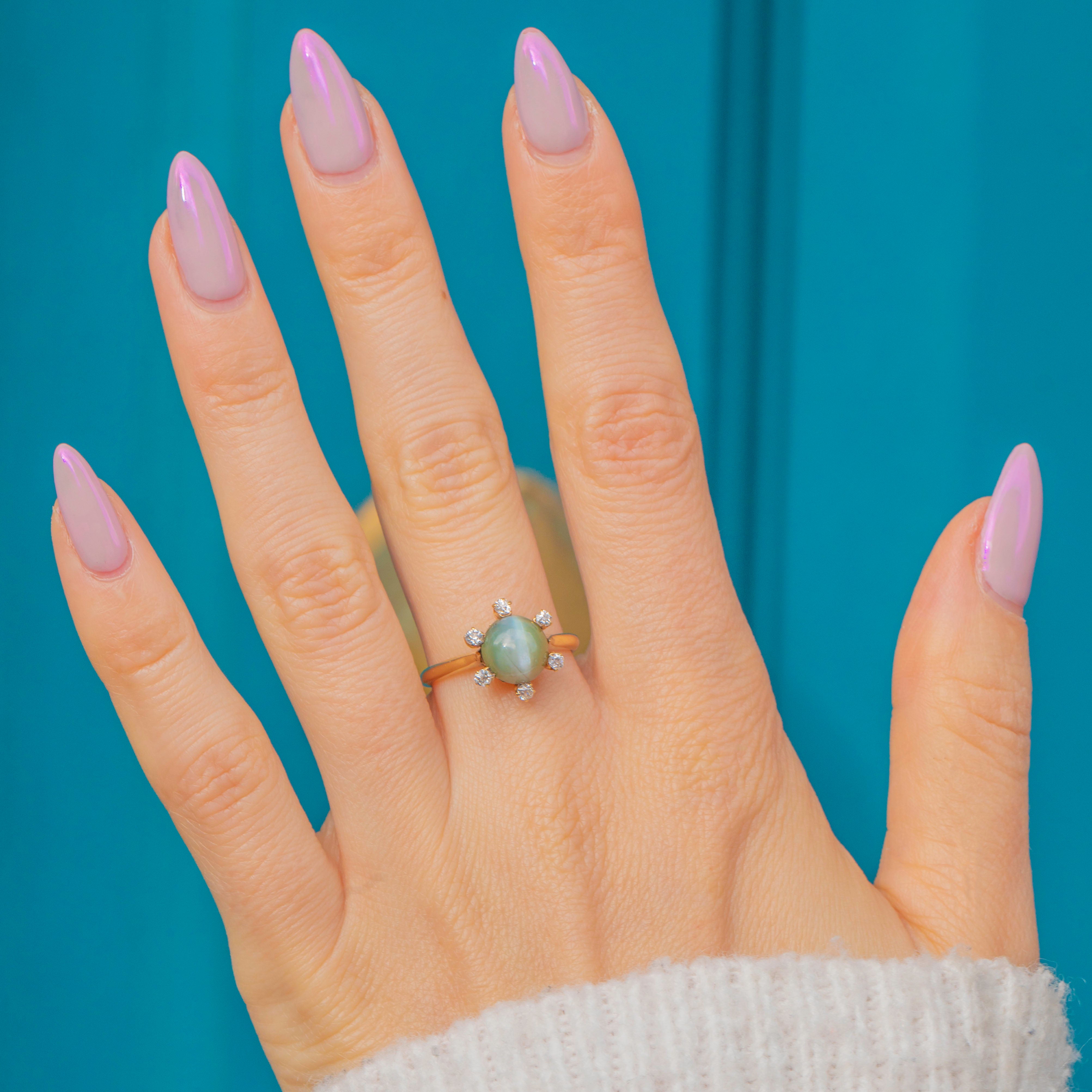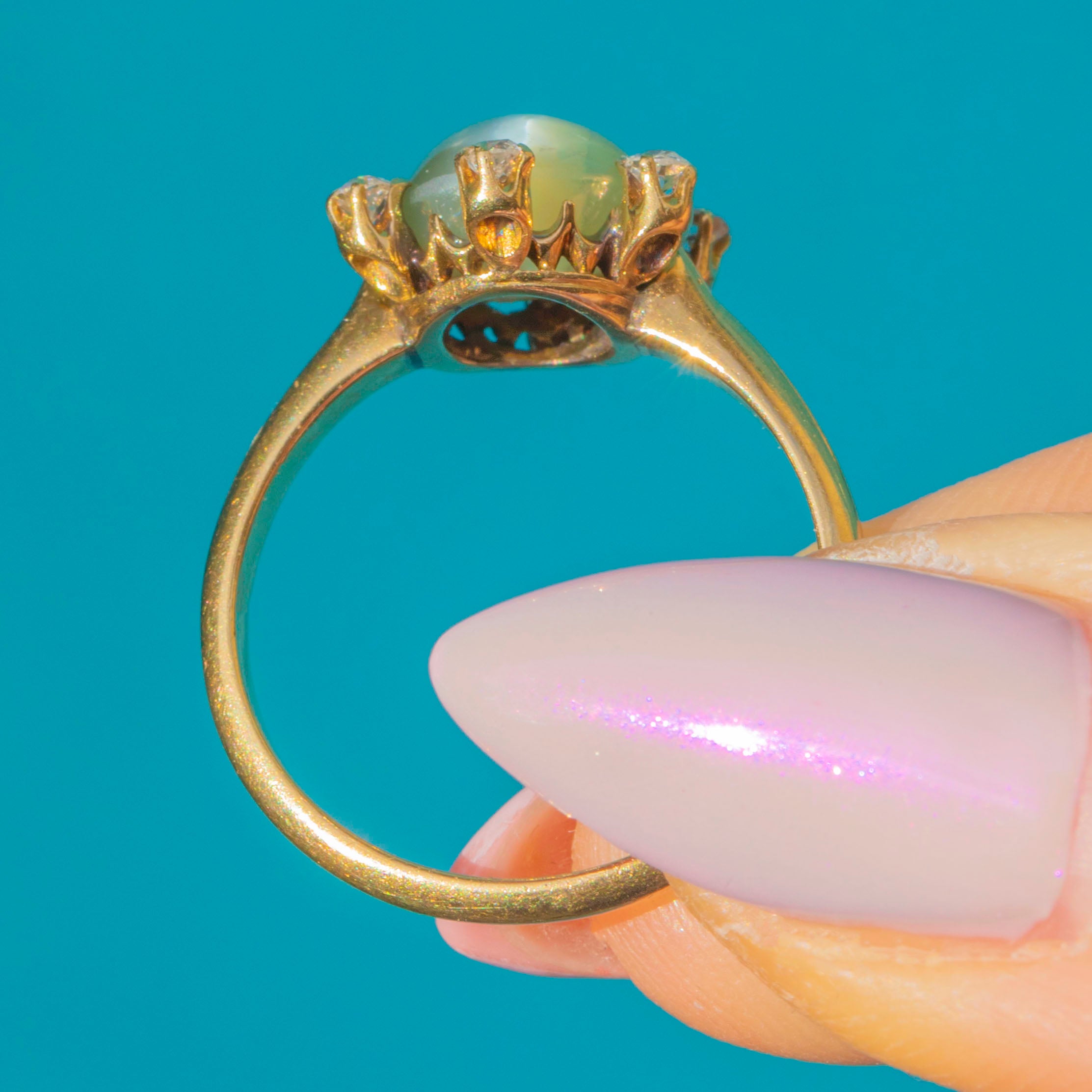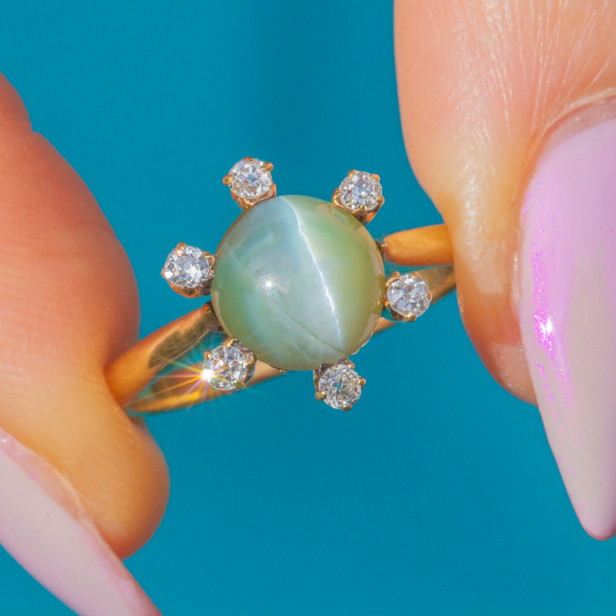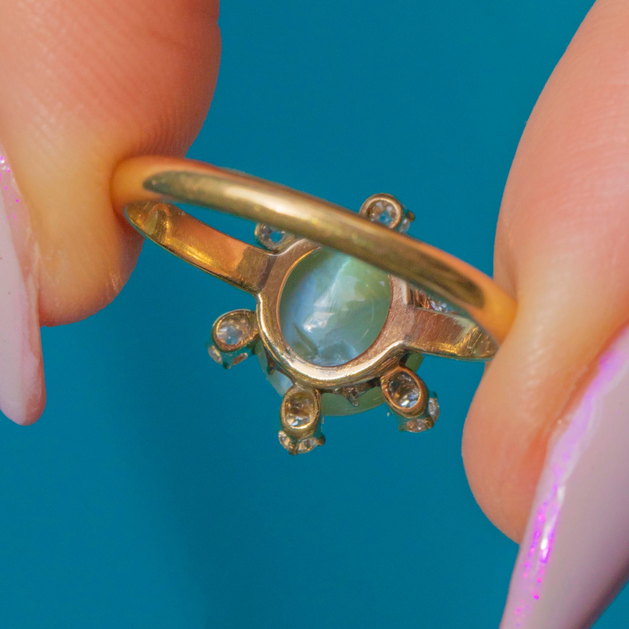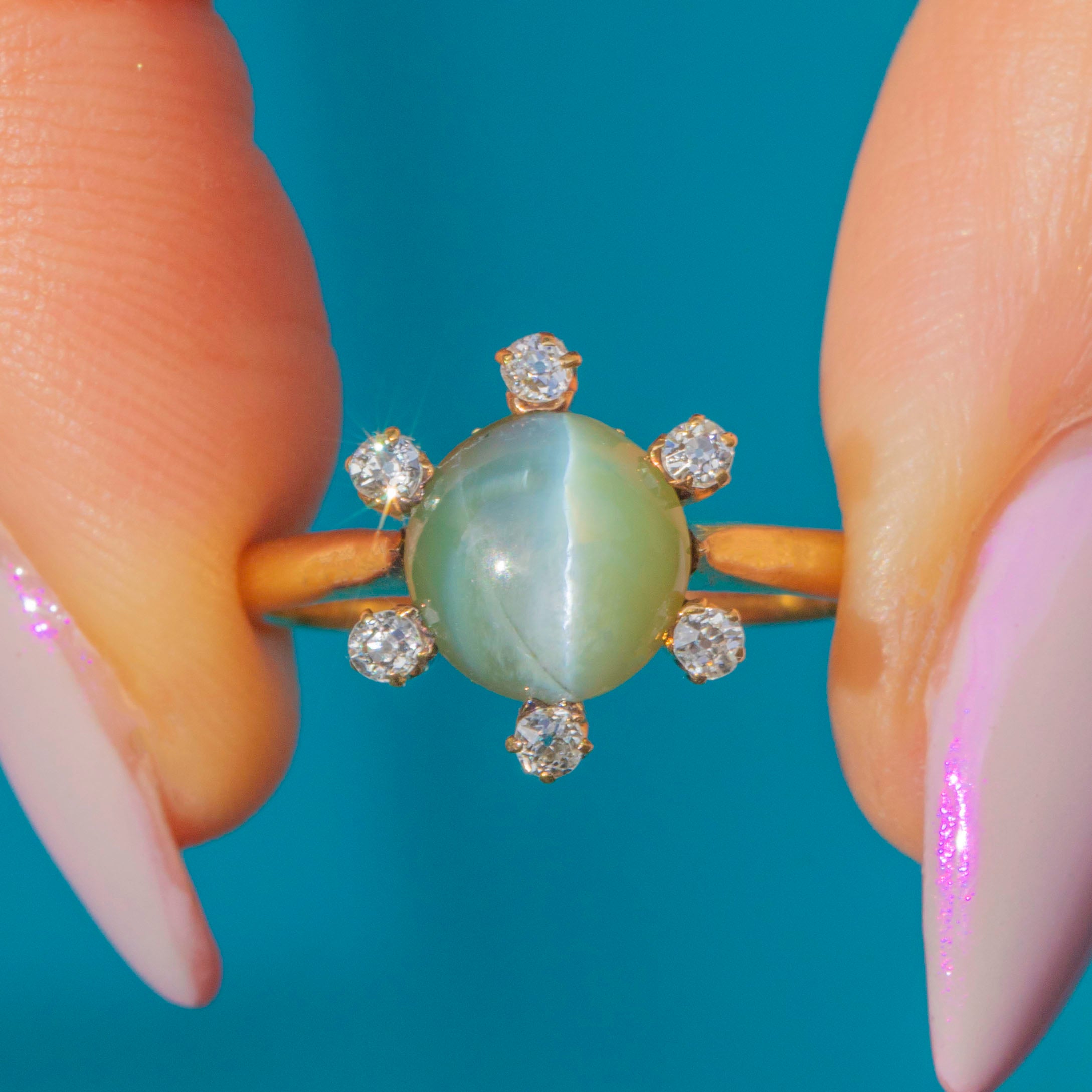 A captivating post Edwardian ring featuring a glowing Cat’s Eye Chrysoberyl with a fine natural chatoyancy, creating a mesmerising line of light that glides across the surface as it moves. The gem’s subtle green-gold hue is beautifully complemented by the warm tone of the 18ct Gold, with small twinkling Diamond accents haloing its circumference, adding delicate sparkle.