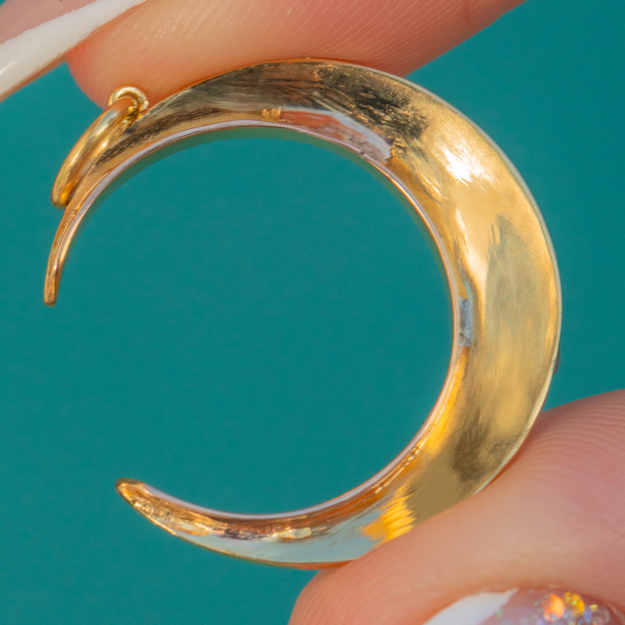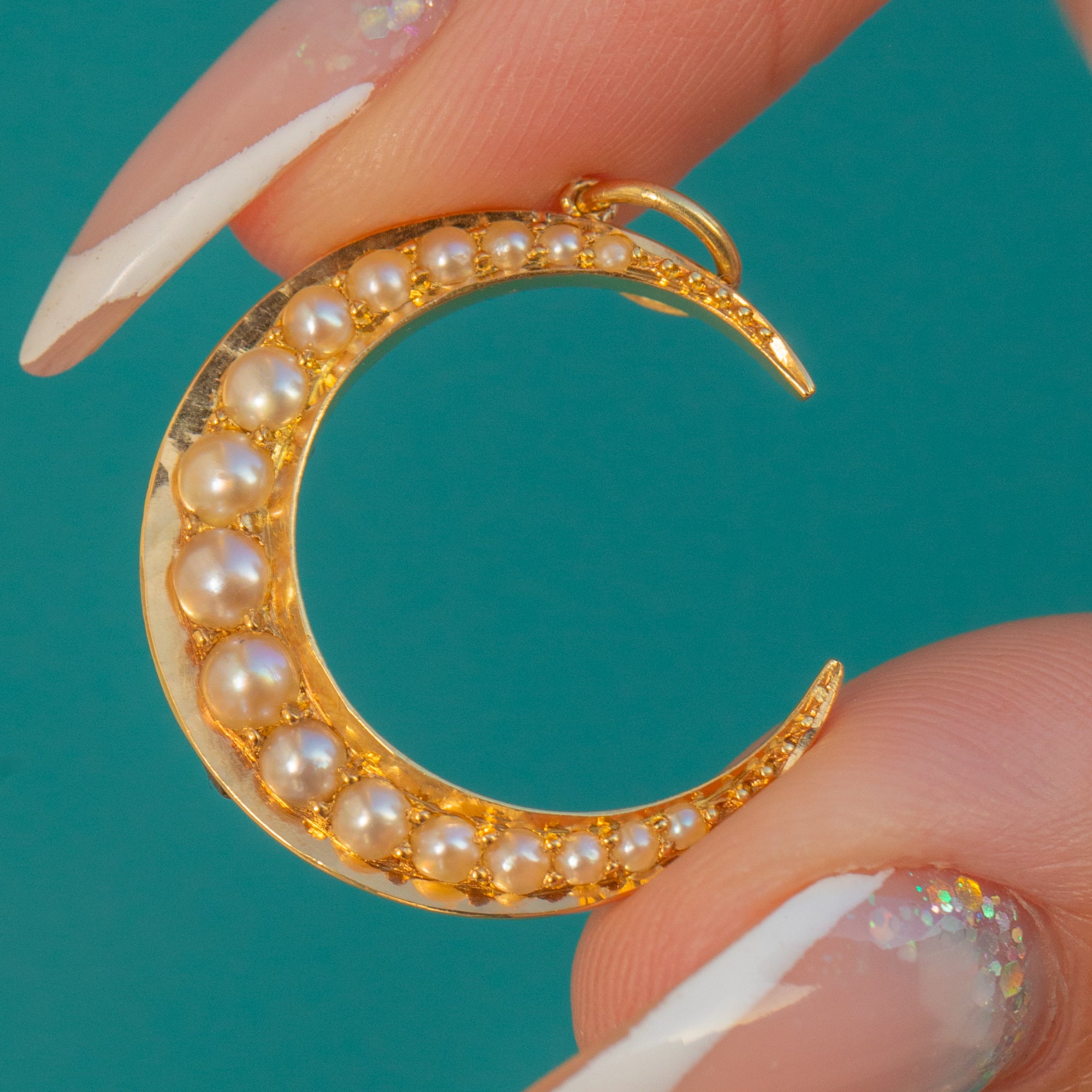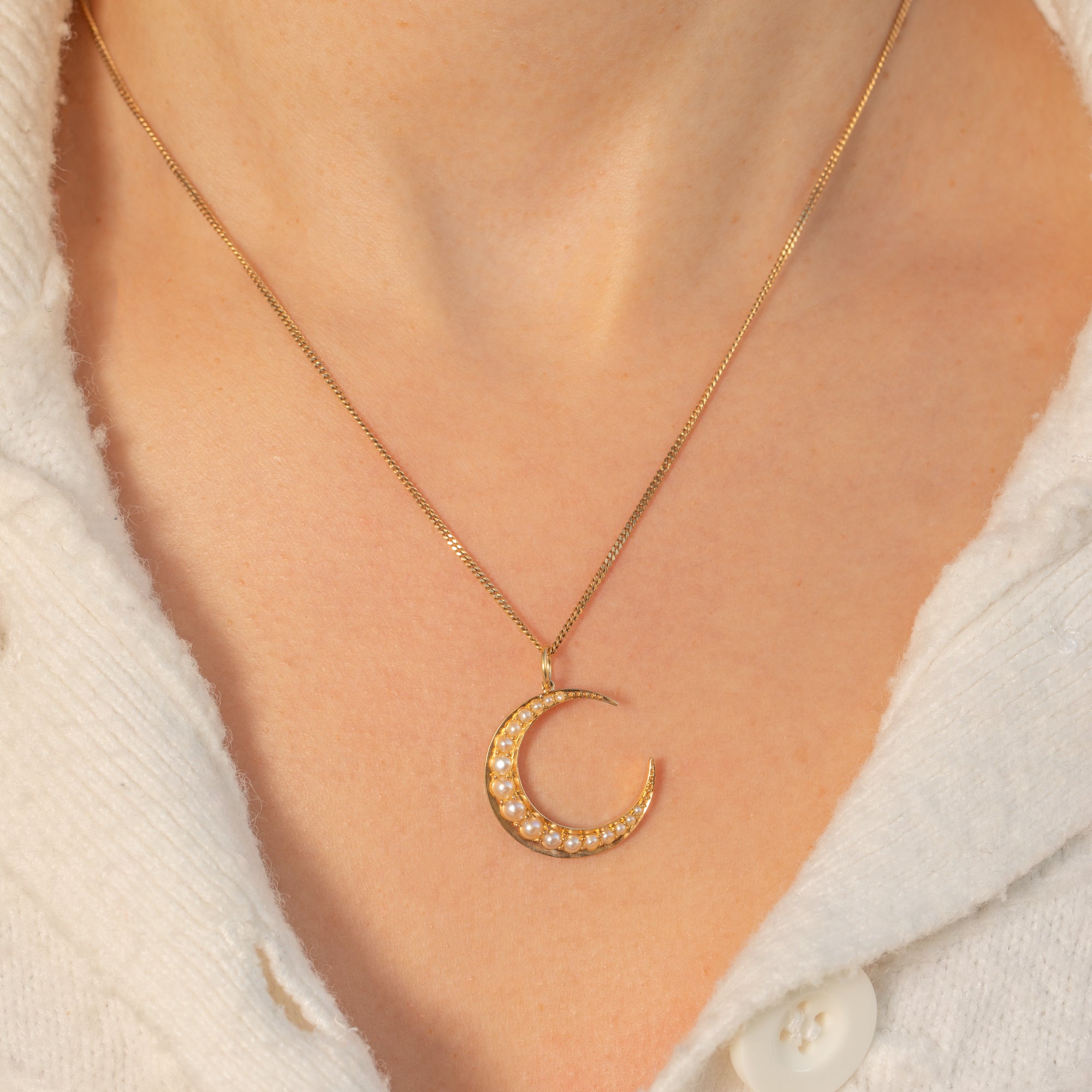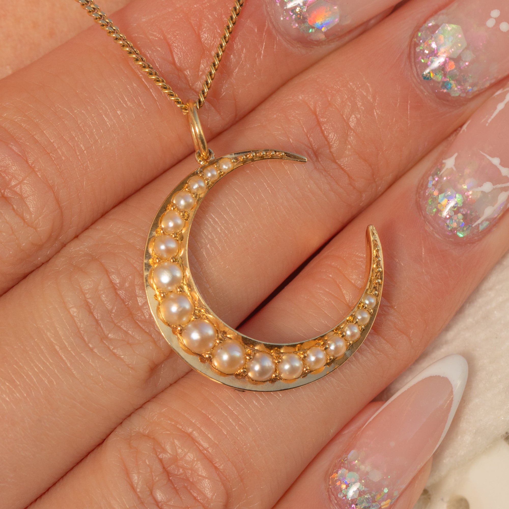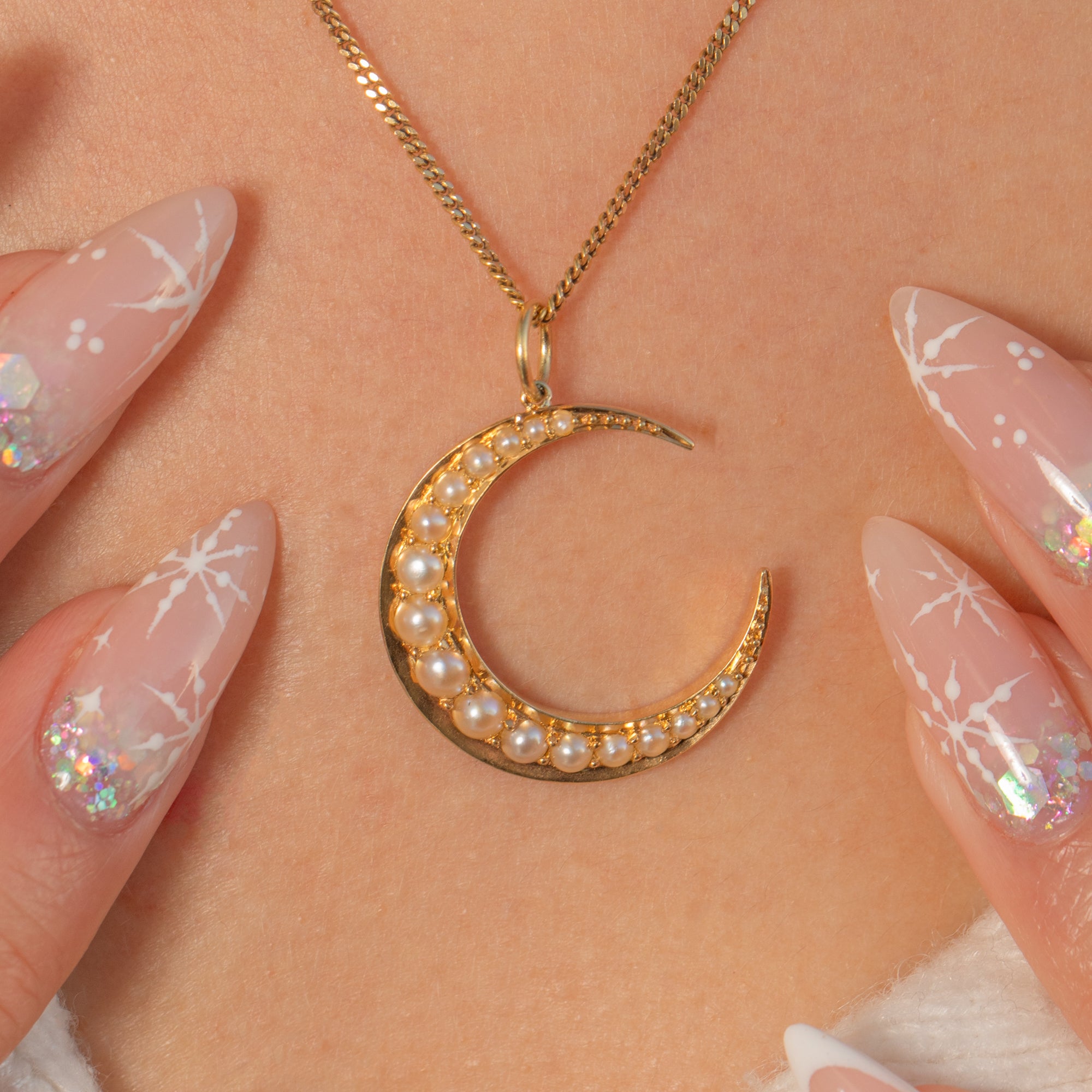 A luminous Edwardian crescent moon pendant in rich 18ct Gold, set with a graceful, graduated row of creamy Pearls that sweep from the moon’s belly to its fine, pointed tips. Each Pearl is nestled in delicate grain settings and framed by a fine beaded milgrain edge, giving the crescent a refined, lace-like texture and romantic celestial allure.