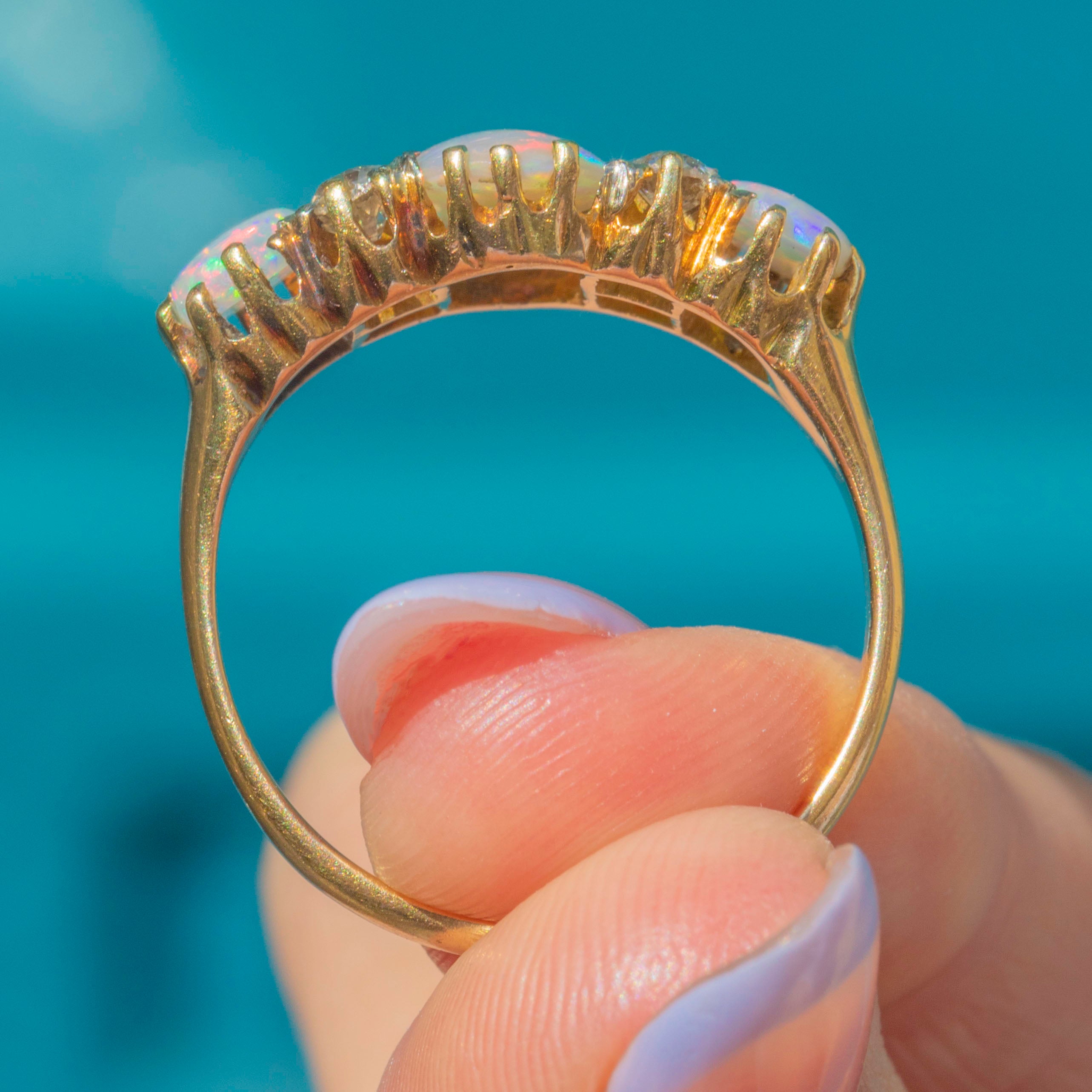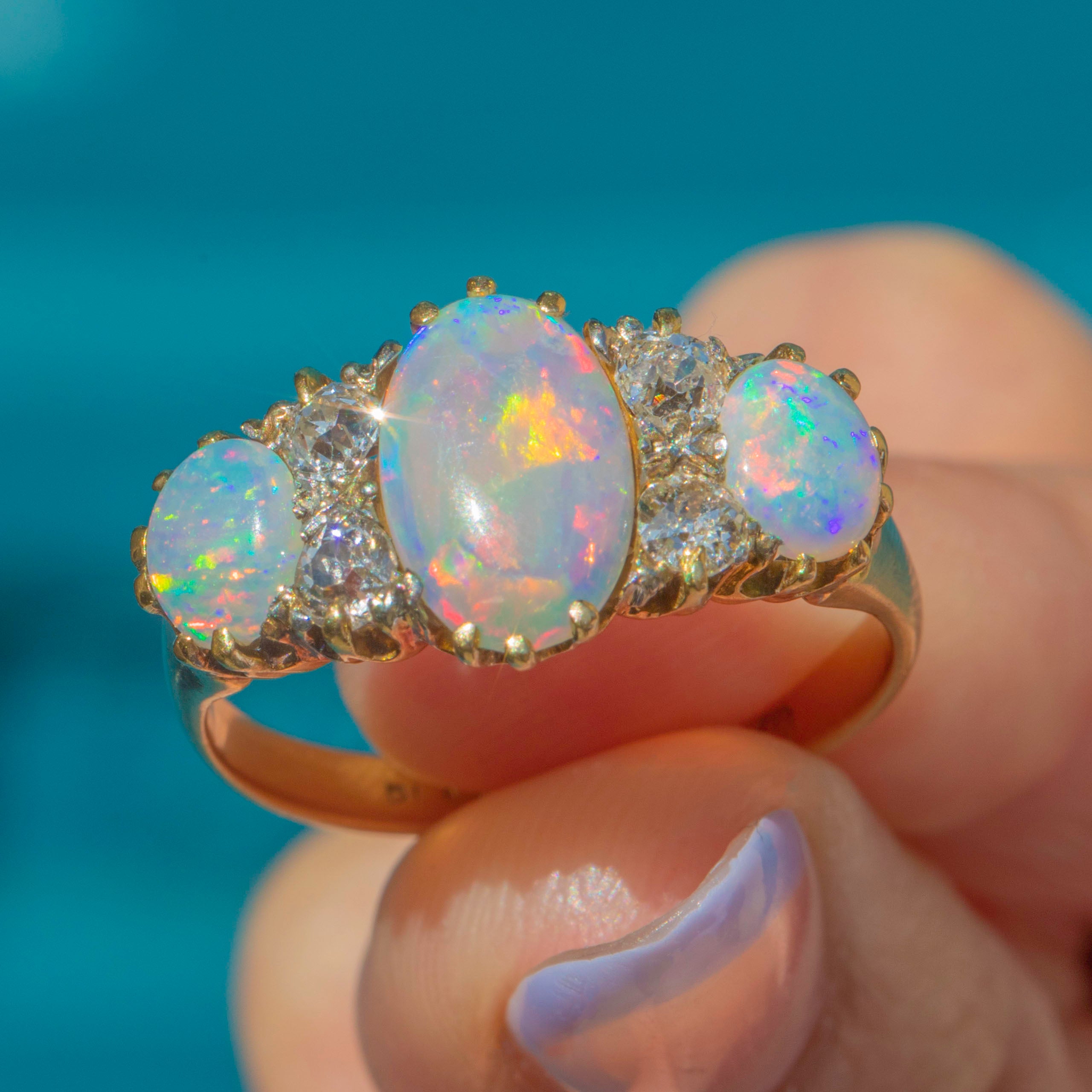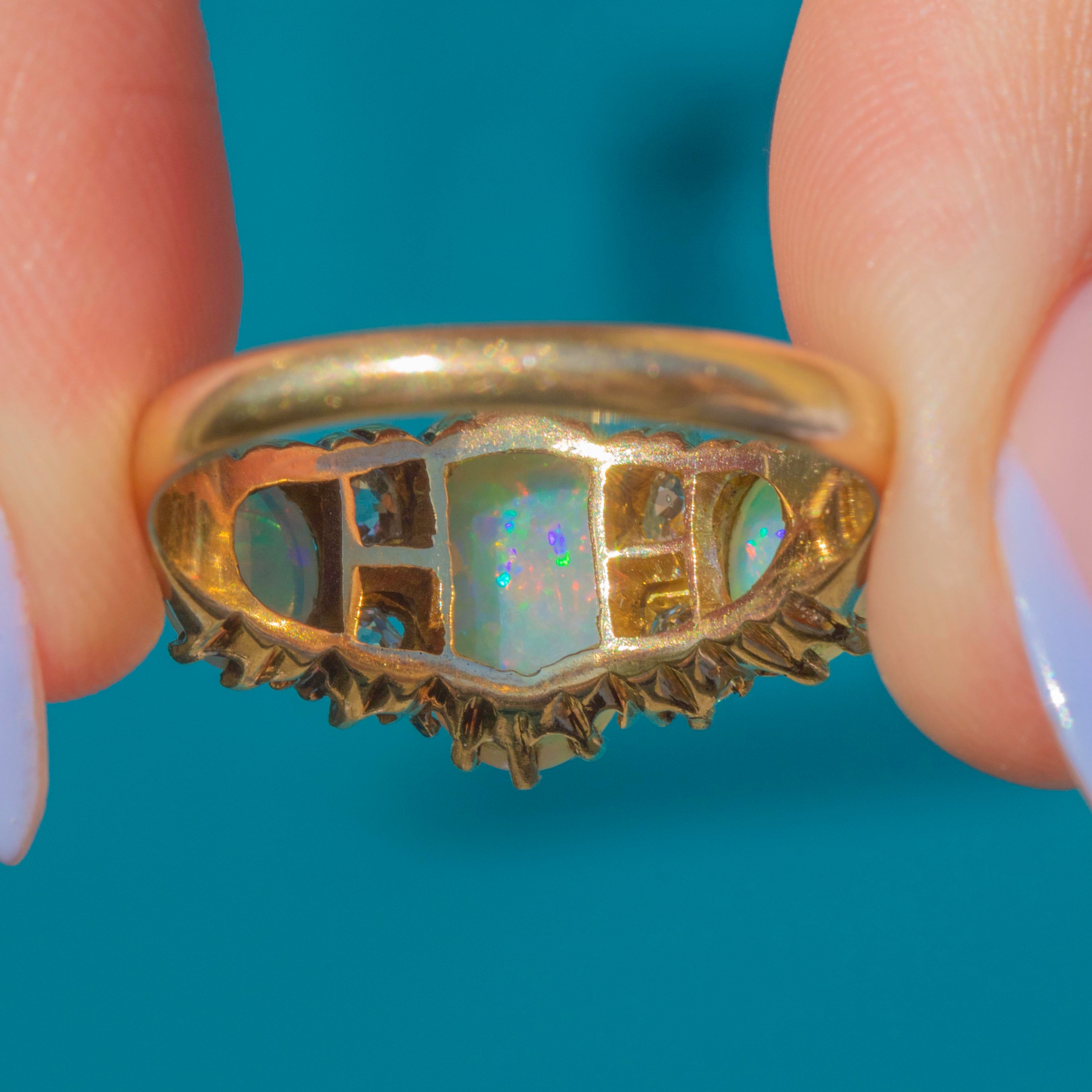 Three iridescent Opals and four scintillating Diamonds form the centre of this resplendent seven-stone ring, each boasting a magnificent radiance. The Opals, with a combined weight of 0.90ct, project a kaleidoscope of blues greens and lilac, with striking flashes of orange as they catch the light. This Edwardian ring impresses from every angle!