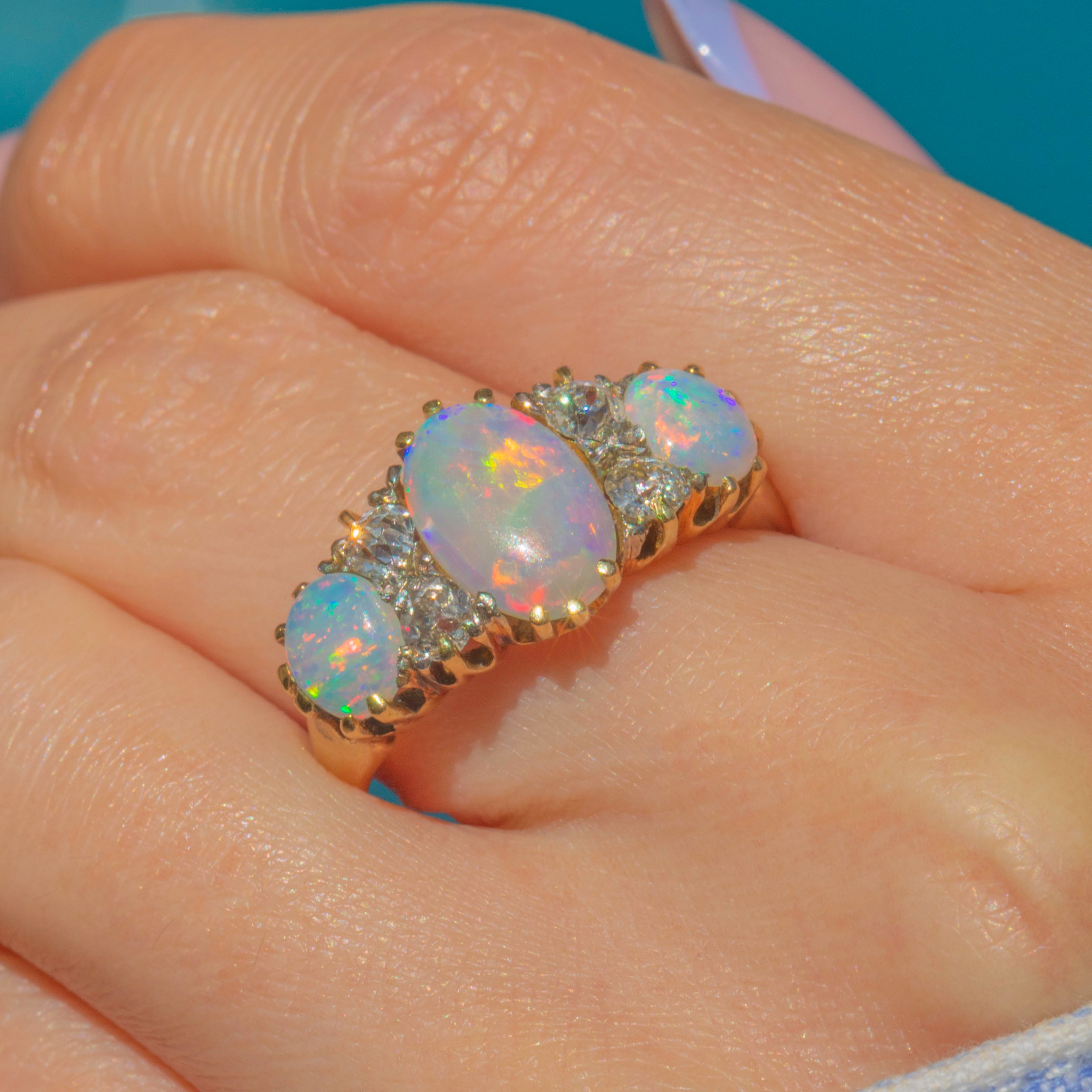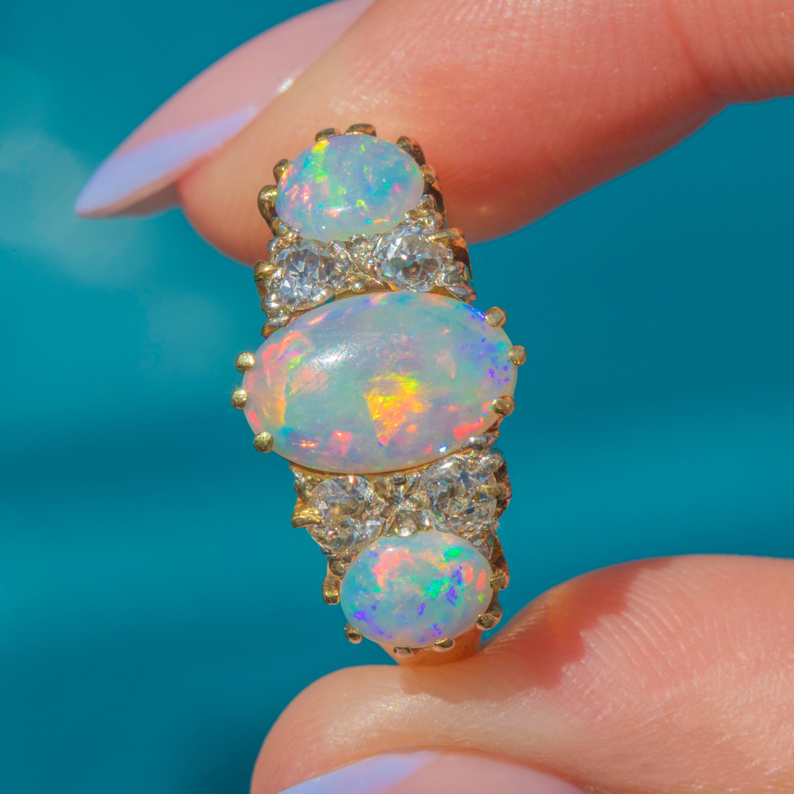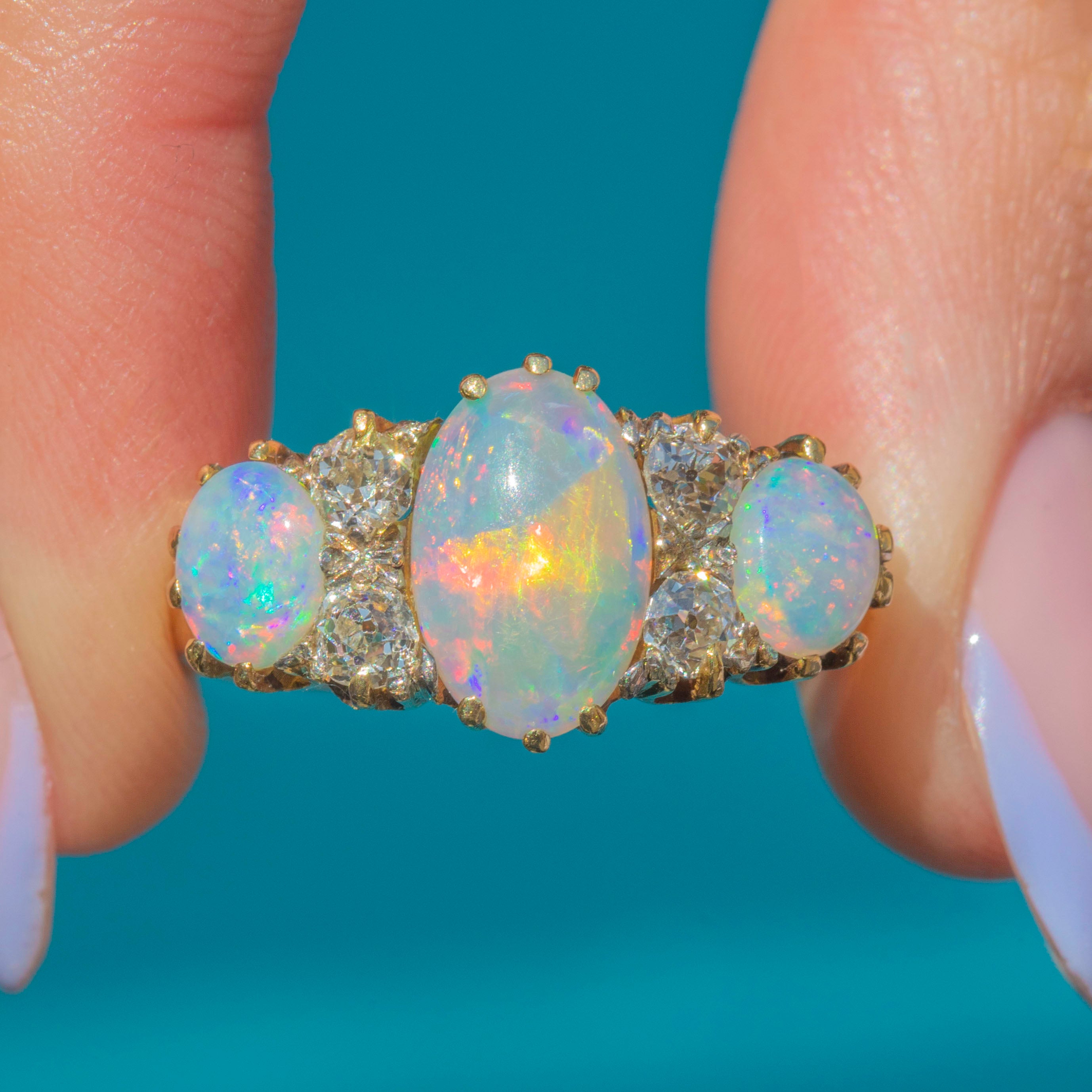 Three iridescent Opals and four scintillating Diamonds form the centre of this resplendent seven-stone ring, each boasting a magnificent radiance. The Opals, with a combined weight of 0.90ct, project a kaleidoscope of blues greens and lilac, with striking flashes of orange as they catch the light. This Edwardian ring impresses from every angle!
