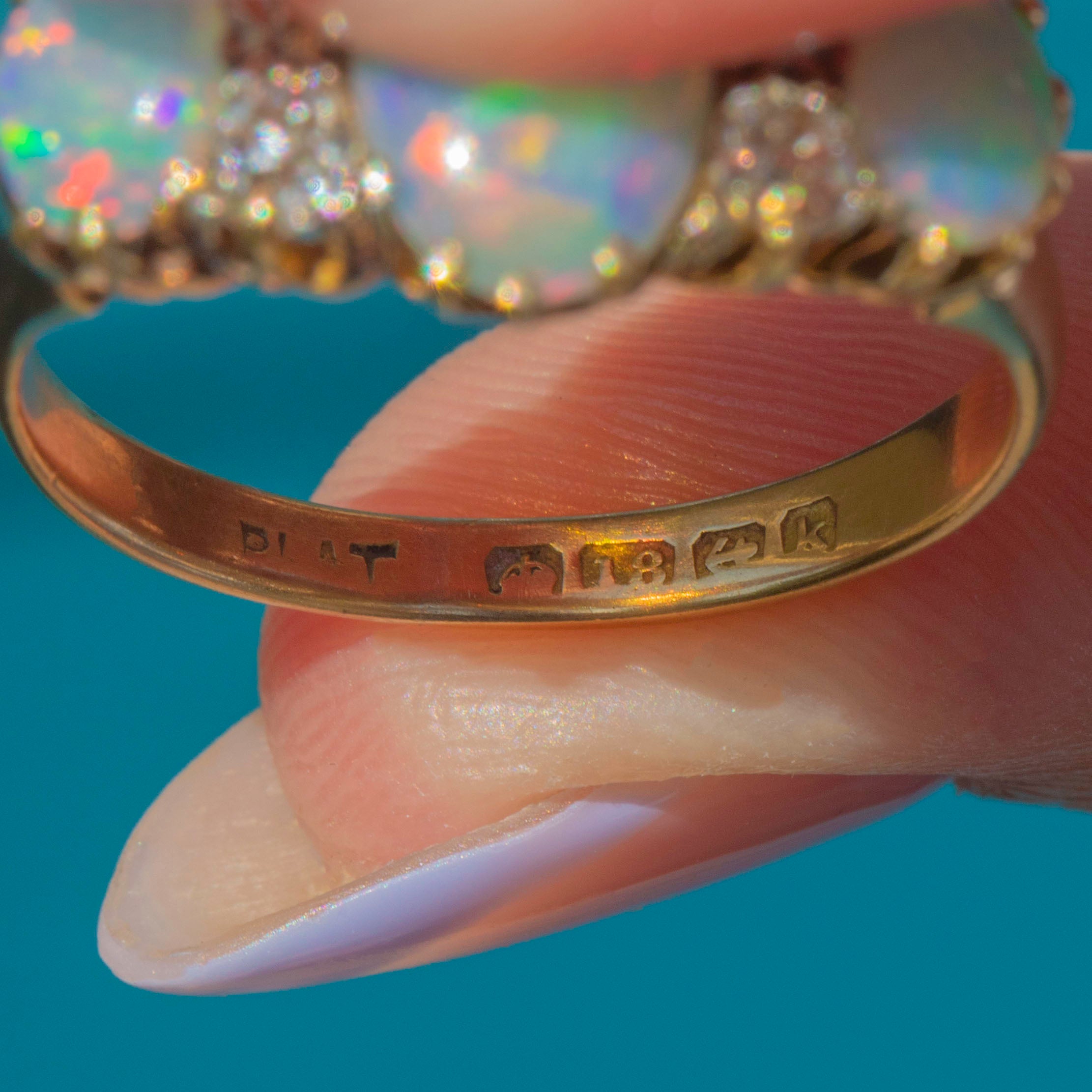EXCELLENT: This Edwardian 18ct Gold Opal Diamond ring is in excellent condition. Each gemstone is in fabulous condition and secure within its settings. There is some very minor surface wear to the inner band commensurate with age, though this cannot be seen when wearing. With little else to note, she is in brilliant condition!