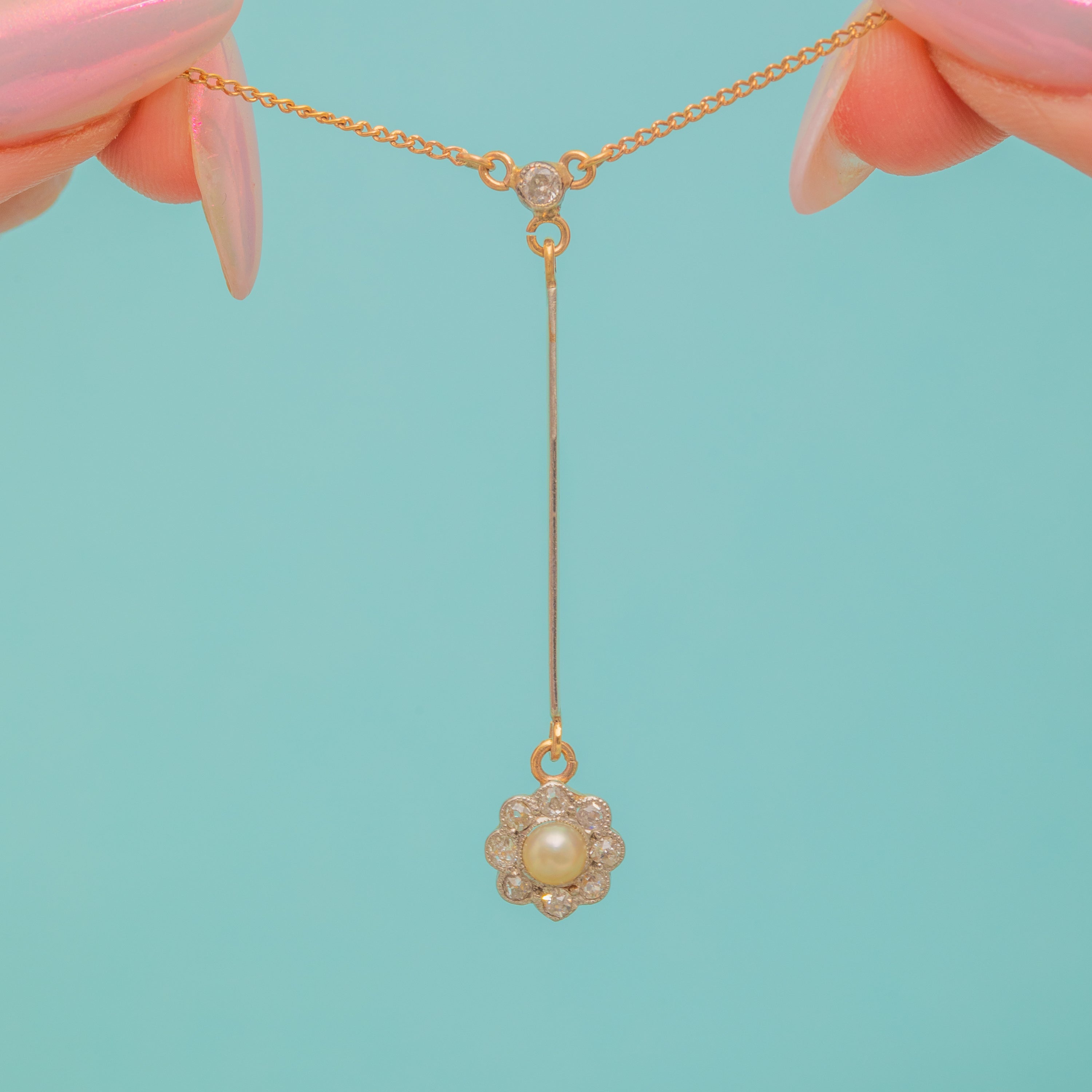 This Edwardian 18ct Gold Pearl Diamond daisy drop necklace radiates timeless elegance!