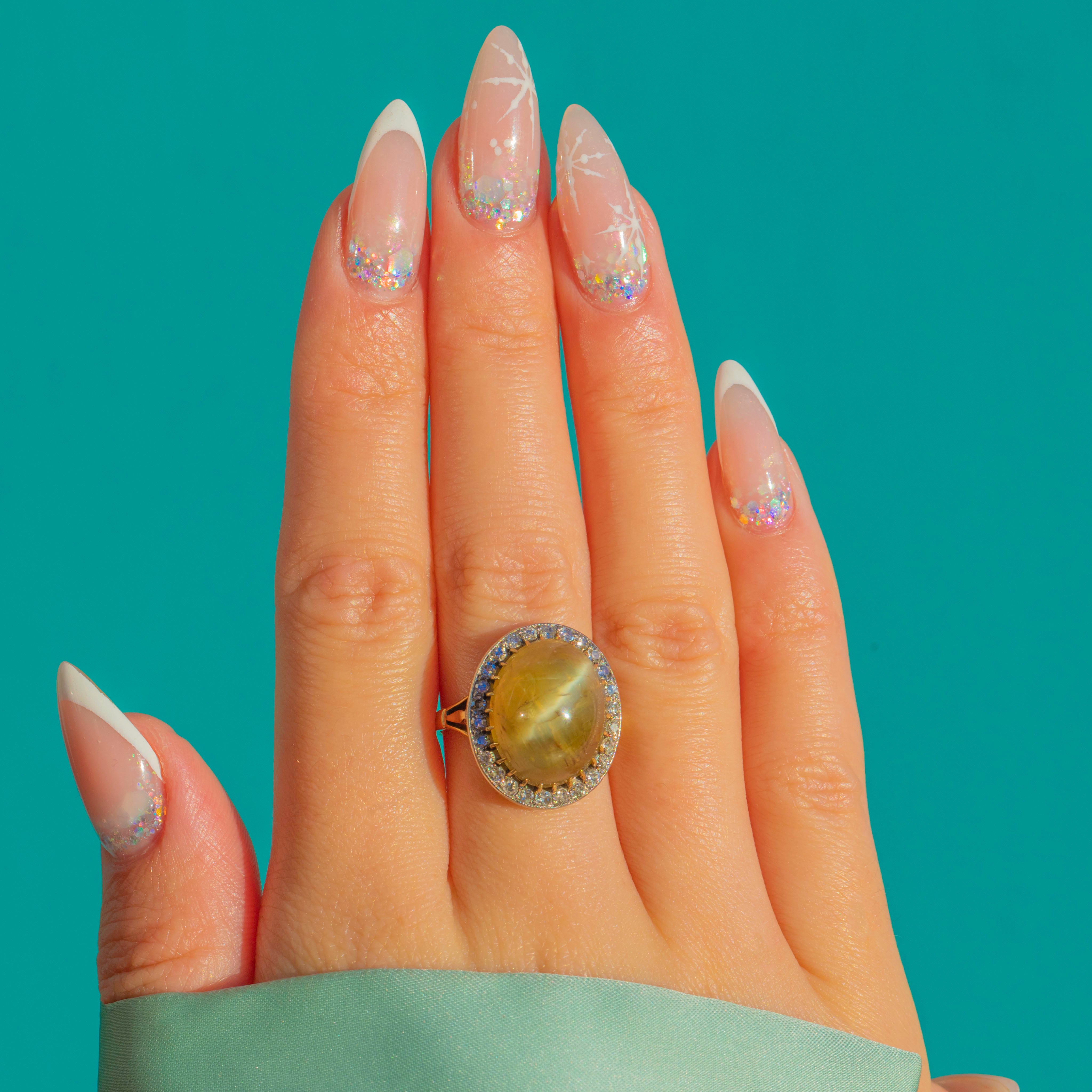 A luminous Victorian treasure, this ring centres a high-domed 9.50ct sugarloaf Chrysoberyl with a distinct cat’s‑eye line, its yellow‑green glow framed by a sparkling halo of Diamonds. The two‑tone construction is quintessentially refined, with a white Platinum head for crisp brilliance, set atop an 18ct Gold shank with elegant split shoulders and a pierced gallery for light and lift.