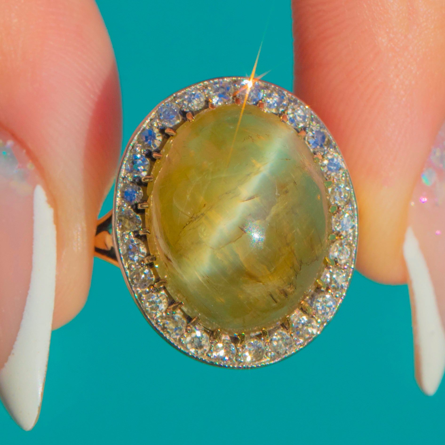 Victorian 18ct Gold & Platinum Cat's Eye Chrysoberyl Diamond Halo Ring Item added