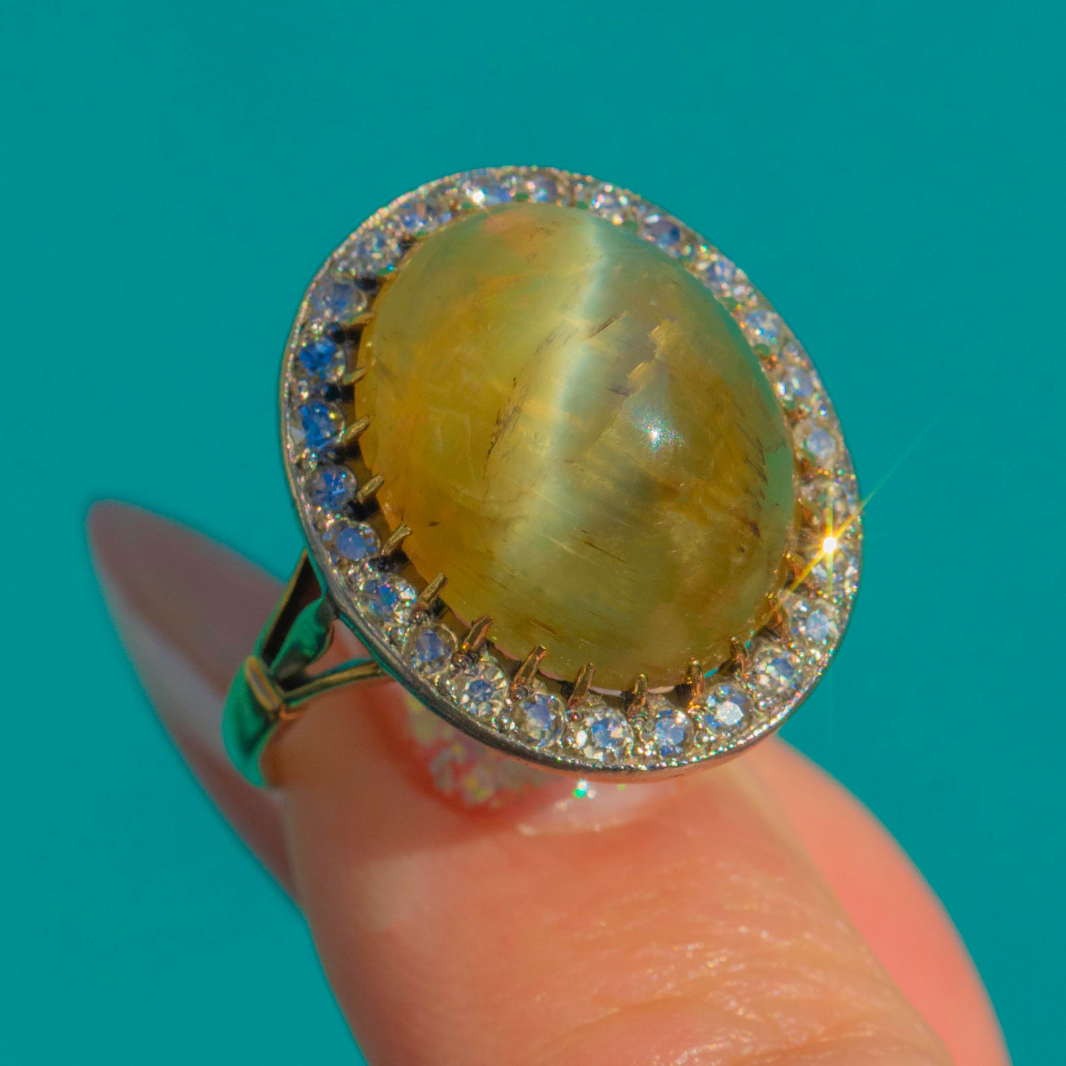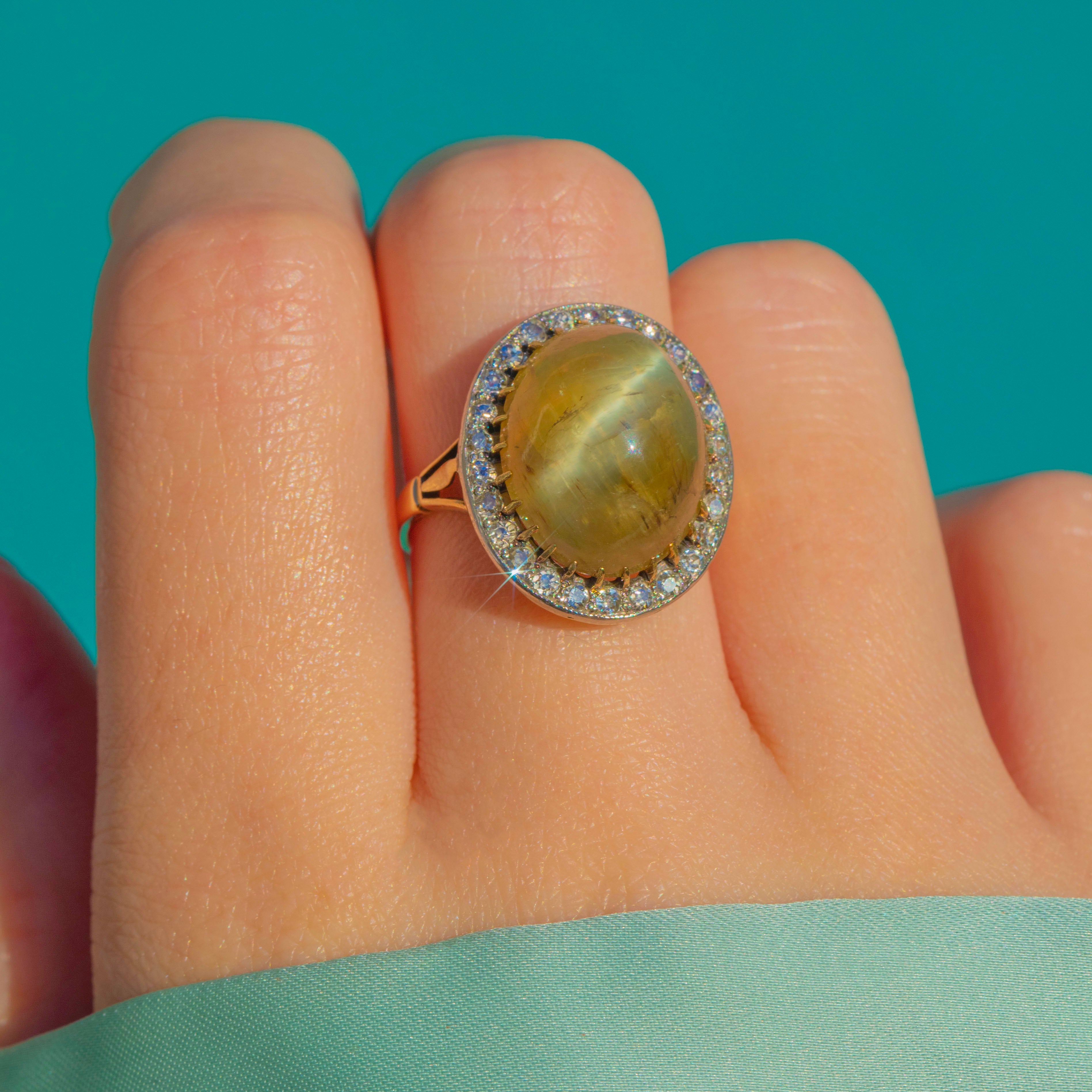 Victorian 18ct Gold & Platinum Cat's Eye Chrysoberyl Diamond Halo Ring