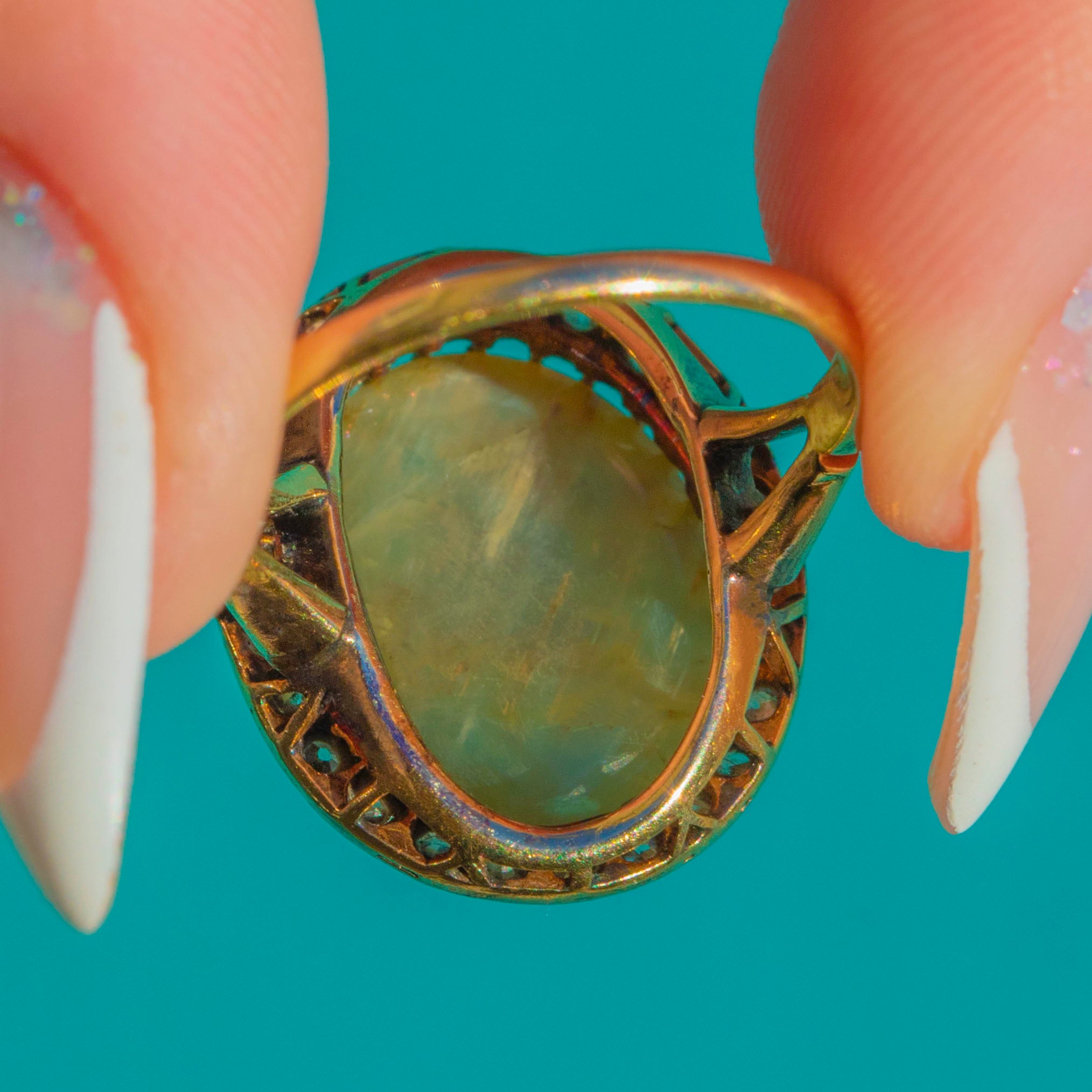Bold yet exquisitely balanced, the large, sculptural cabochon dome plays beautifully with the scintillation of the Diamond surround. An enduringly chic oval halo silhouette, crafted with that airy late Victorian finesse!