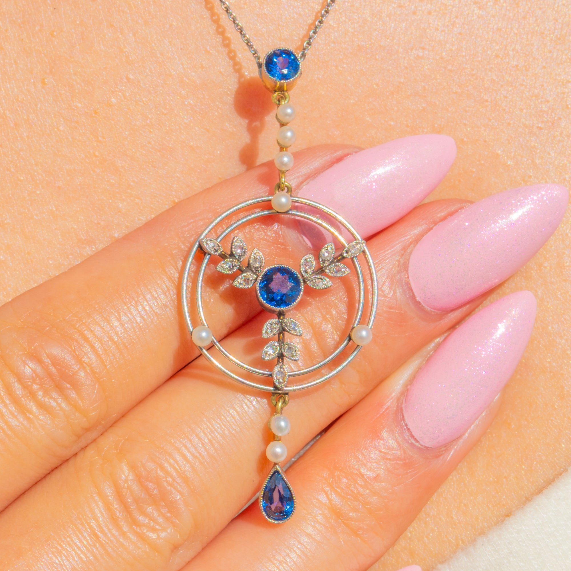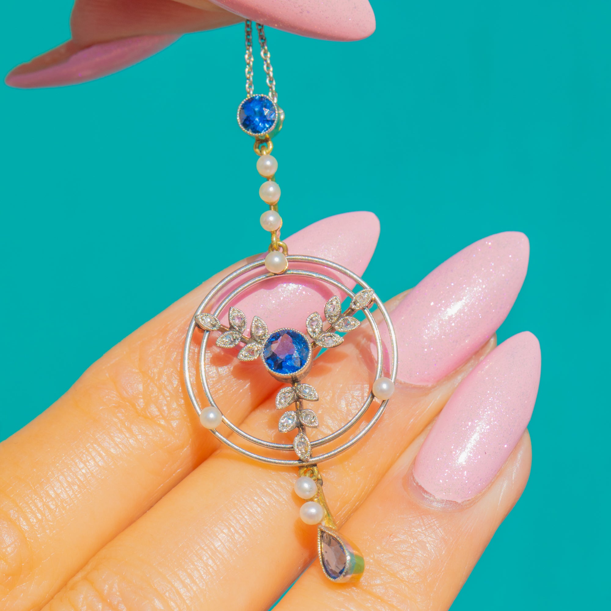 Edwardian 18ct Gold & Platinum Sapphire, Pearl & Diamond Drop Necklace