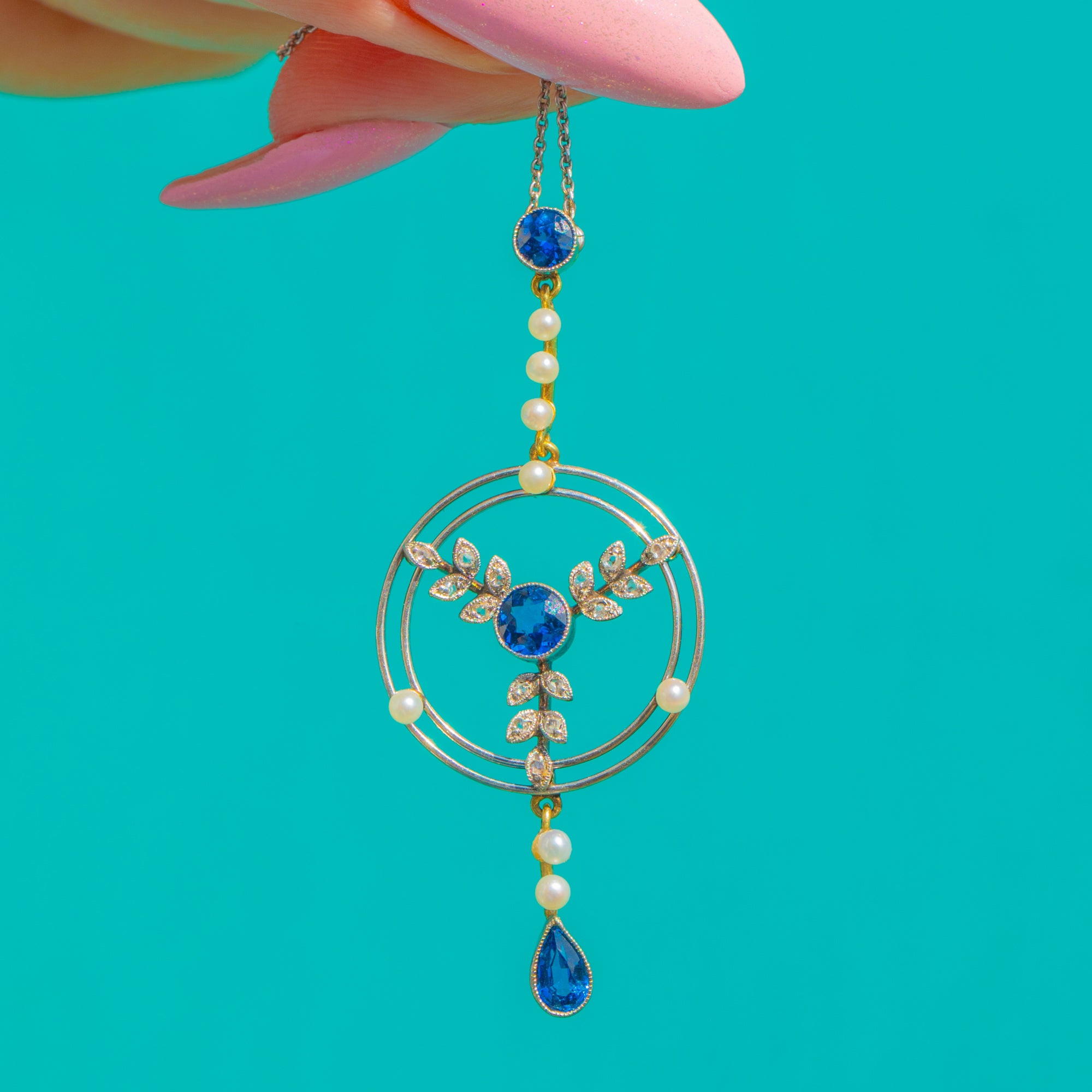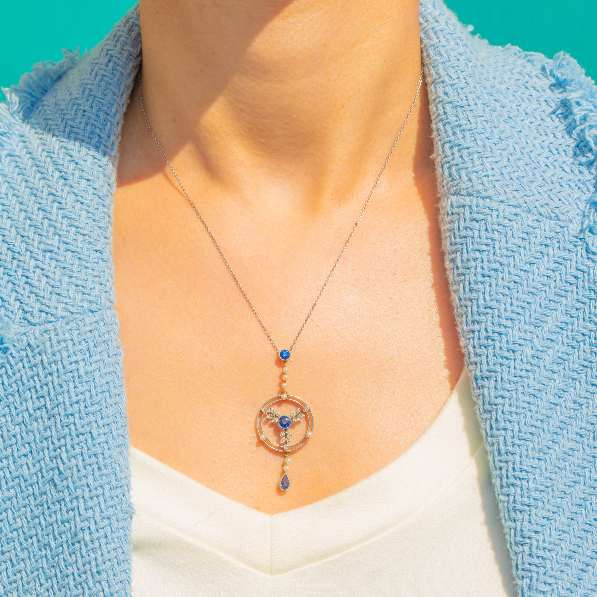 Poised and romantic, this Edwardian drop necklace pairs the cool luminosity of Platinum with the warmth of 18ct Gold. At its heart, a deep blue Sapphire sits within a concentric open roundel, leading the eye down a delicate vertical strand of Natural Pearls to a pear-shaped Sapphire drop. Lively Diamonds form graceful foliate sprays around the frame, their sparkle heightened by fine milgrain accents and refined openwork.