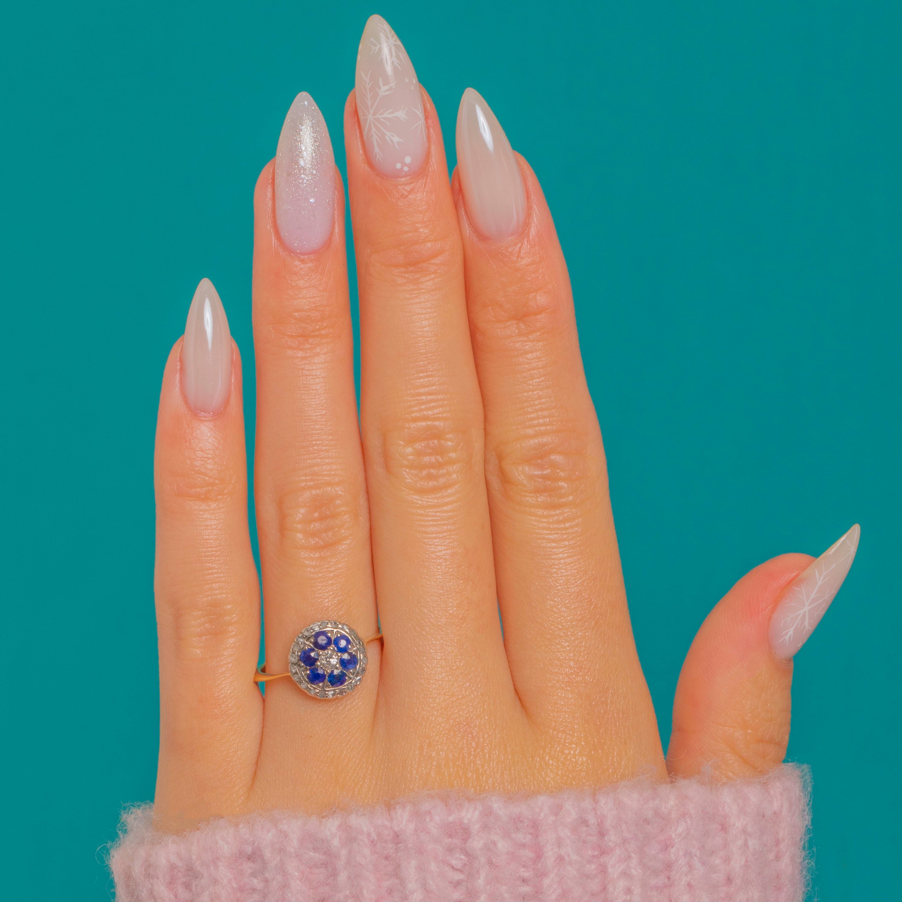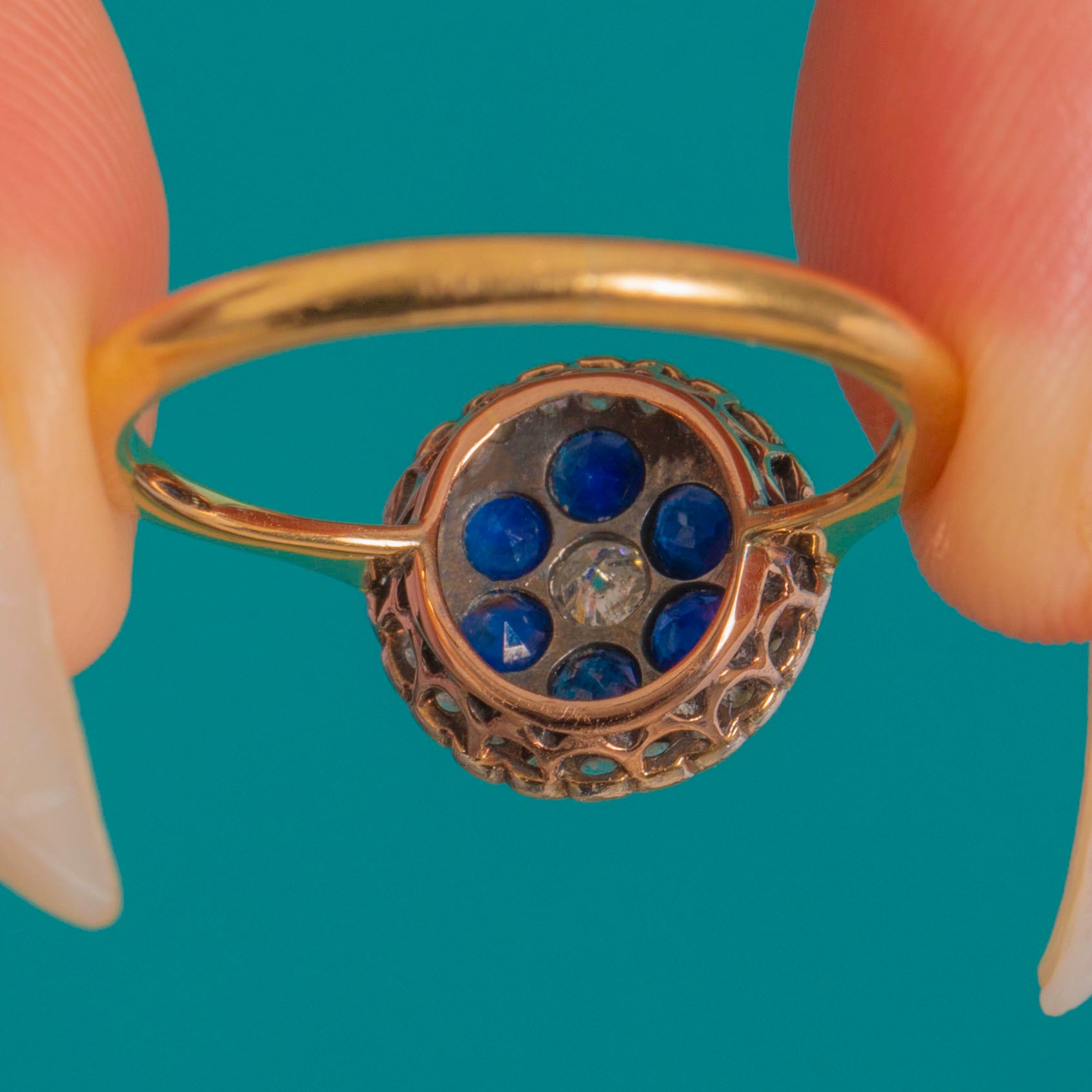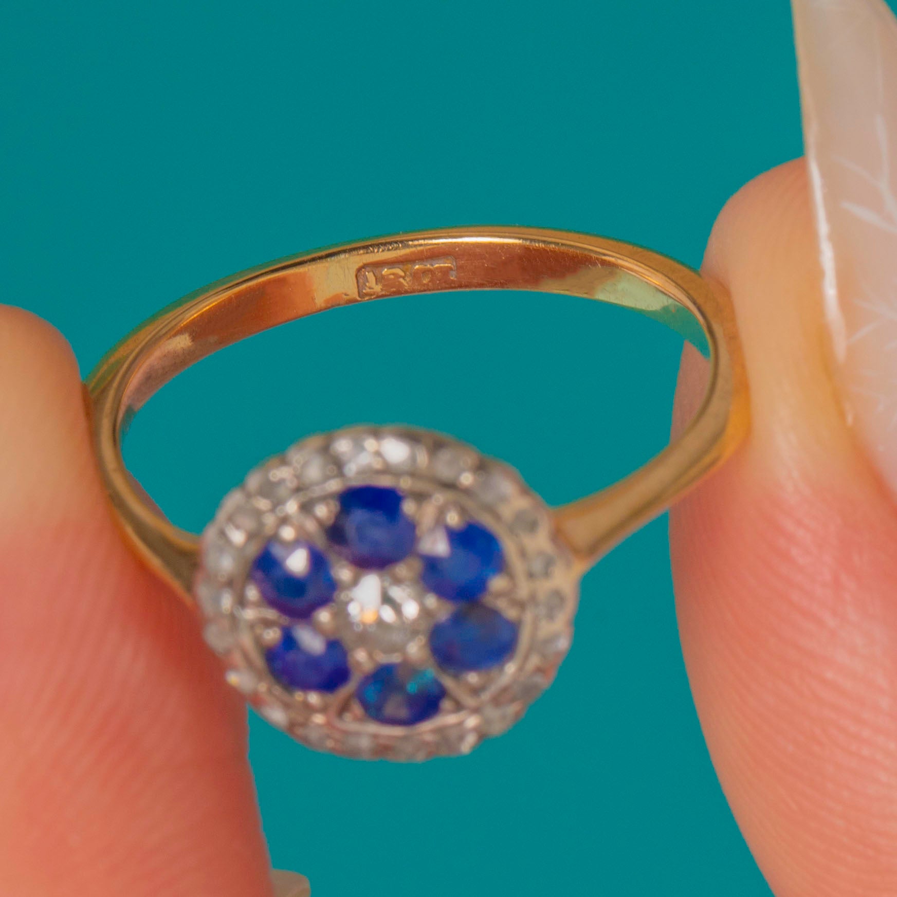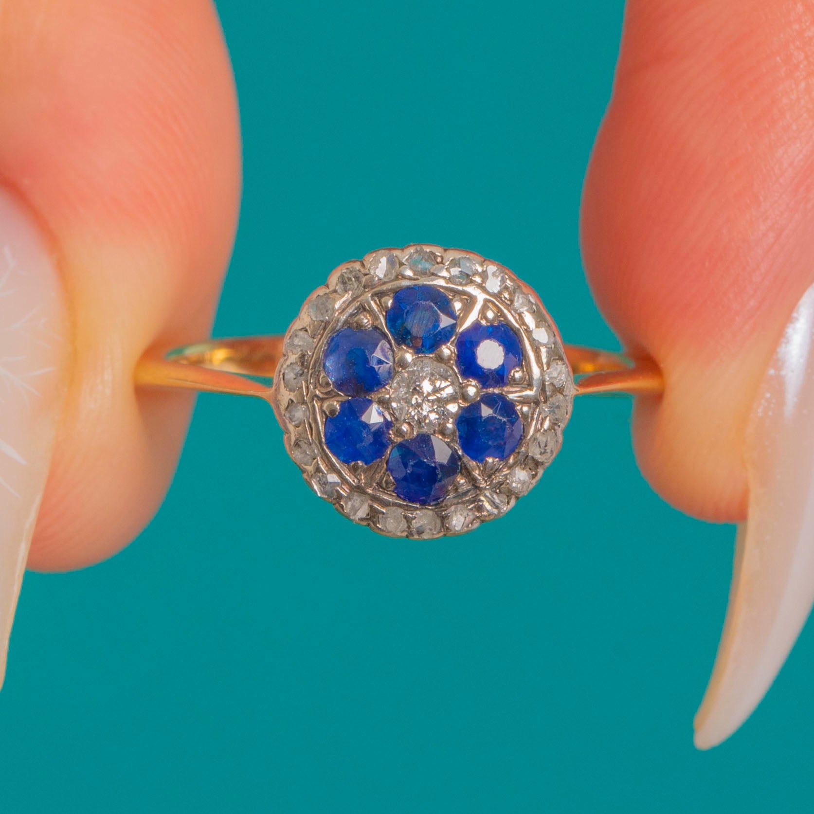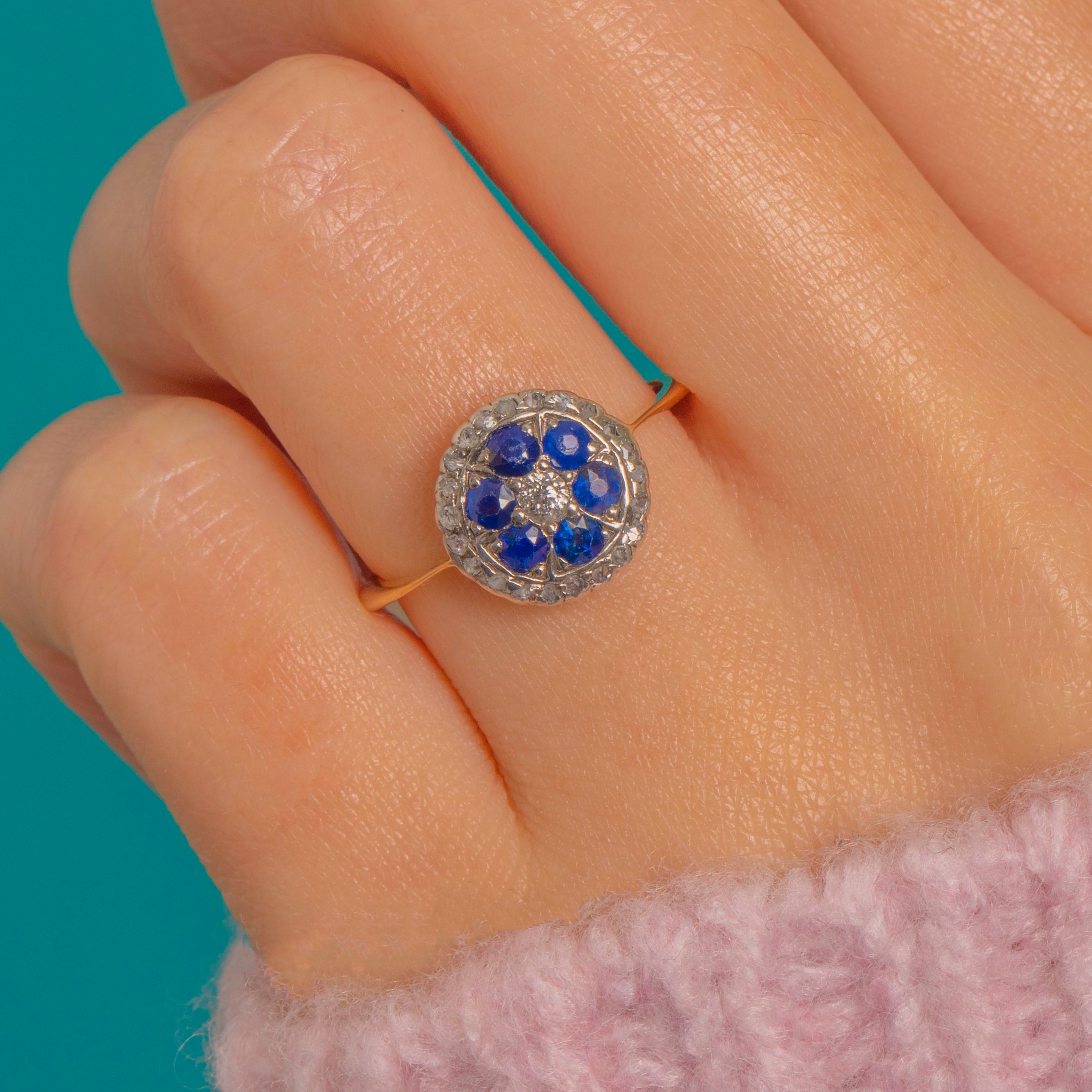 A romantic Edwardian flower cluster ring with timeless blue-and-white charm. Six vivid royal-blue Sapphires encircle a single Diamond, all set into a finely milgrained white-metal head over warm 18ct Gold. The delicate rosette sits low on the finger, its silver settings lending a bright, lace-like sparkle that beautifully frames the gemstones.