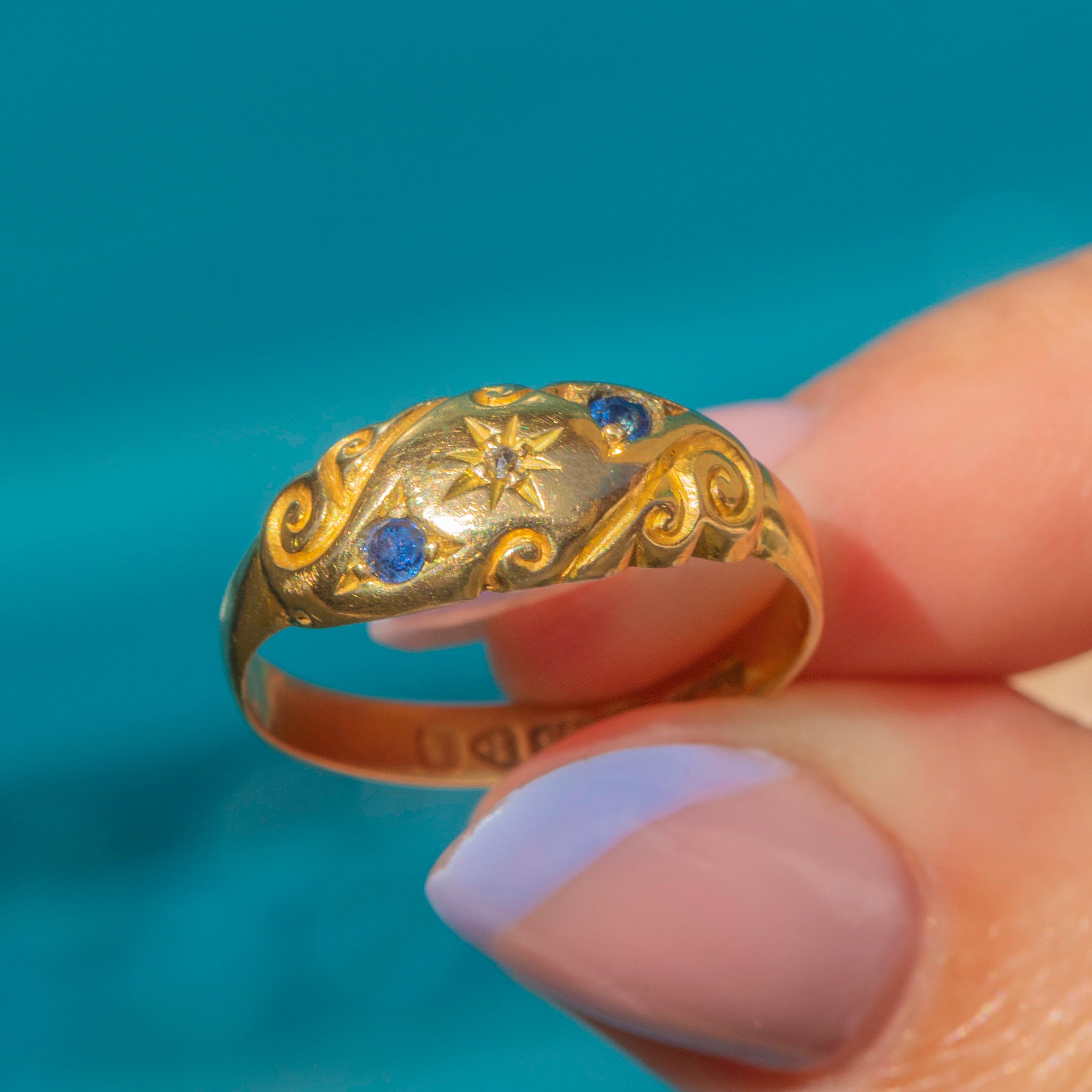 This Edwardian 18ct Gold Sapphire Diamond gypsy ring is a celestial dream! The gemstones are flush-set in distinct star settings, with whimsical engraved details curving around the trilogy to create an undeniably enchanting piece.