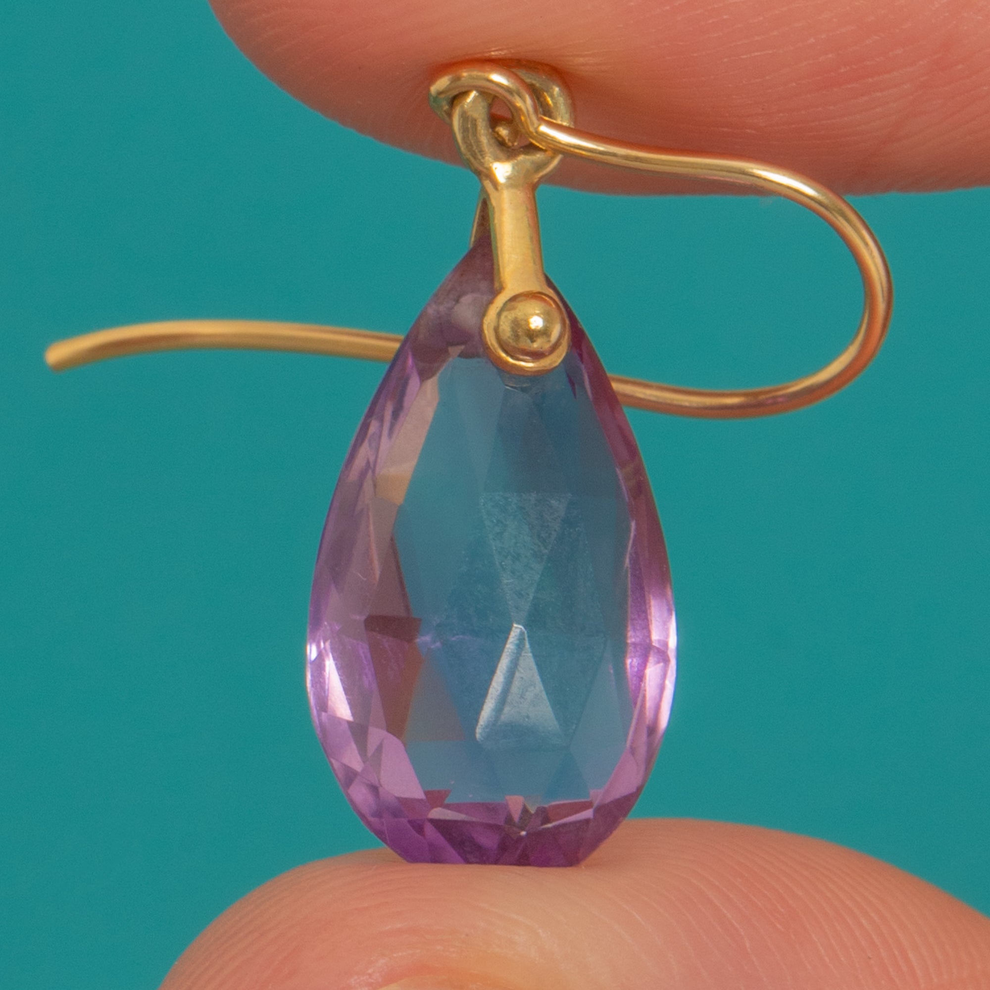 EXCELLENT: Amethysts are bright with crisp facets and only light facet-edge abrasions visible under magnification; no chips or cracks observed. The 9ct Gold hooks and fittings are secure with minor surface wear commensurate with age. No visible repairs or alterations; the pair has been well cared for.