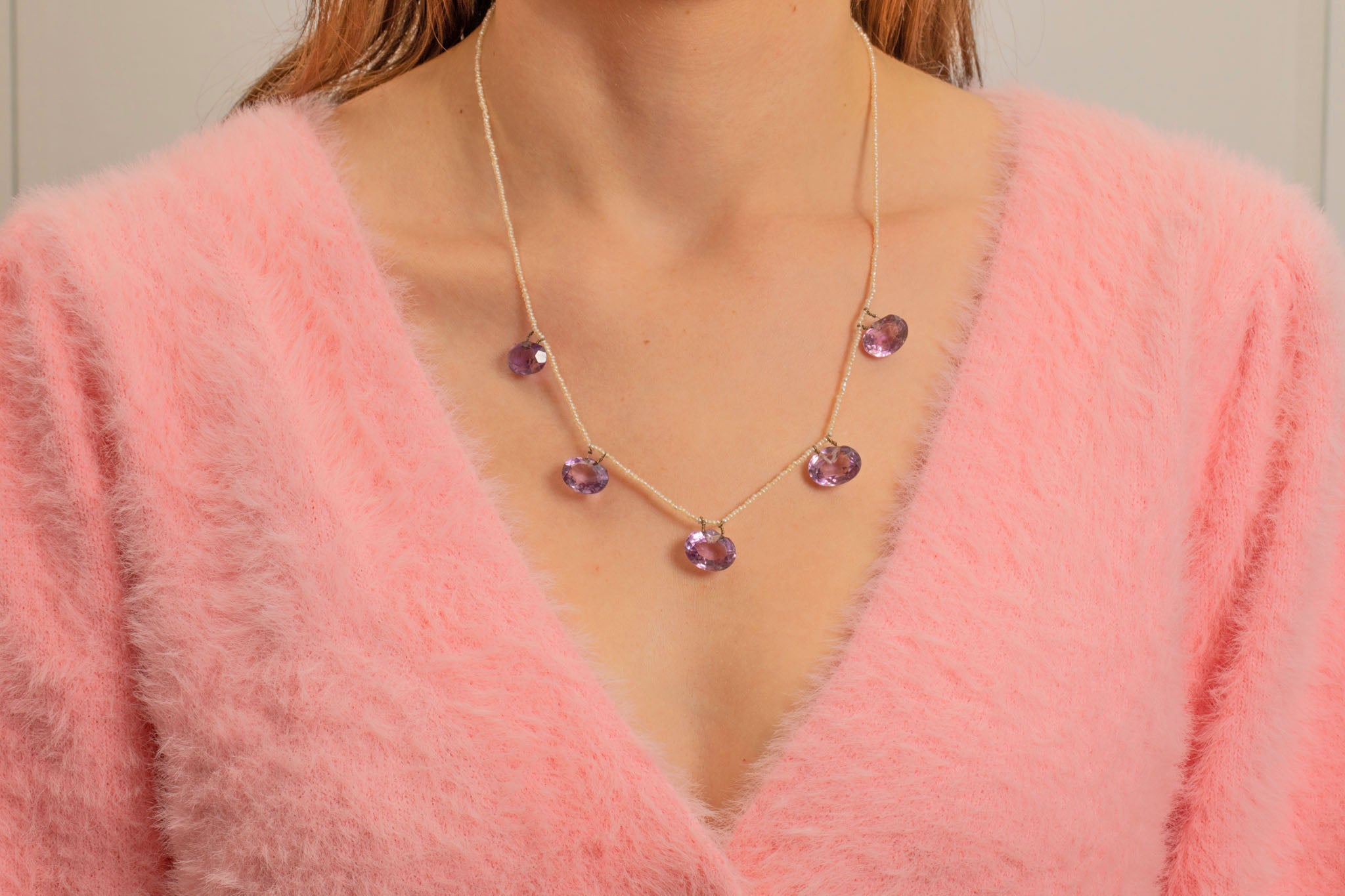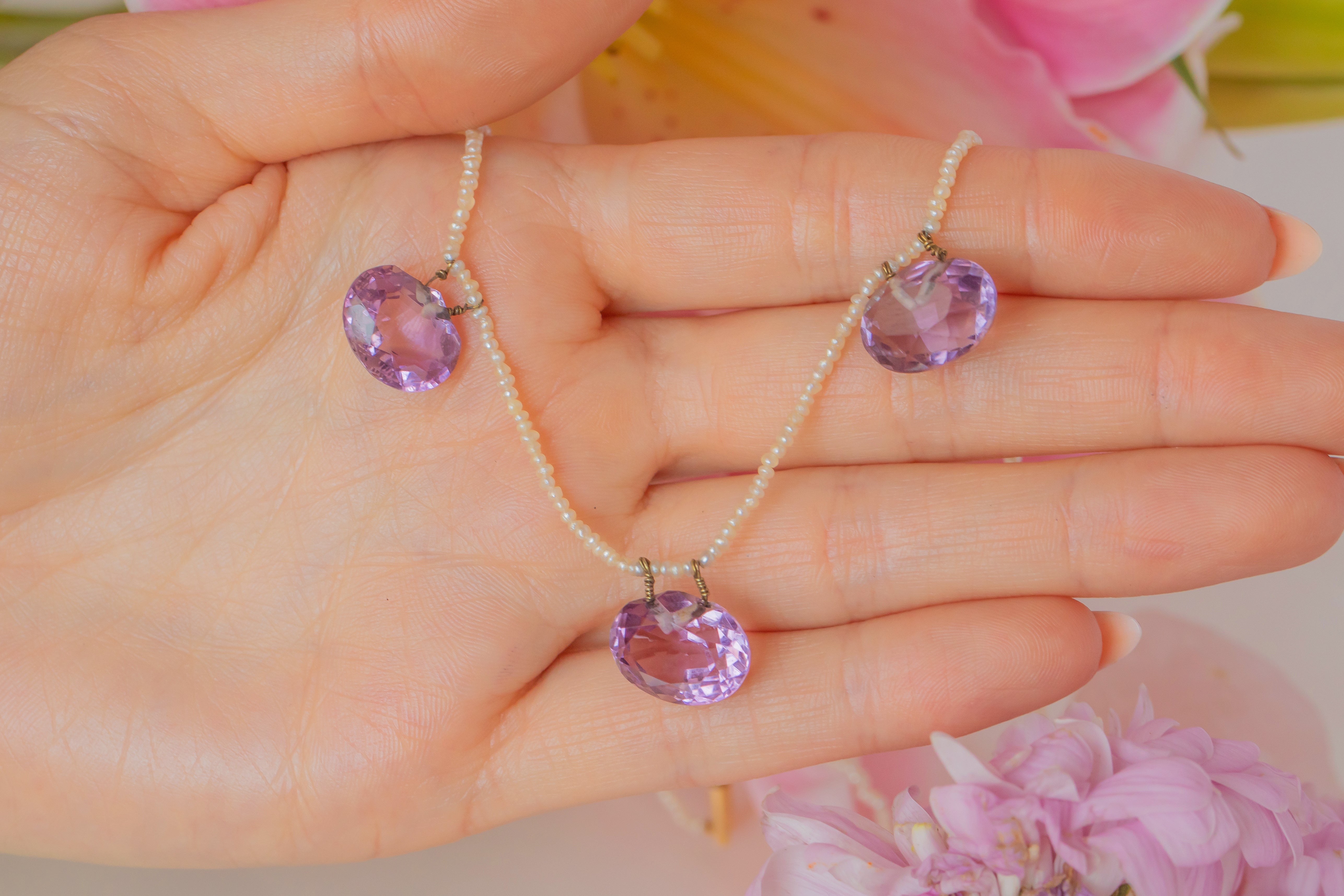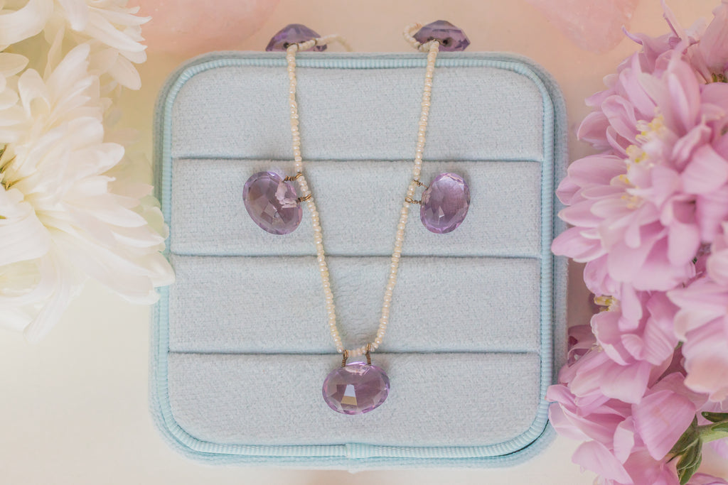 Strung with shimmering Seed Pearls, each dainty yet individual in shape and size, celebrating their organic form. She comes complete with a stamped 9ct Gold barrel clasp. Amethyst is the birthstone of February, making this mermaid-esque Edwardian necklace a fine gift for any Aquarius baby.
