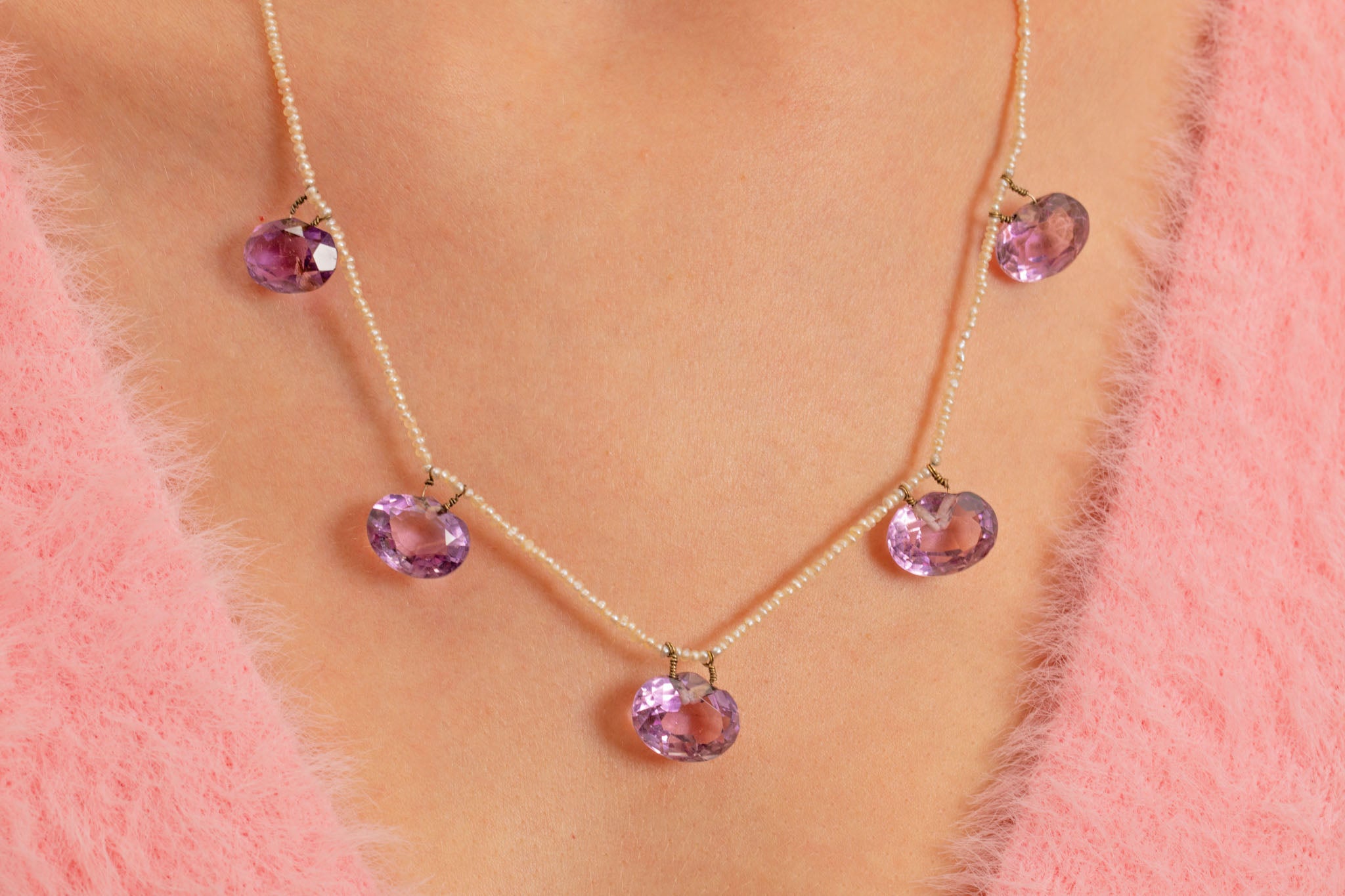 We can't believe how beautiful this Edwardian amethyst & Seed Pearl necklace is! A summery find perfect for the upcoming warmer months, this antique necklace flaunts five juicy Amethysts. Gorgeously plump, light billows through every facet exuding a subtle twinkle.