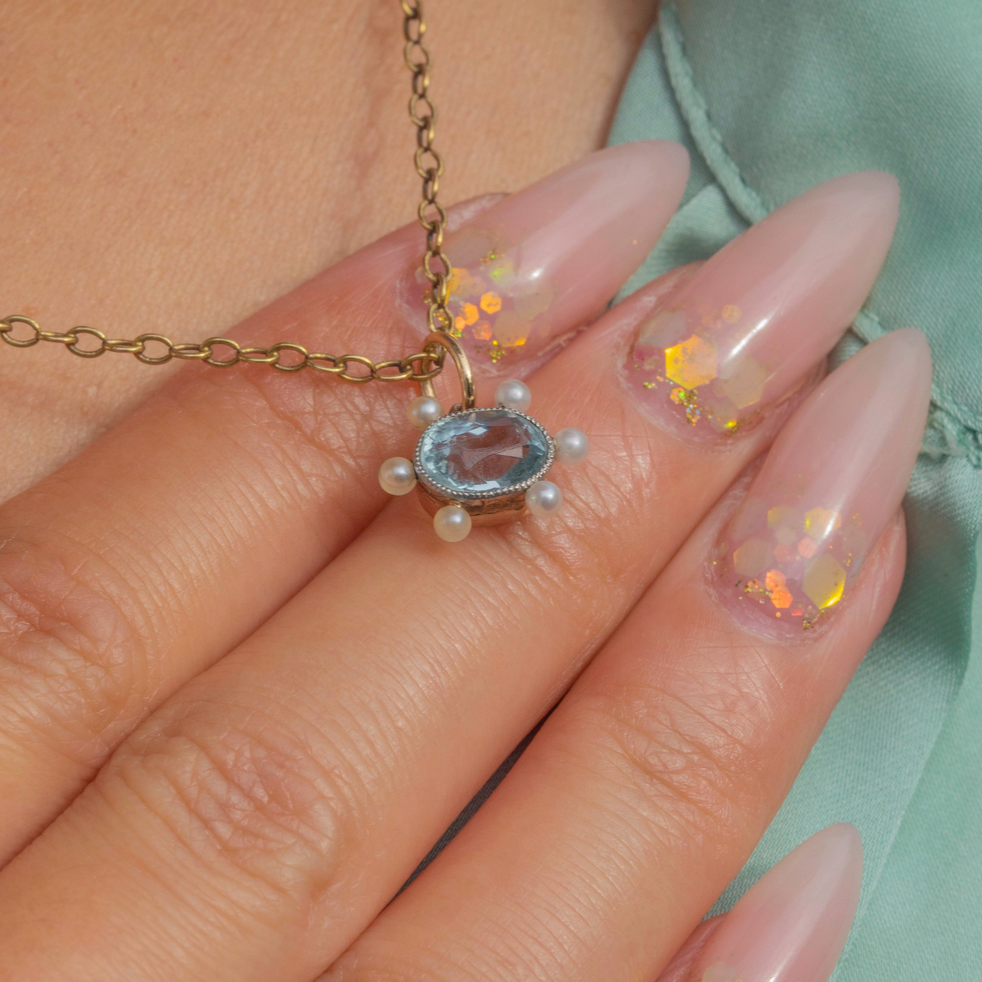 This Edwardian pendant is a charming little treasure, crafted in 9ct Gold and set with a glowing oval Aquamarine framed by creamy Pearls. The Aquamarine weighs approximately 1.78ct, displaying a soft and delicate blue that contrasts beautifully with the warm Gold setting.