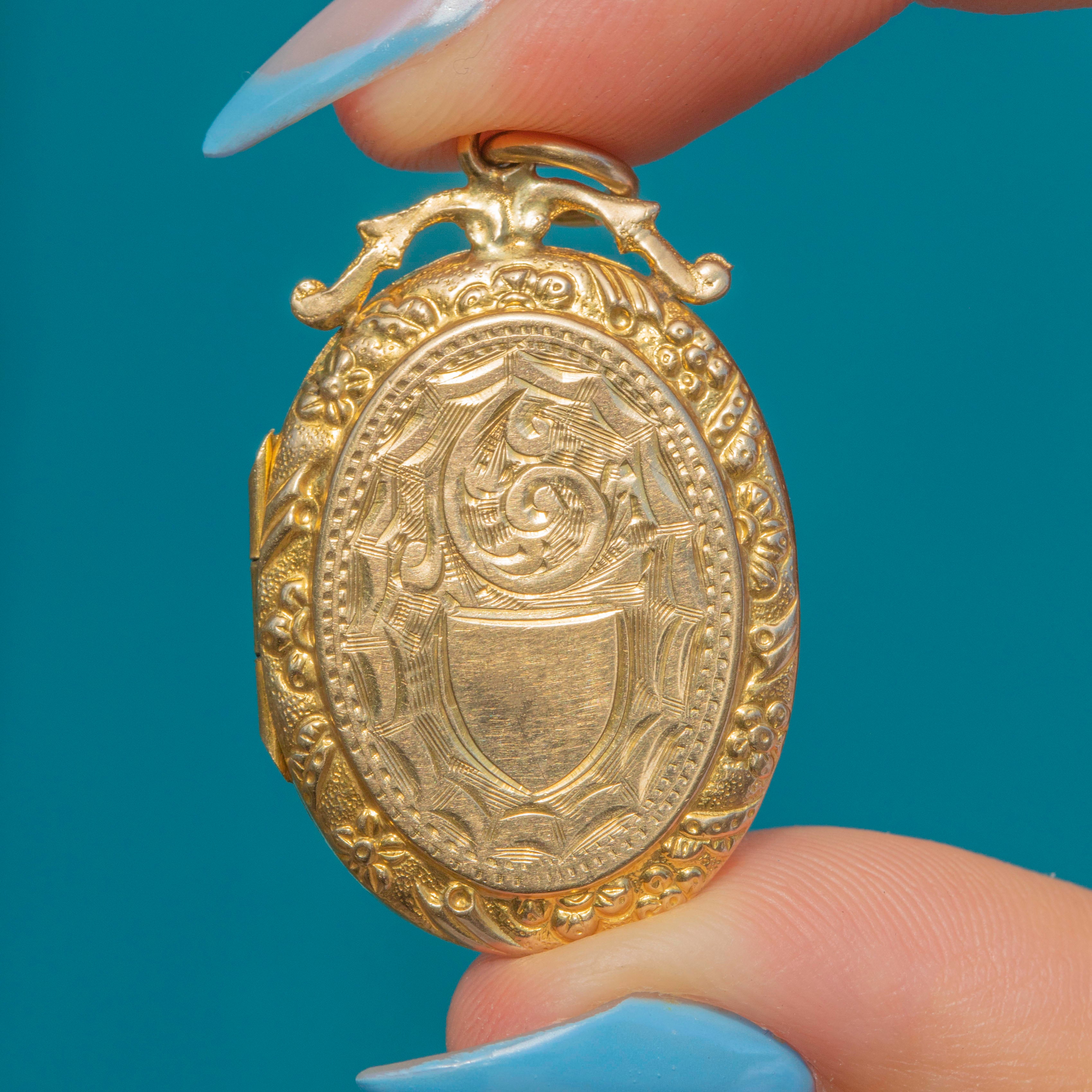 VERY GOOD-EXCELLENT: The Gold doors are bright and glossy, and the engravings have remained crisp. There is some slight wear to the inside of the locket, commensurate with age. With a secure jump ring, this antique locket can be worn with utmost confidence.