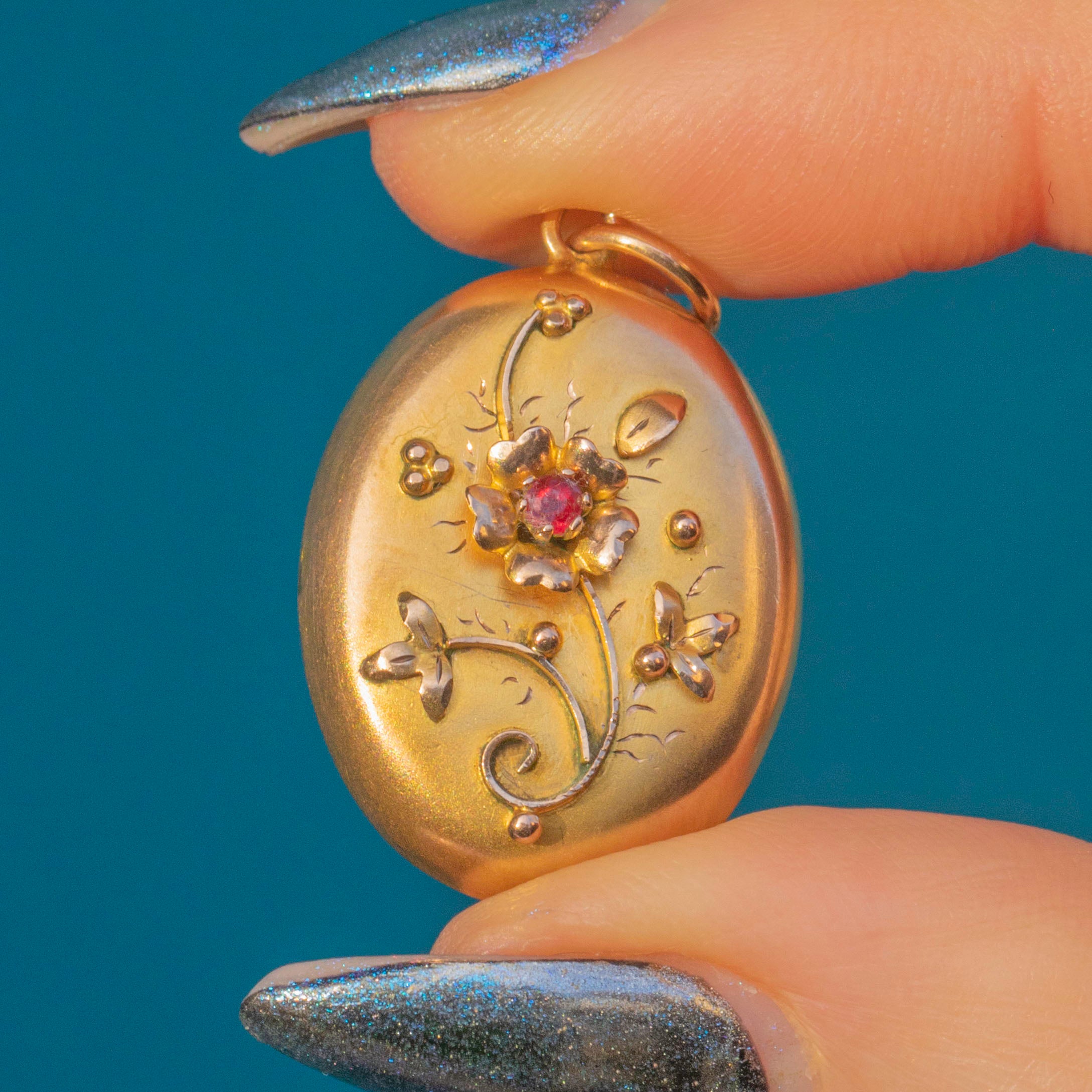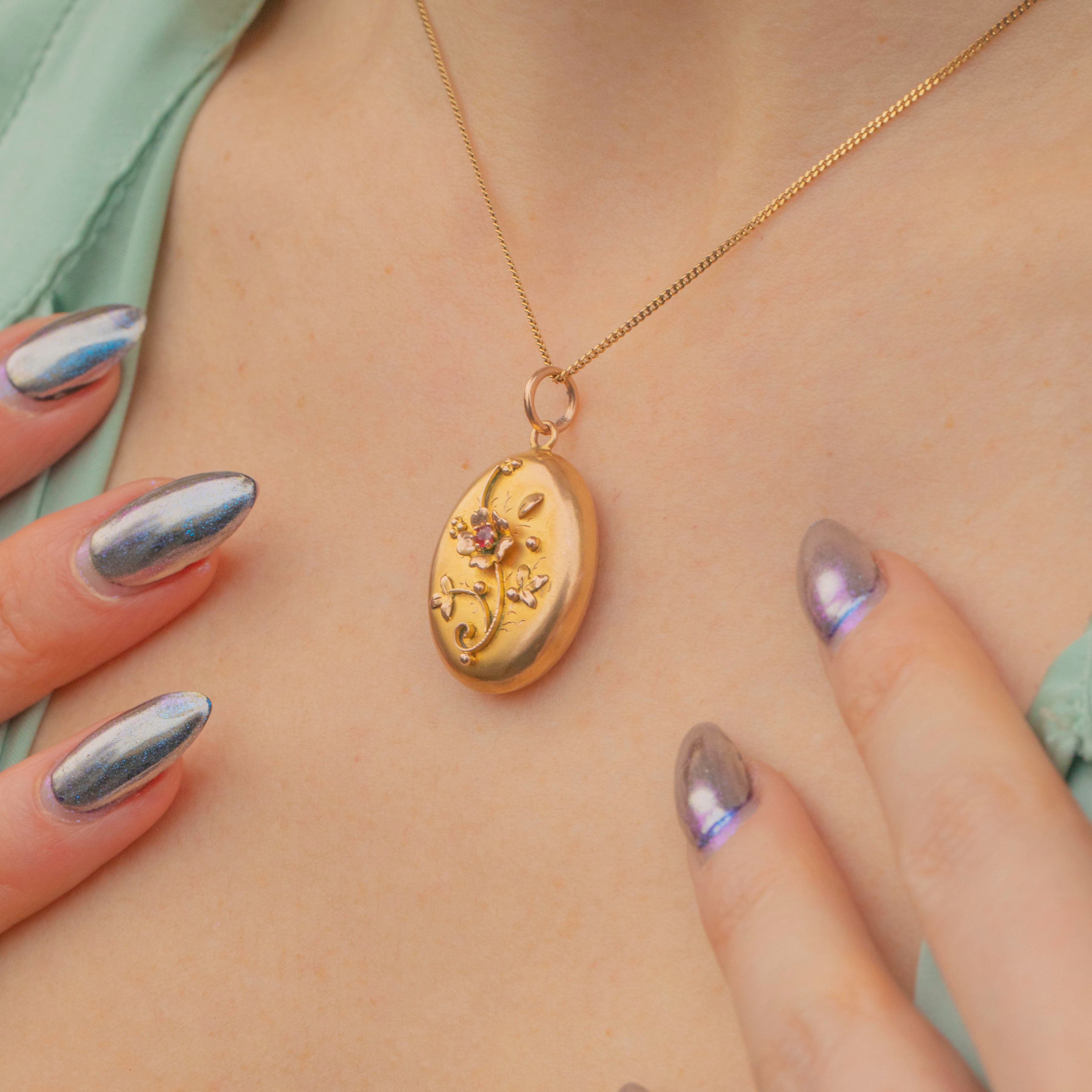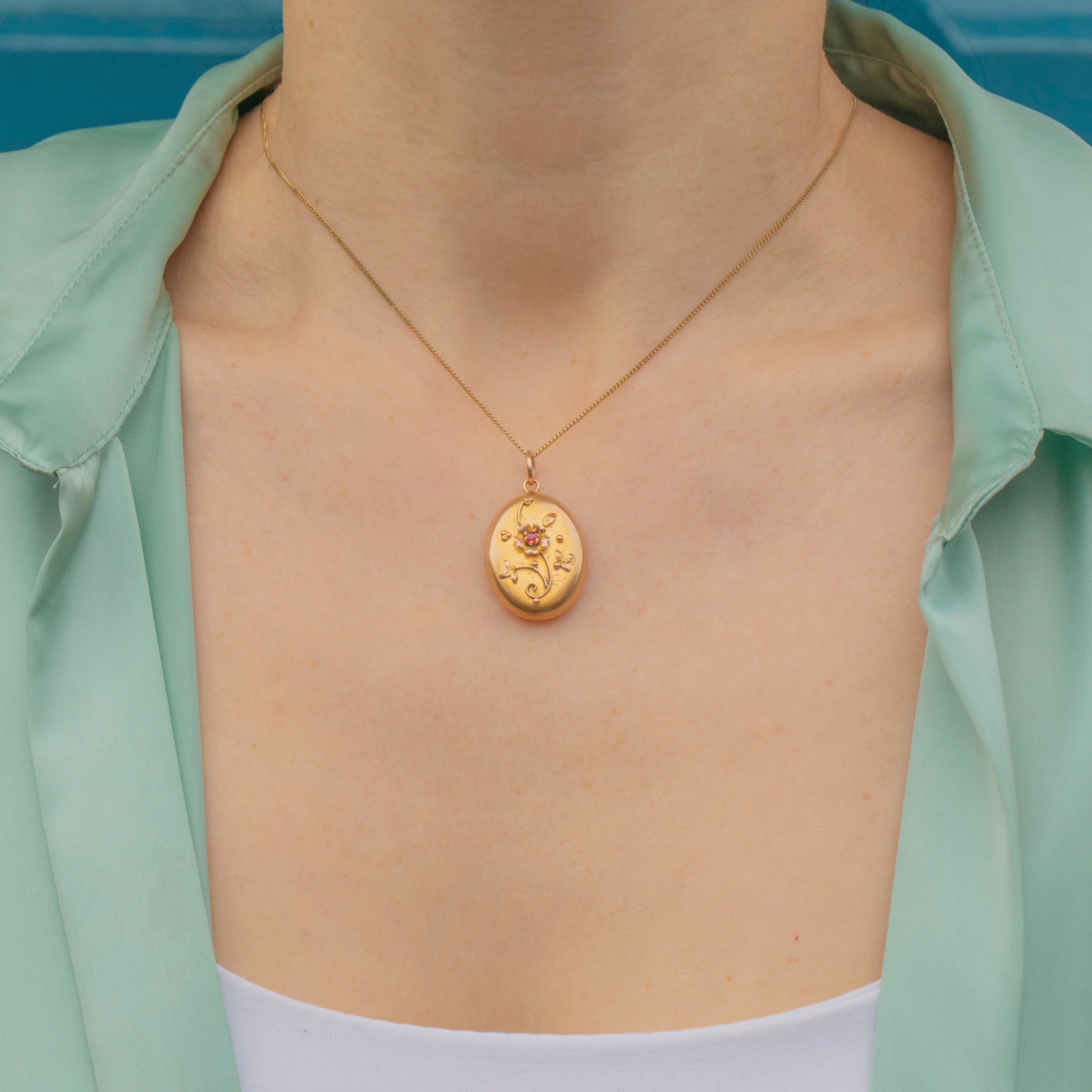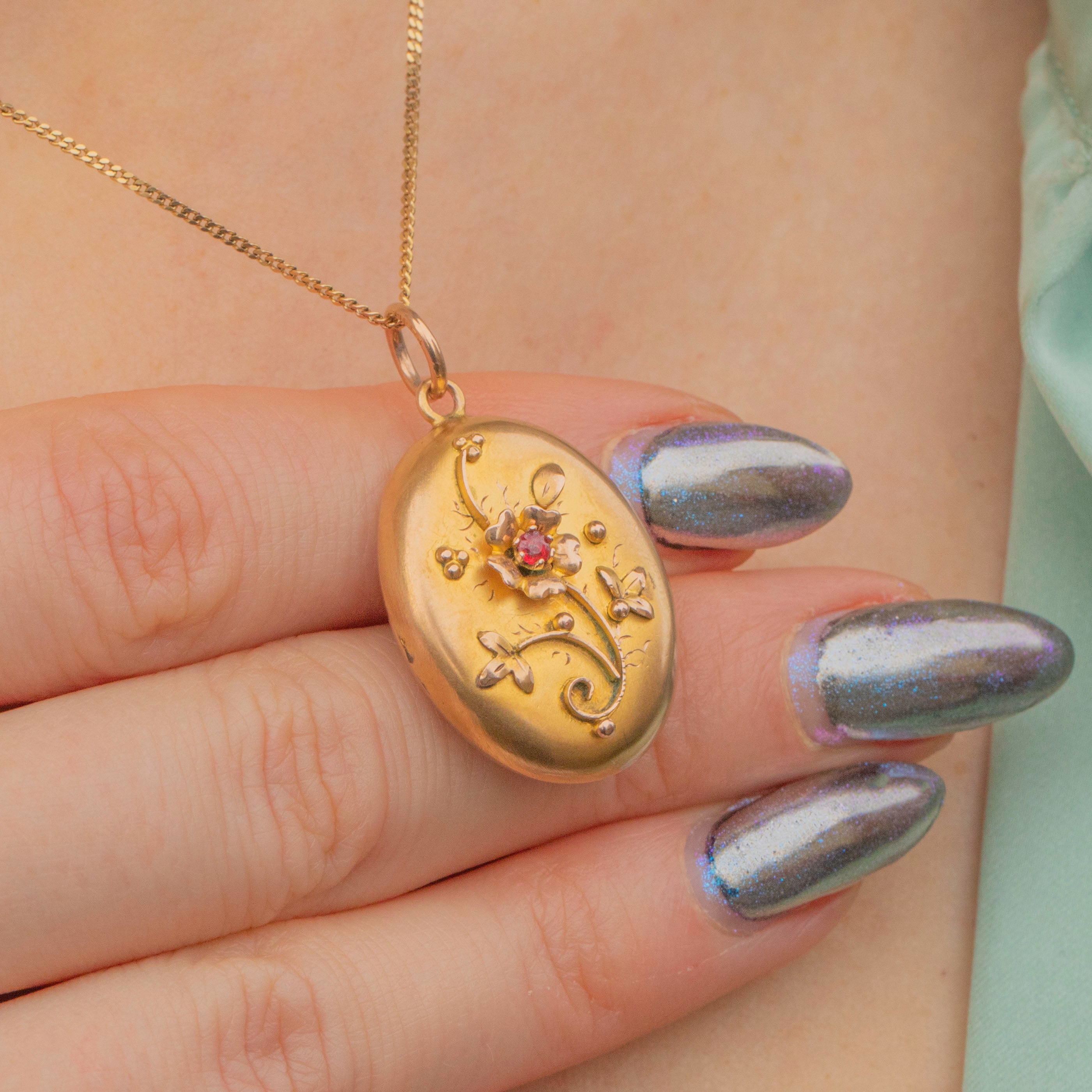 Crafted from buttery 9ct Gold, this antique locket features a gorgeous floral motif on her front panel and is adorned by a deep crimson Garnet in her centre, marrying the warmth of the Gold.