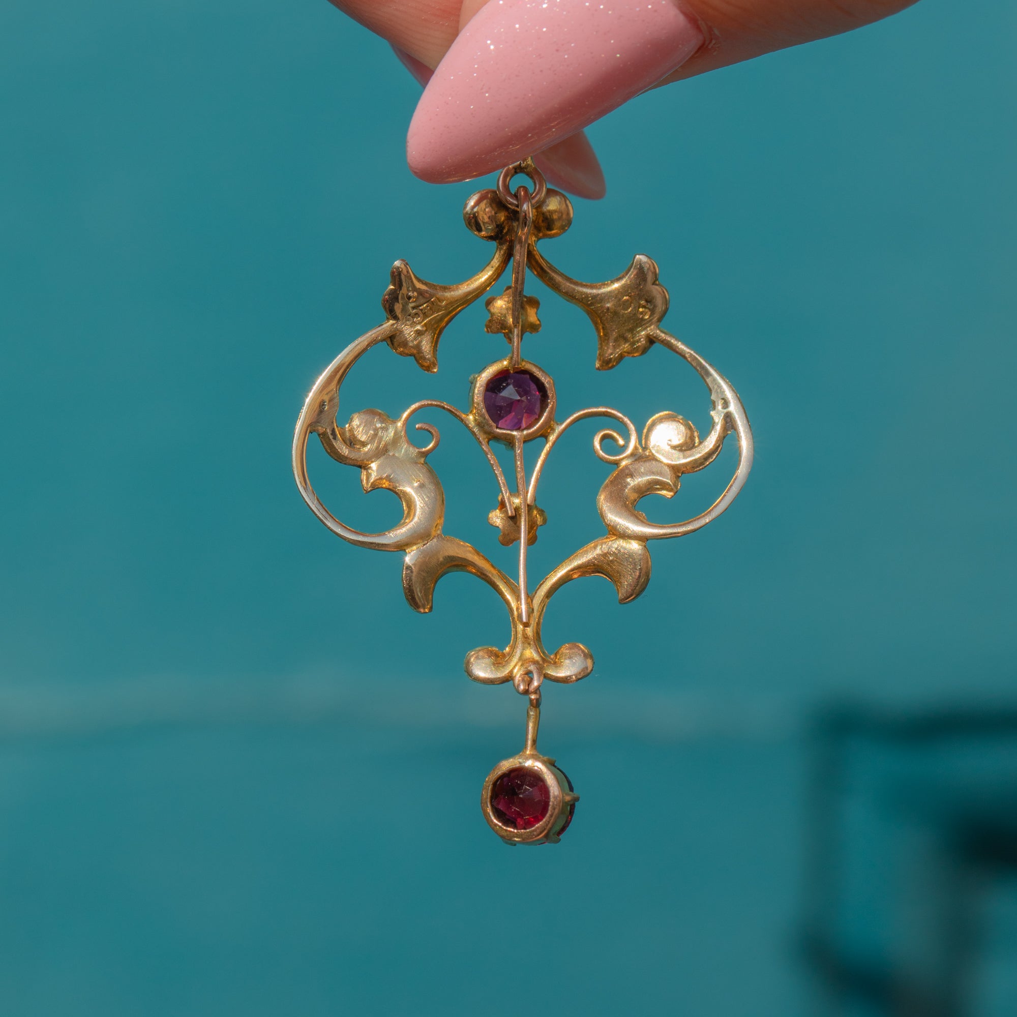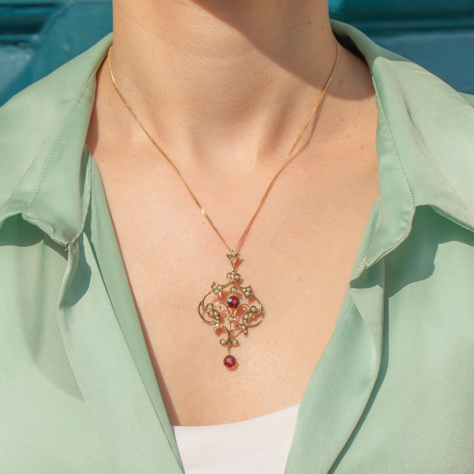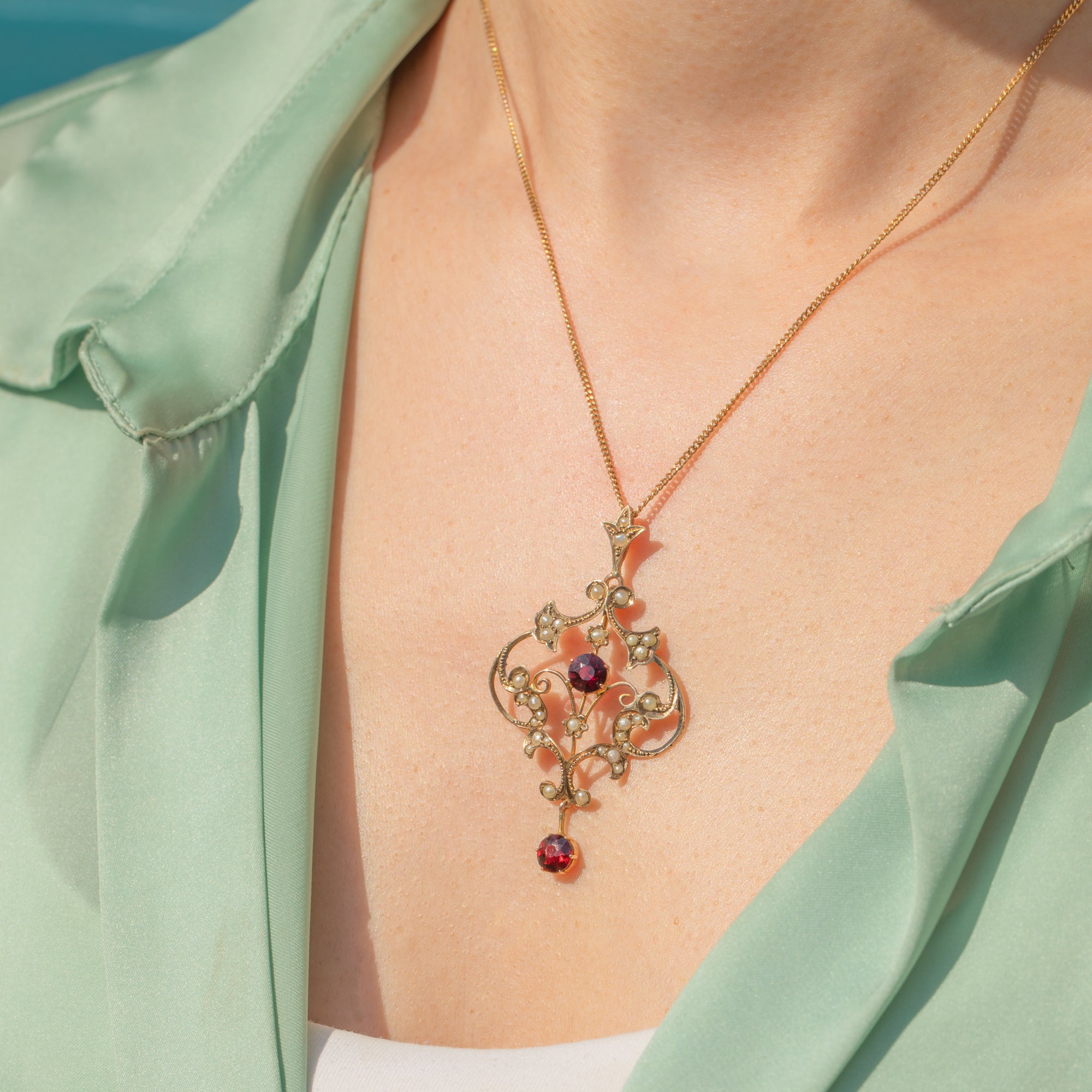 This exquisite Edwardian 9ct Gold Garnet and Pearl Lavalier pendant is a true gem for any antique jewellery collection. Crafted from rich 9ct Gold, her flowing, feminine lines embody the elegance of the Edwardian era, curling delicately around floral forms and set with shimmering Seed Pearls.