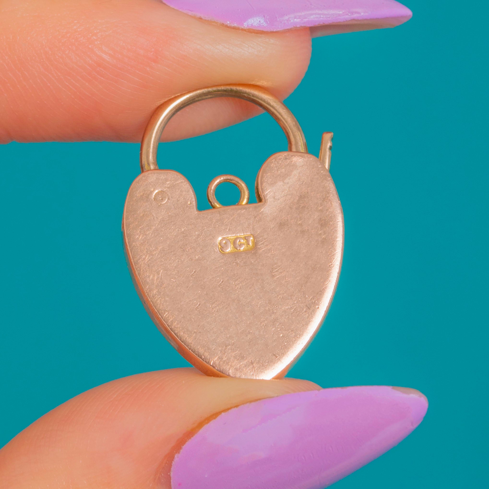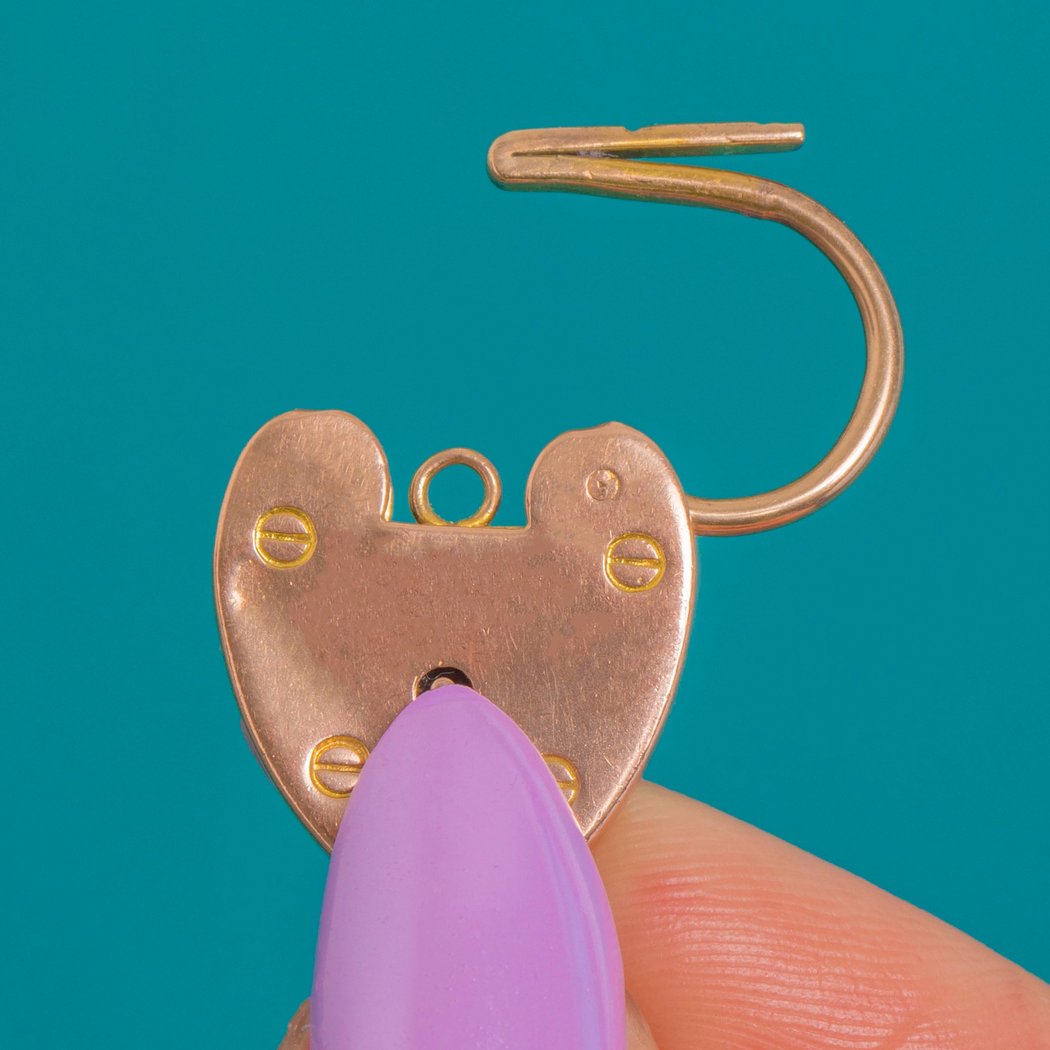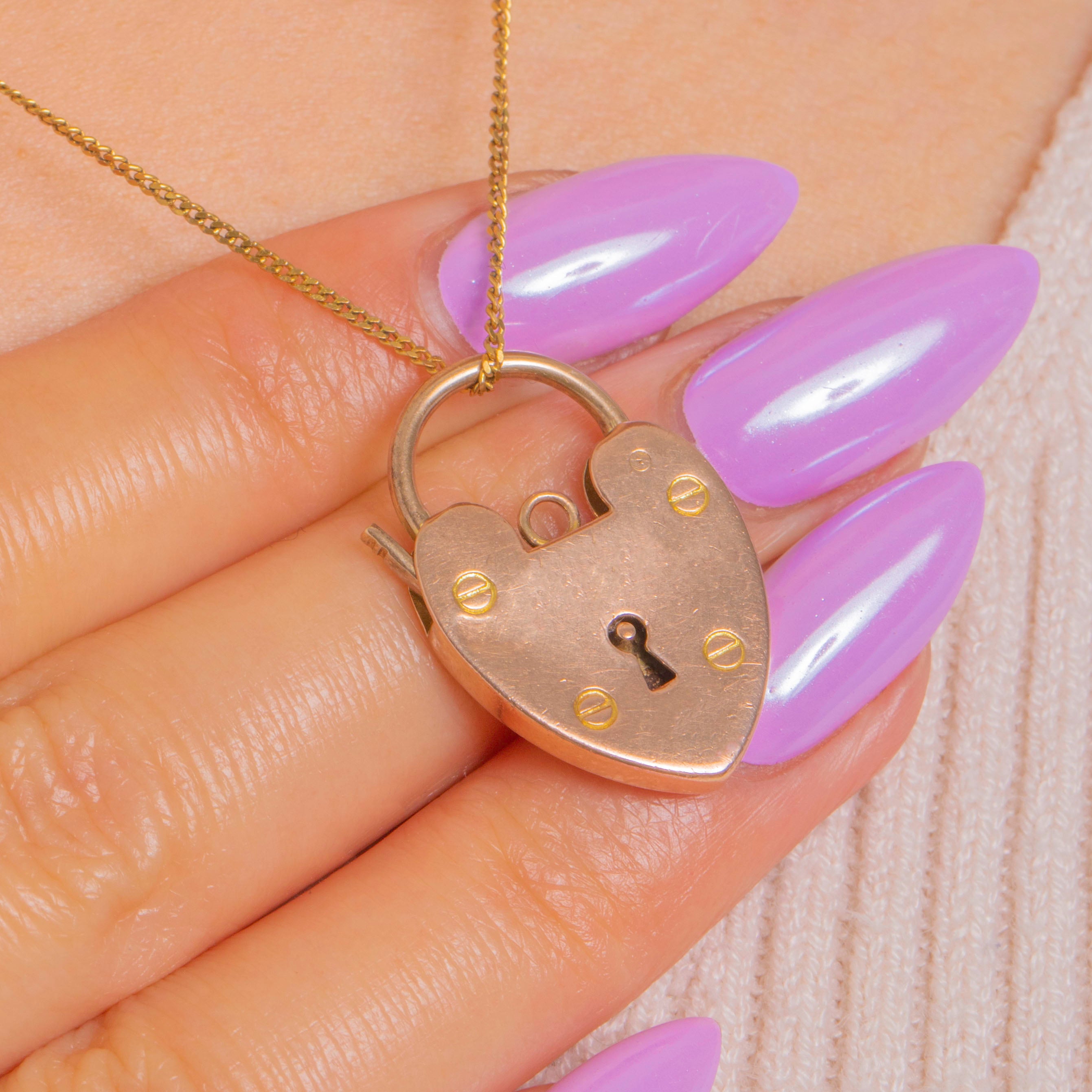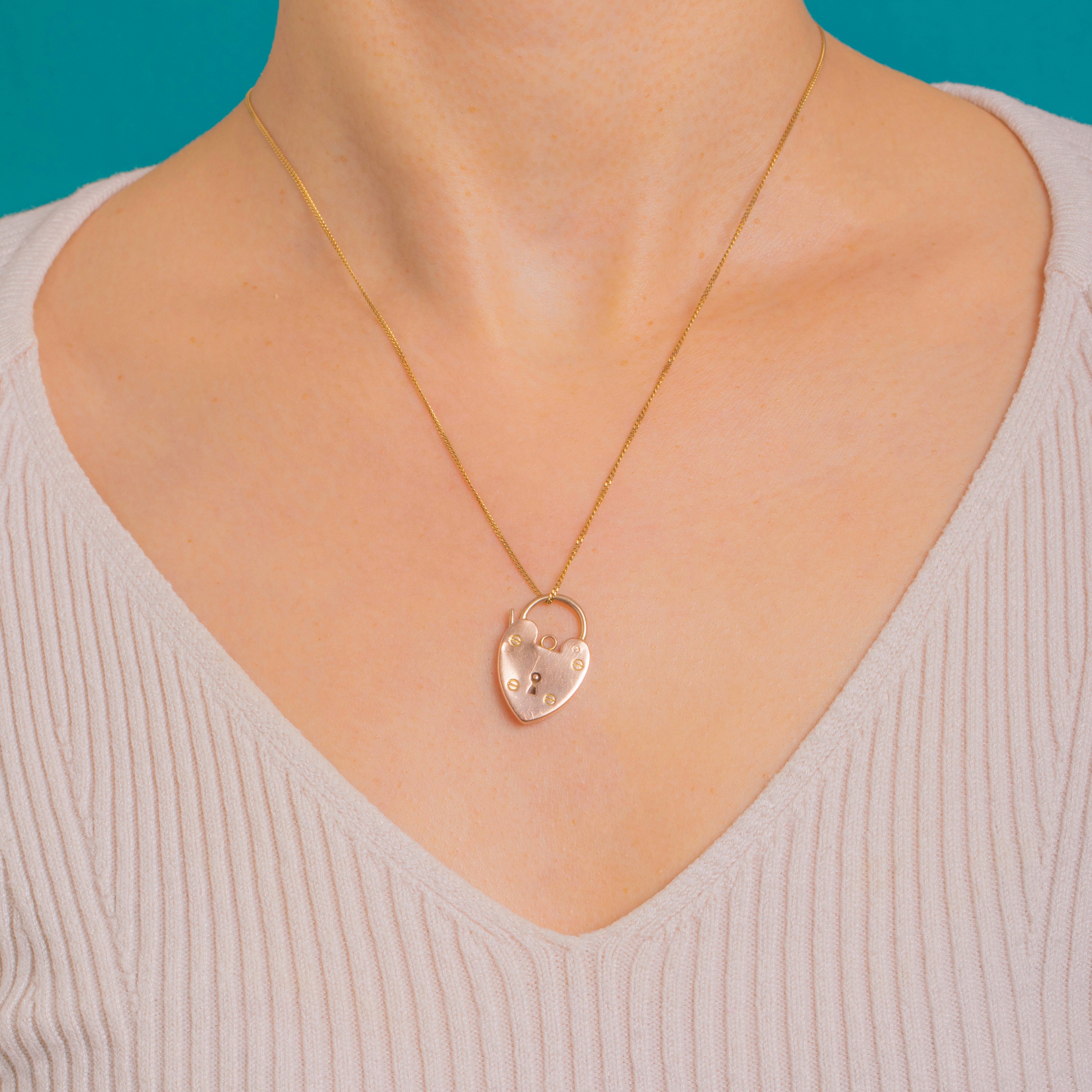 Sweet and symbolic, this Edwardian 9ct Gold heart padlock pendant marries romance with a refined, utilitarian edge. The polished heart is detailed with a central keyhole and four tiny slotted screw-head accents, giving subtle texture against the warm, softly rosy Gold.