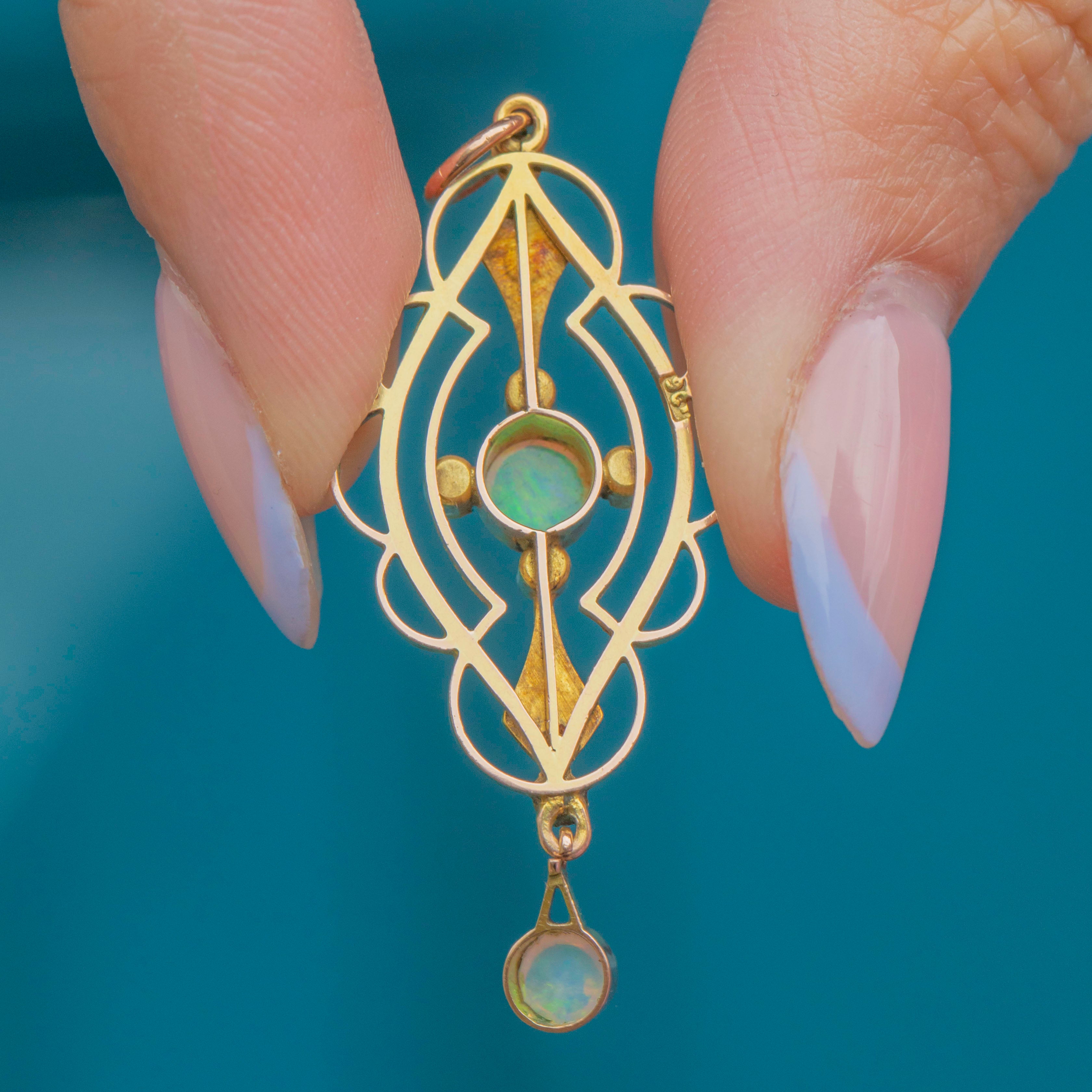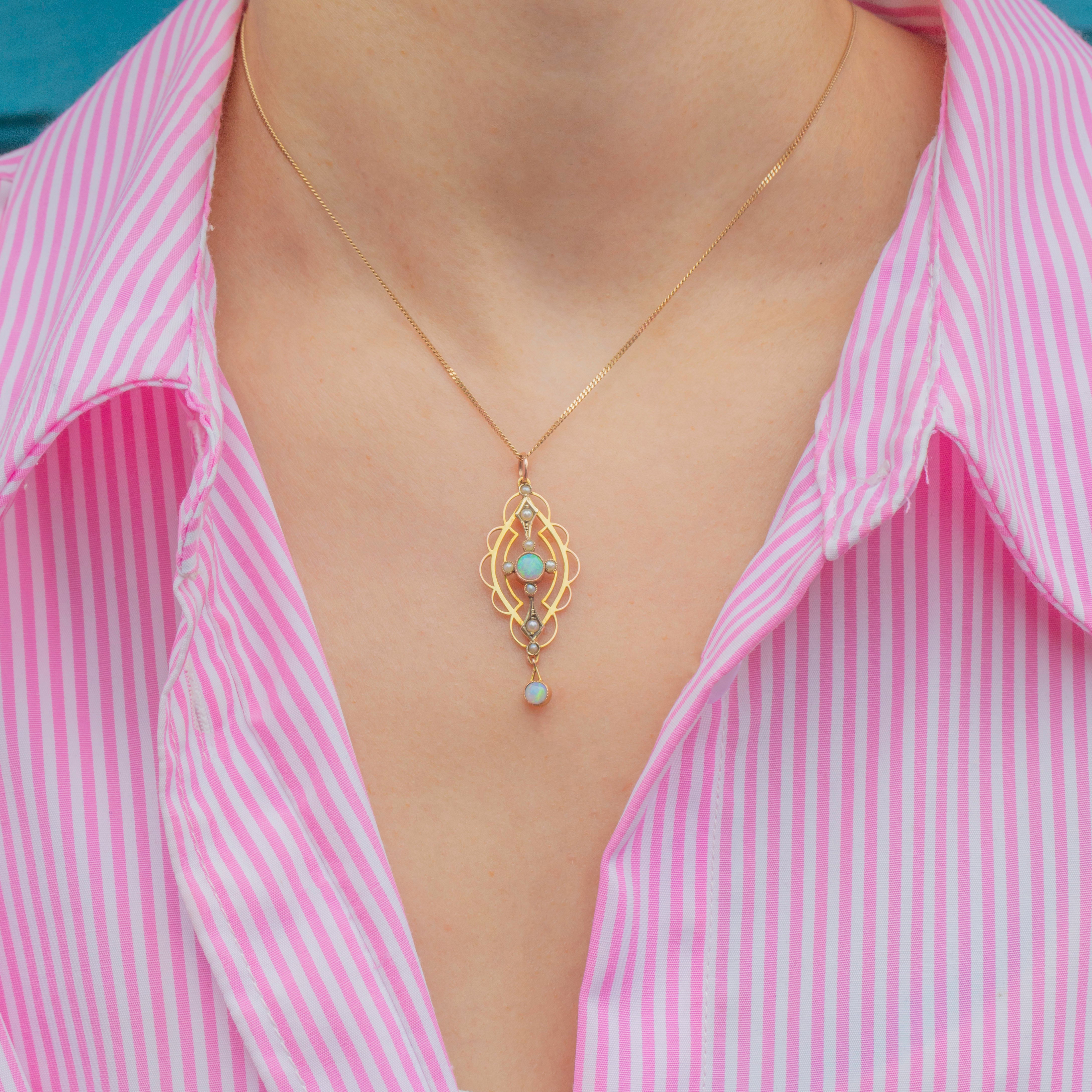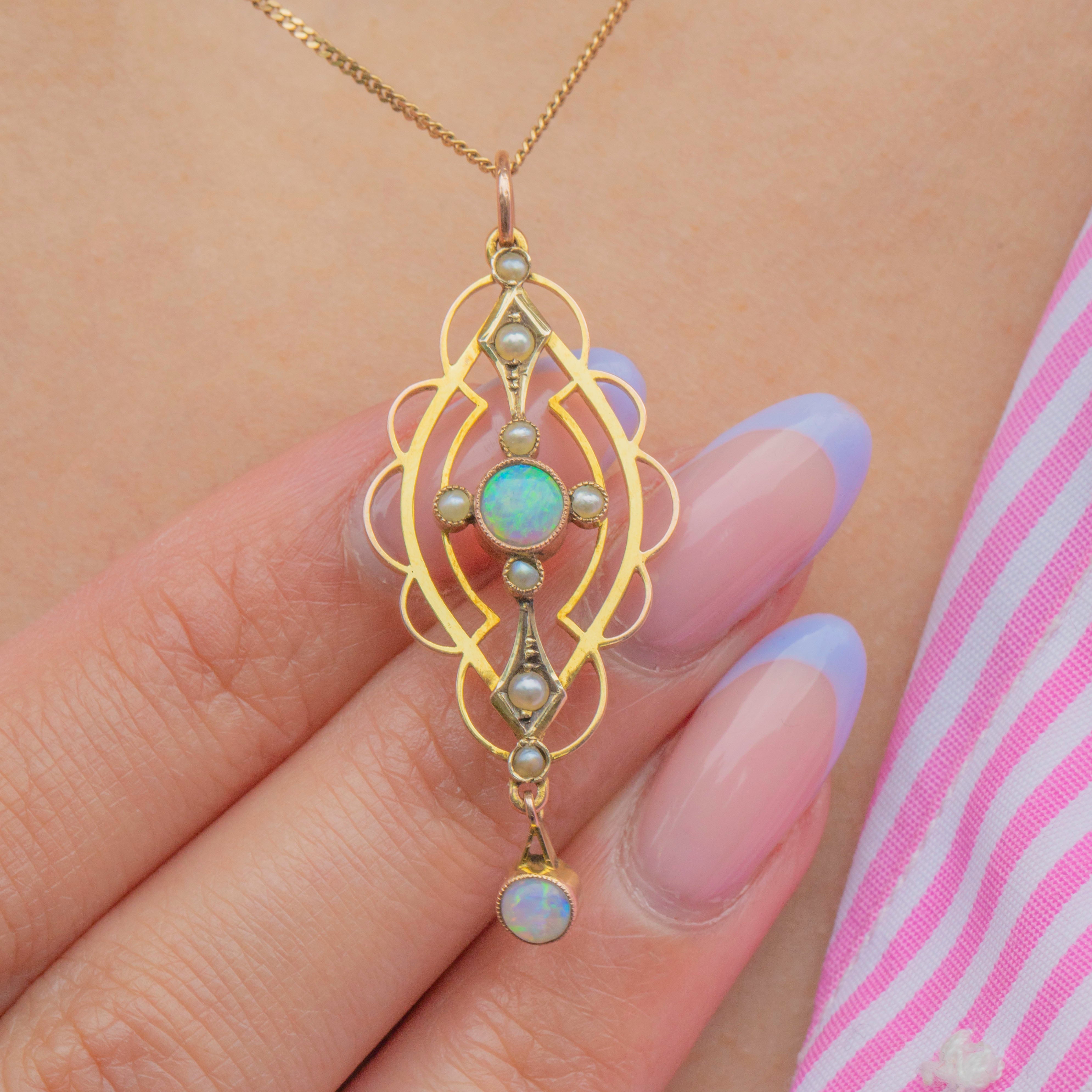 VERY GOOD-EXCELLENT: This Edwardian 9ct Gold Opal and Pearl drop pendant is in great condition. The gemstones are radiant and secure in their bezels. There are some signs of wear and discolouration to the Gold settings commensurate with age, though this is only noticeable under close inspection. With a securely soldered jump ring, you can wear this antique Opal pendant with confidence!