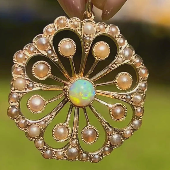Edwardian 9ct Gold Opal Pearl Flower Cluster Pendant