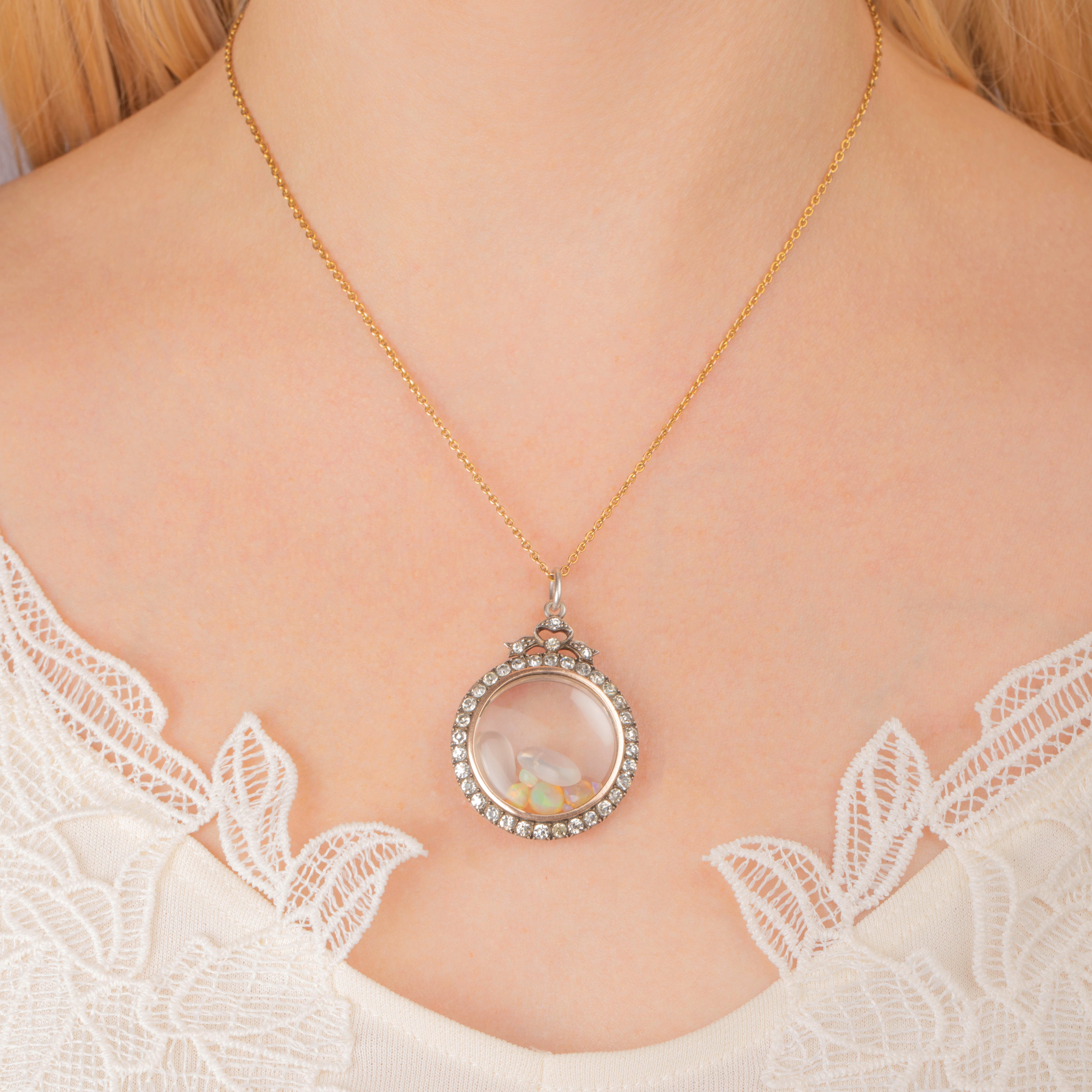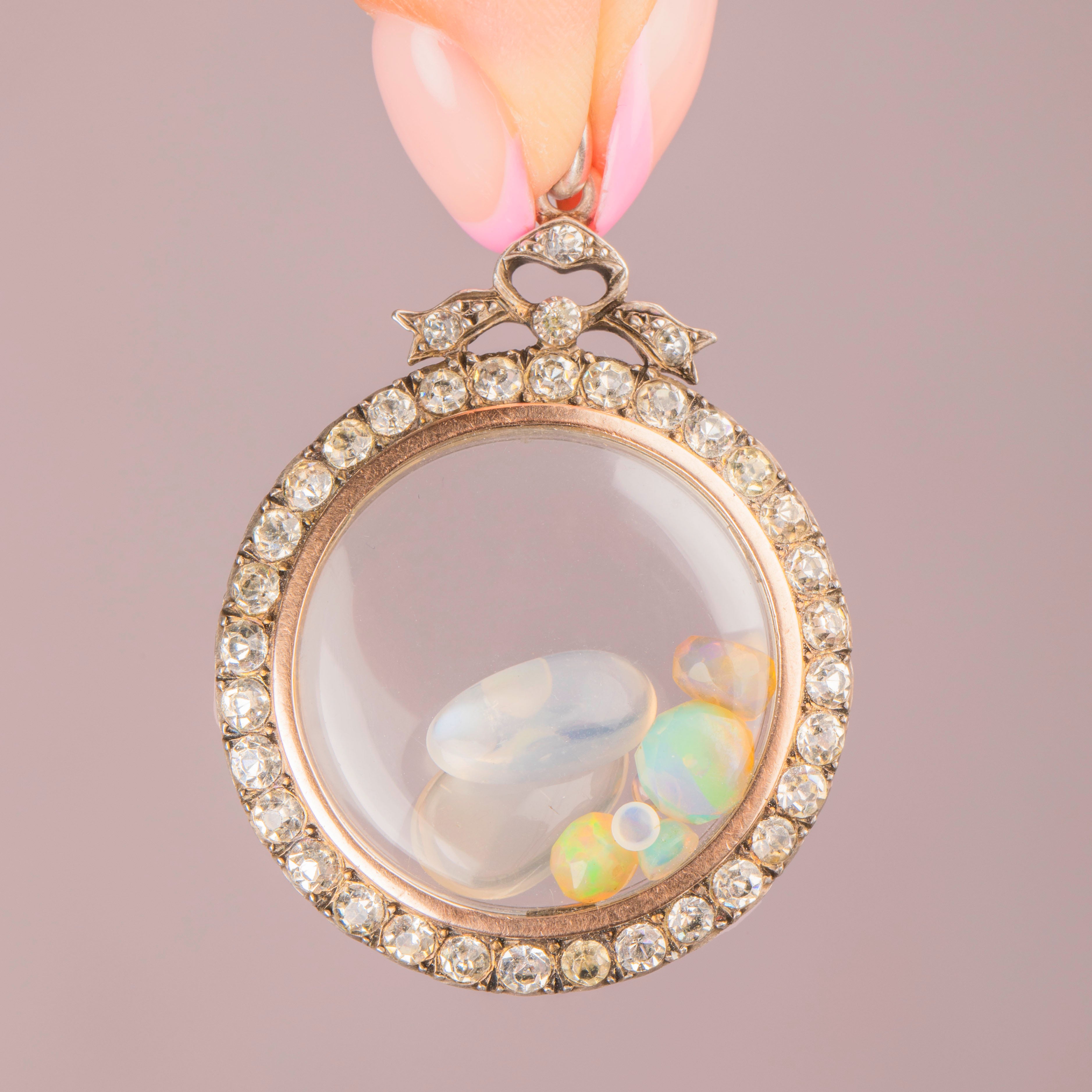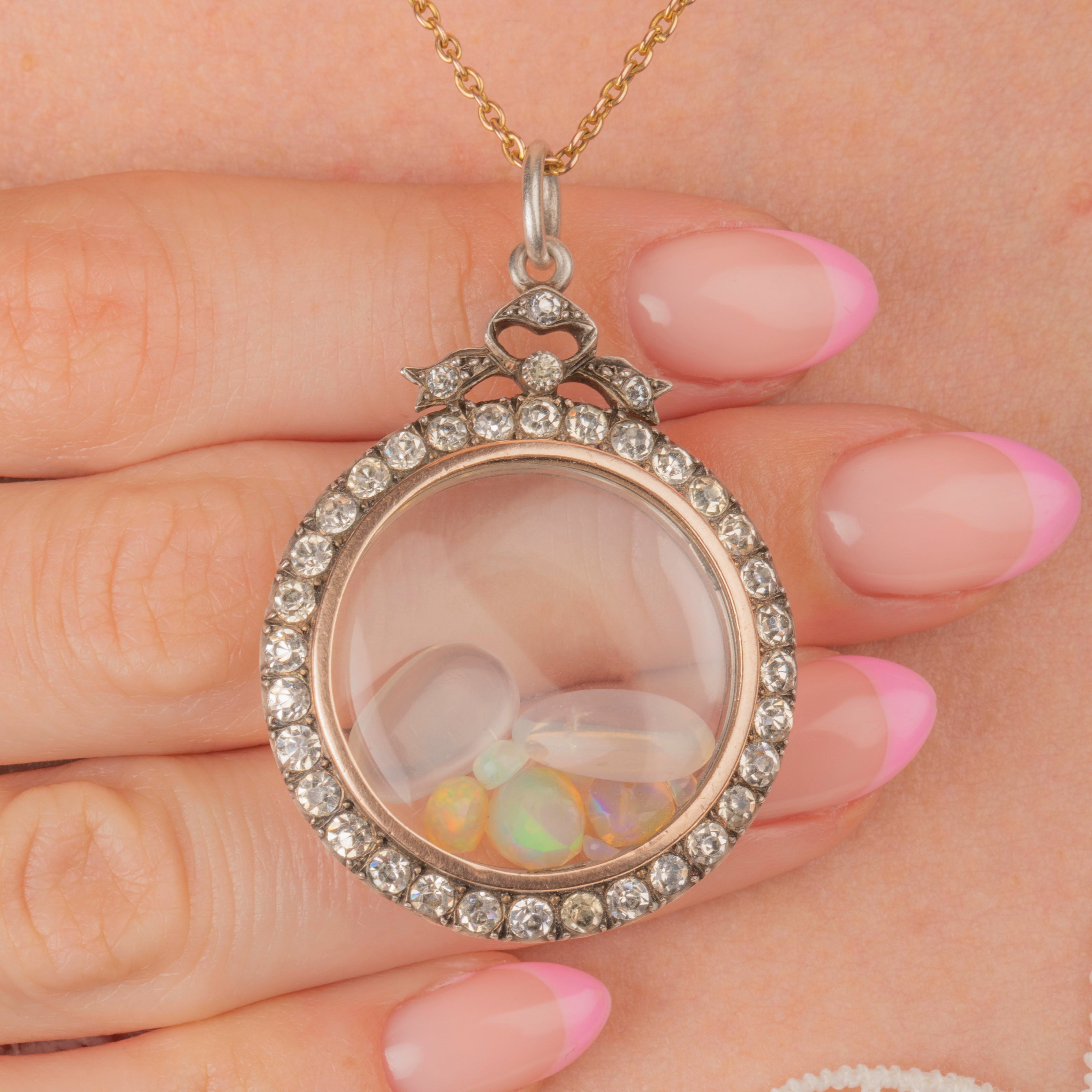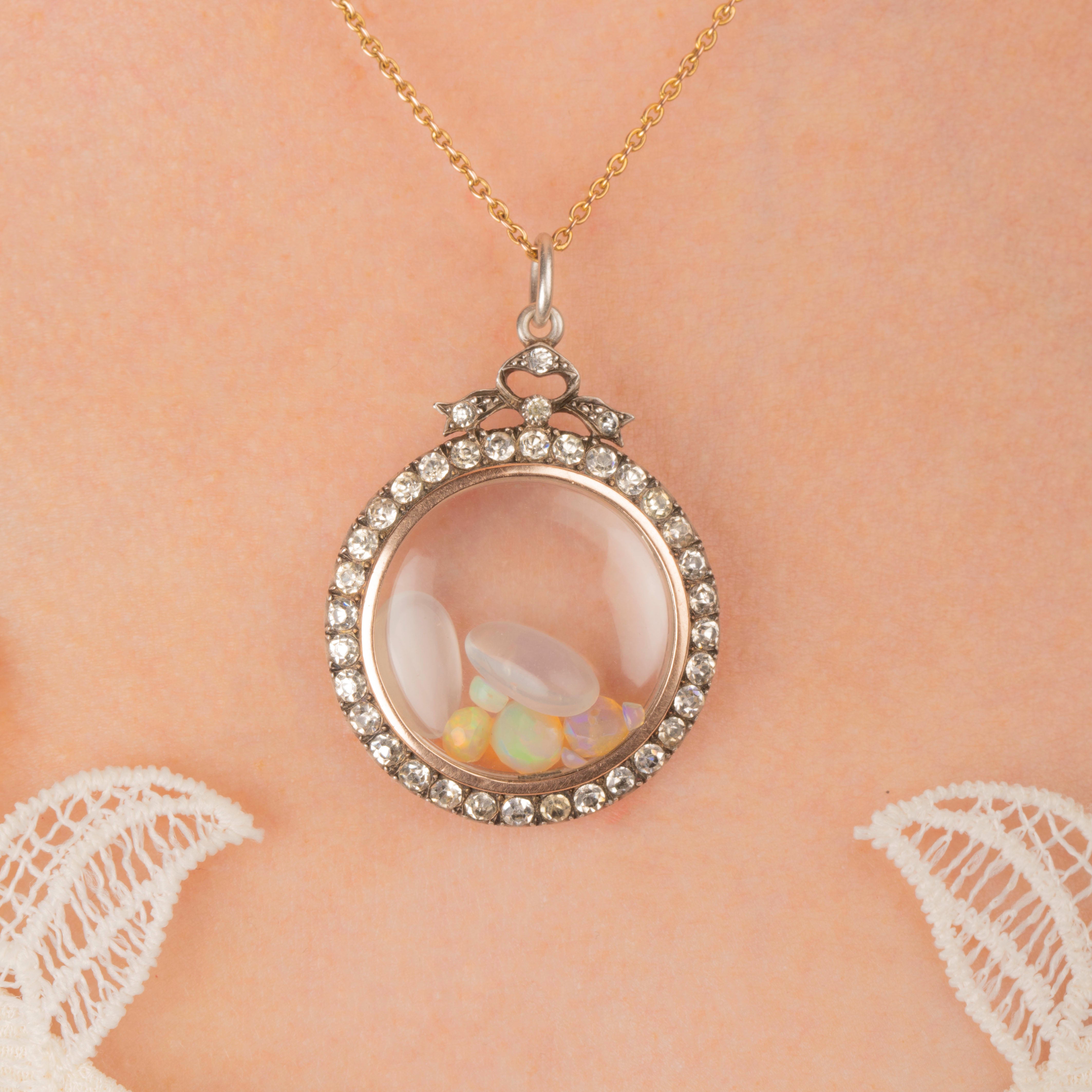 VERY GOOD. This Edwardian 9ct Gold Paste shaker locket is in very good condition. Her jump-ring is securely hooked on, so you can wear her with the utmost confidence. Although some of her Diamond Paste stones have dulled a little over time, all are present and many remain bright and sparkly - rivaling the real deal! The Sterling Silver has minor surface wear, however, this is not noticeable when worn. Her loose gemstones have a fluid movement inside and make a satisfying rattle, you can even add your own if desired. Flaunt this beautiful antique shaker locket to add grandeur to any attire.