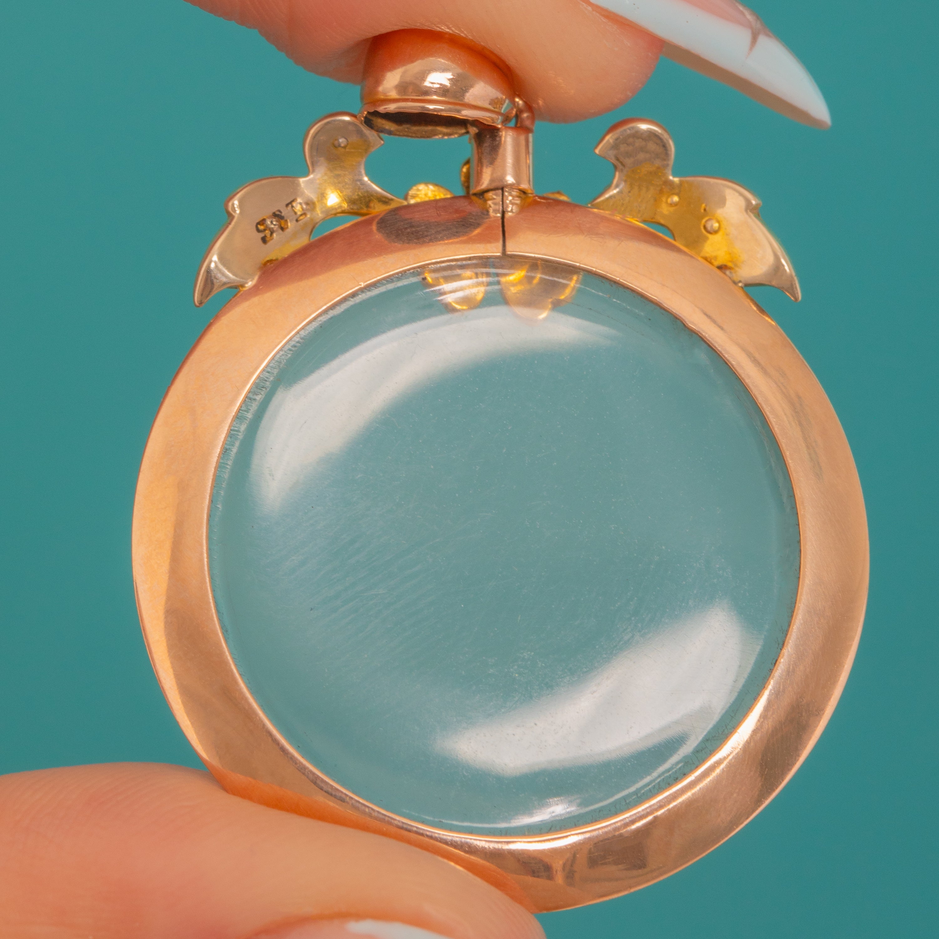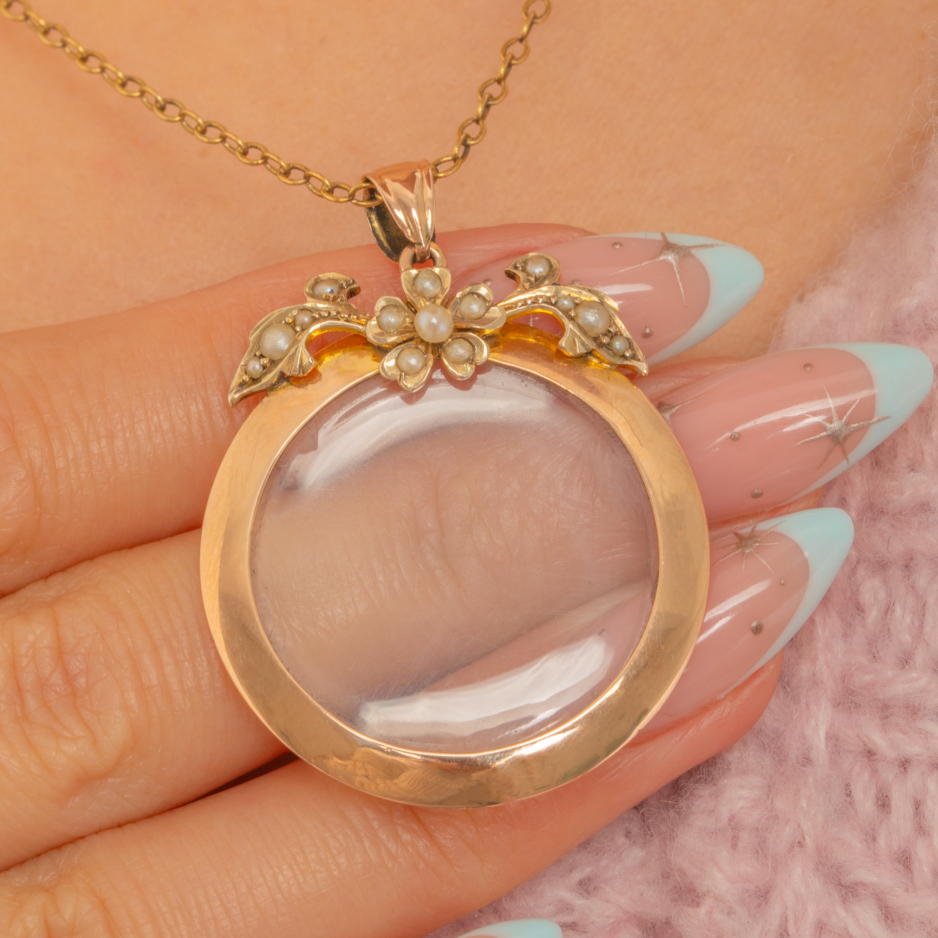 VERY GOOD: The clear window shows light abrasions commensurate with age, with a bright, clean look overall. The Gold frame and foliate settings are well-preserved with gentle surface wear; the hinge and bale operate securely. The Pearls are intact and well-set, with no visible losses or repairs.