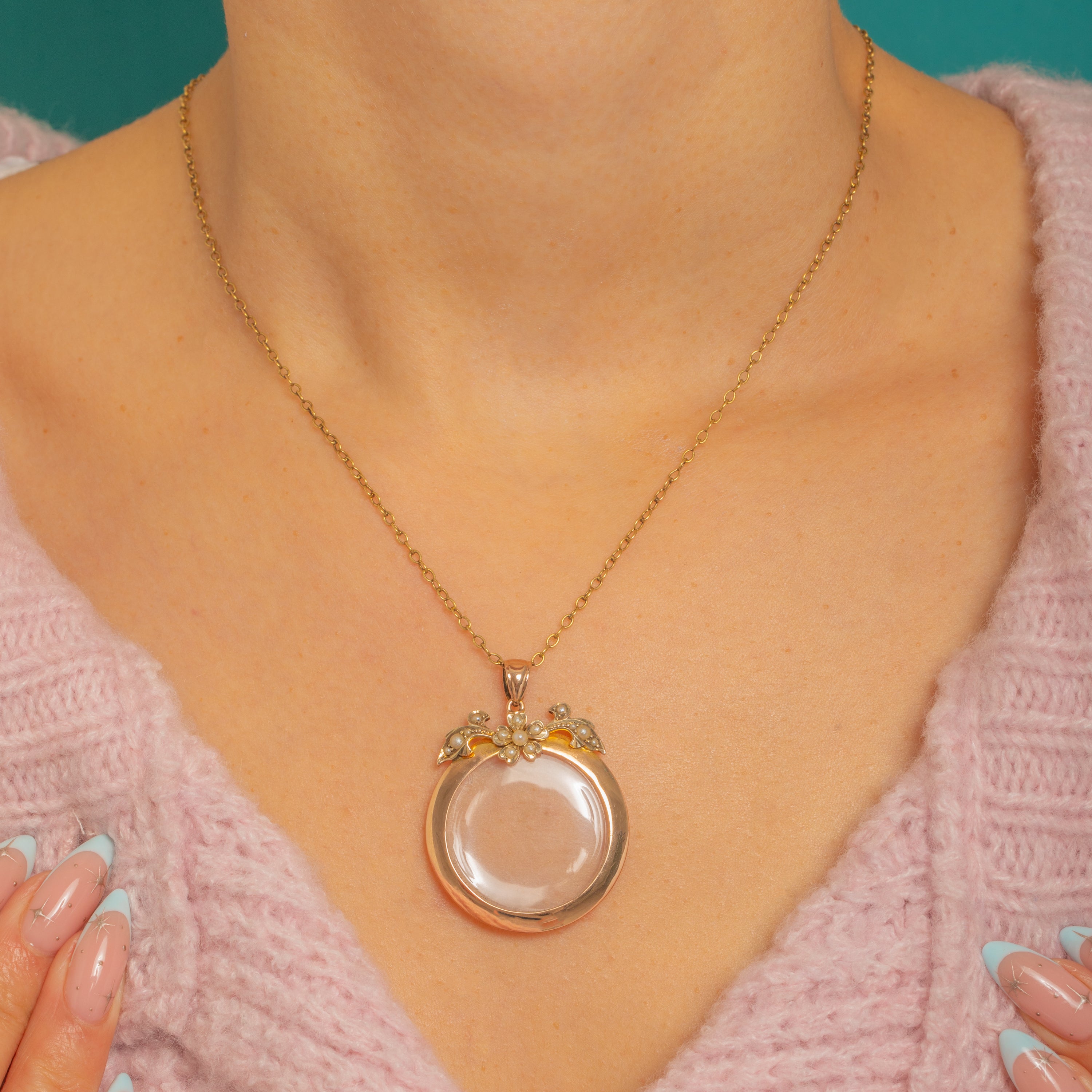 A delicate Edwardian picture locket in solid 9ct Gold, crowned with a charming Pearl flower. The smooth, rounded frame holds a beautifully clear, double‑domed window, creating an elegant, coin‑like silhouette that feels refined and romantic.