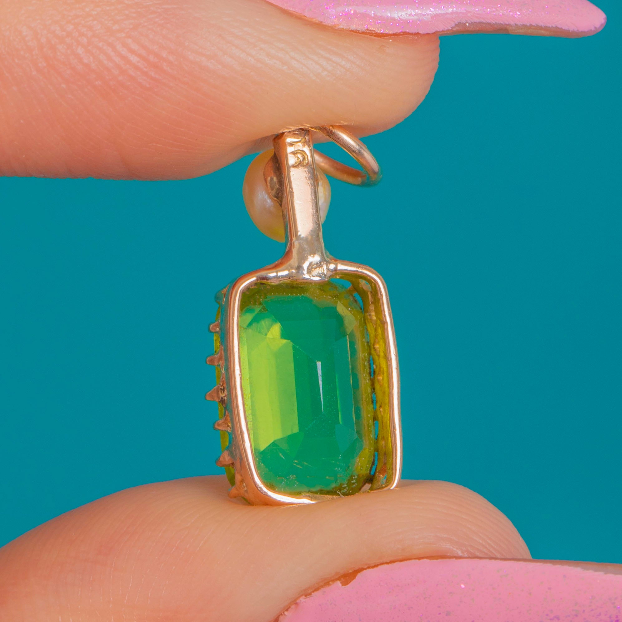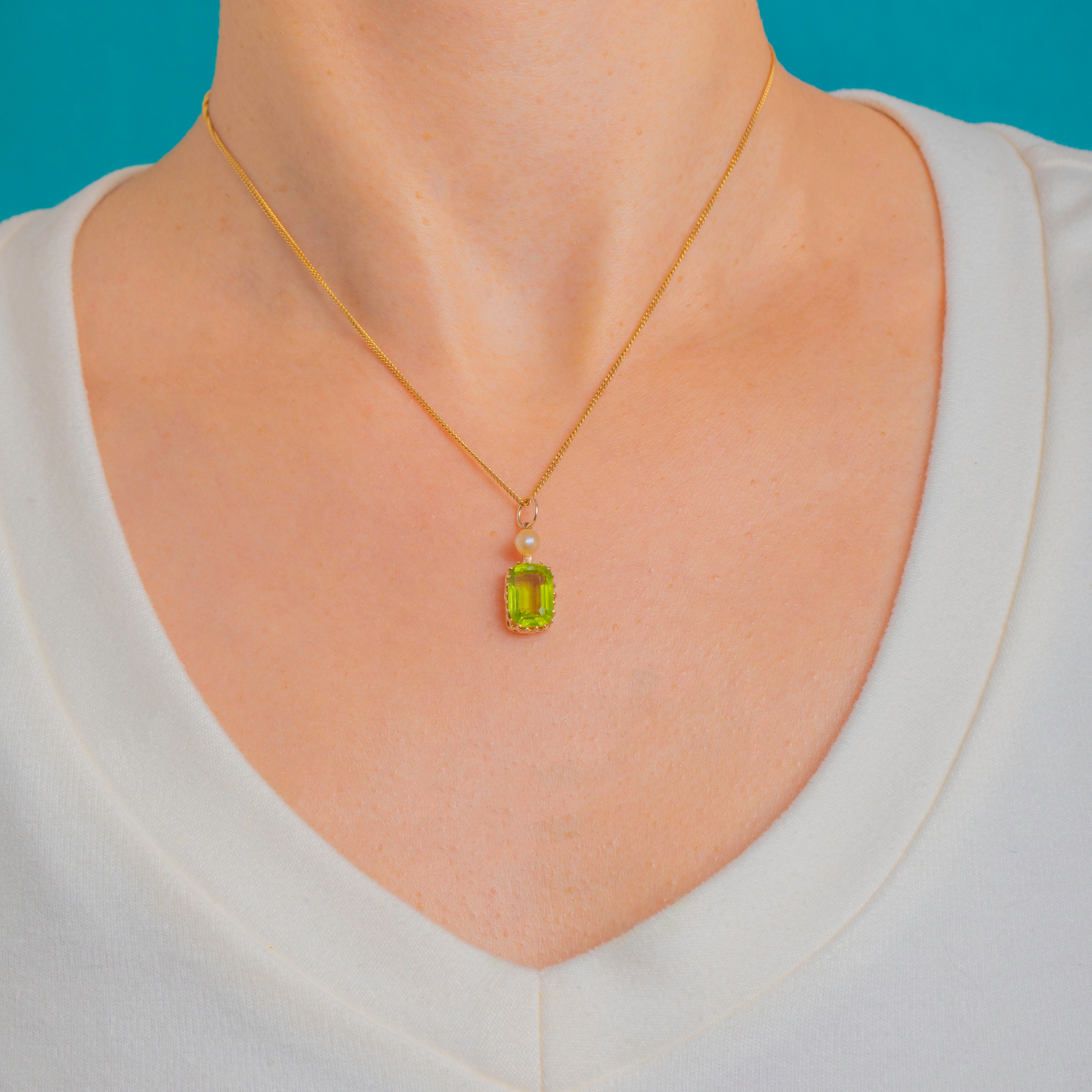 A delicate Edwardian treasure, this 9ct Gold charm pairs a creamy Pearl with a vibrant emerald-cut Peridot in a graceful articulated drop. The Peridot’s lively chartreuse hue and crisp step facets catch the light beautifully, weighing approximately 3.00cts for a glorious splash of colour.