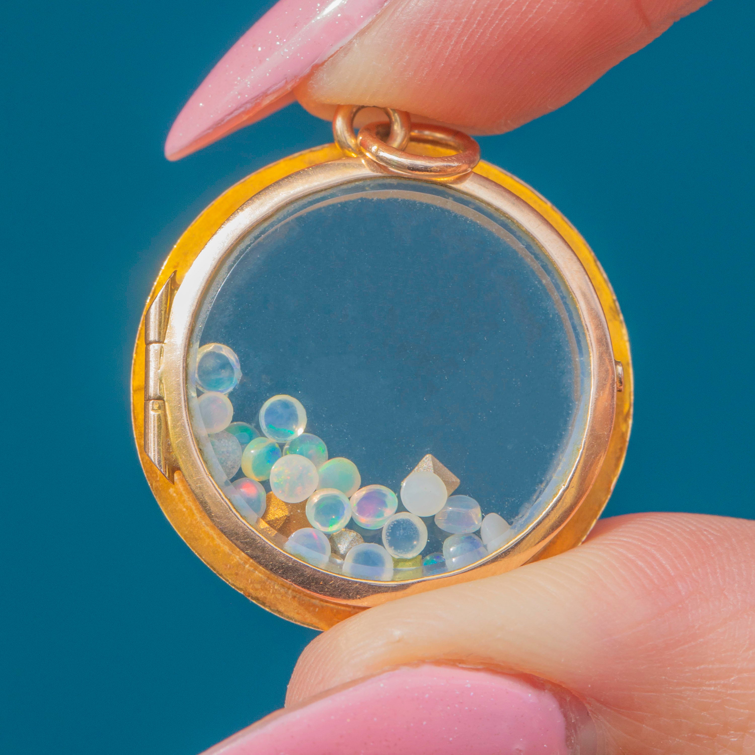 This Edwardian 9ct Gold shaker locket will provide you with endless wearing pleasure! The satisfying, buttery 9ct Gold frame surrounds a glass compartment, filled with a generous helping of loose Opals and Diamond Paste that shimmy effortlessly with every movement.