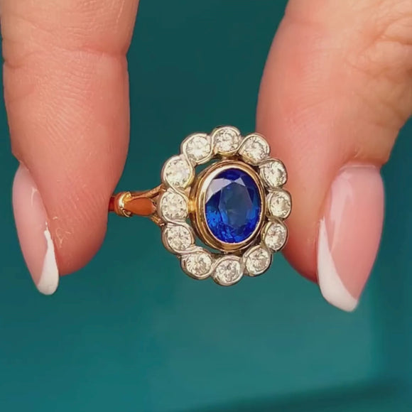 Edwardian French 18ct Gold Sapphire Diamond Oval Cluster Ring, 0.75ct Sapphire
