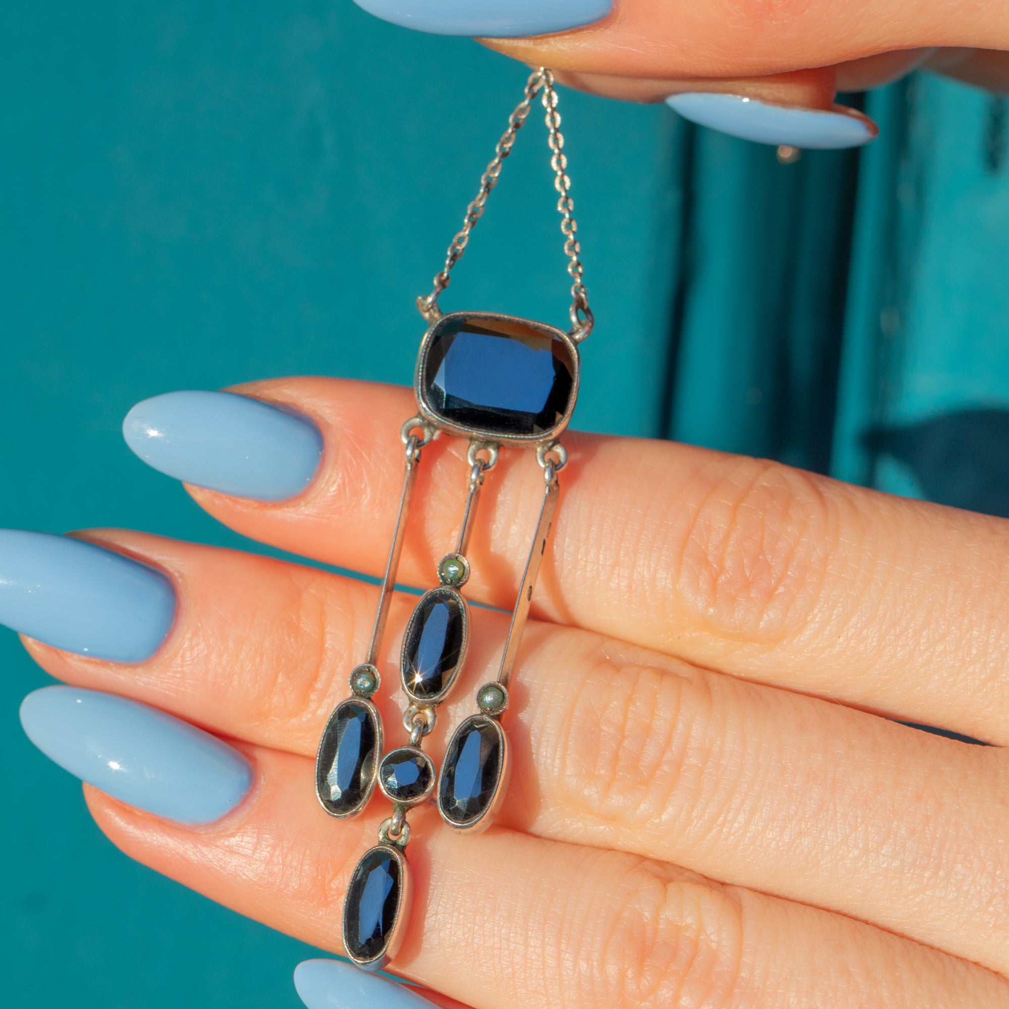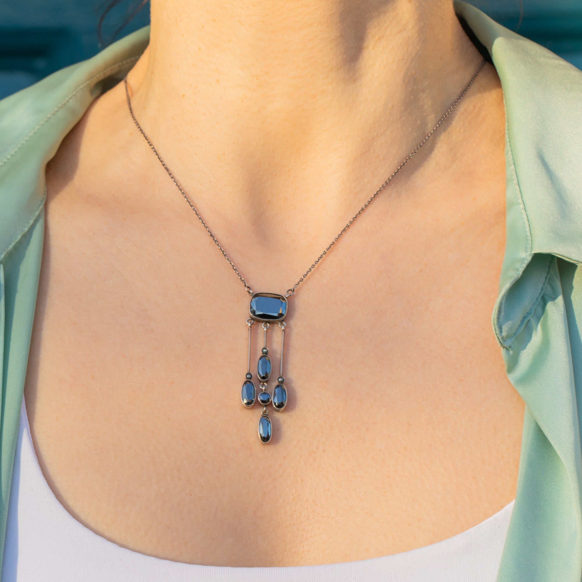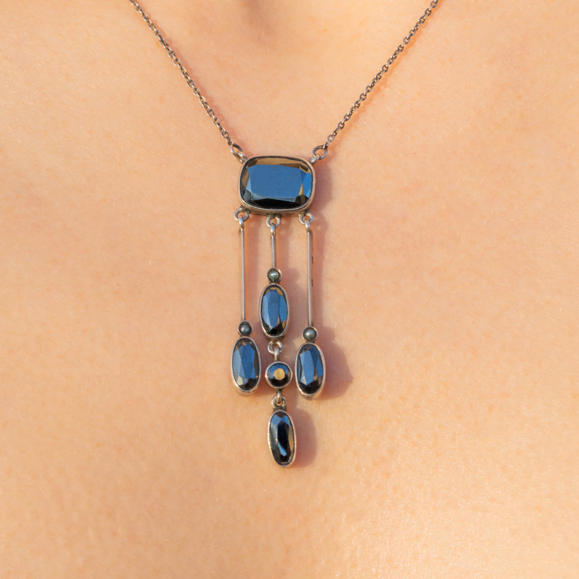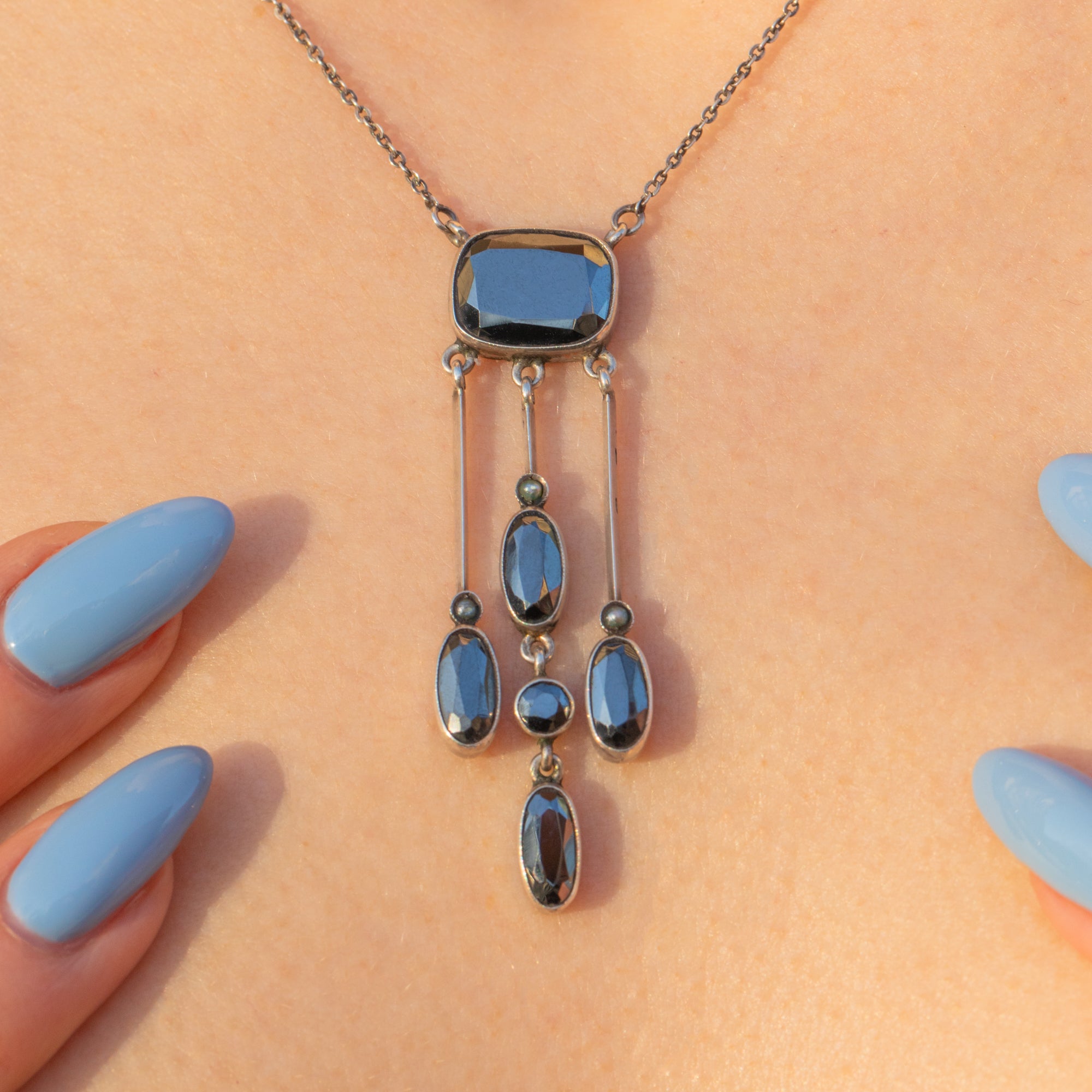 VERY GOOD. This Edwardian Silver Hematite Pearl negligee necklace is in very good condition. The Silver is lustrous with a light antique patina that enhances her antique charm. The Hematite stones are sleek and free from chips or scuffs and Pearls are all present. The stones are all securely set in their bezel settings, ensuring durability and years of enjoyment!