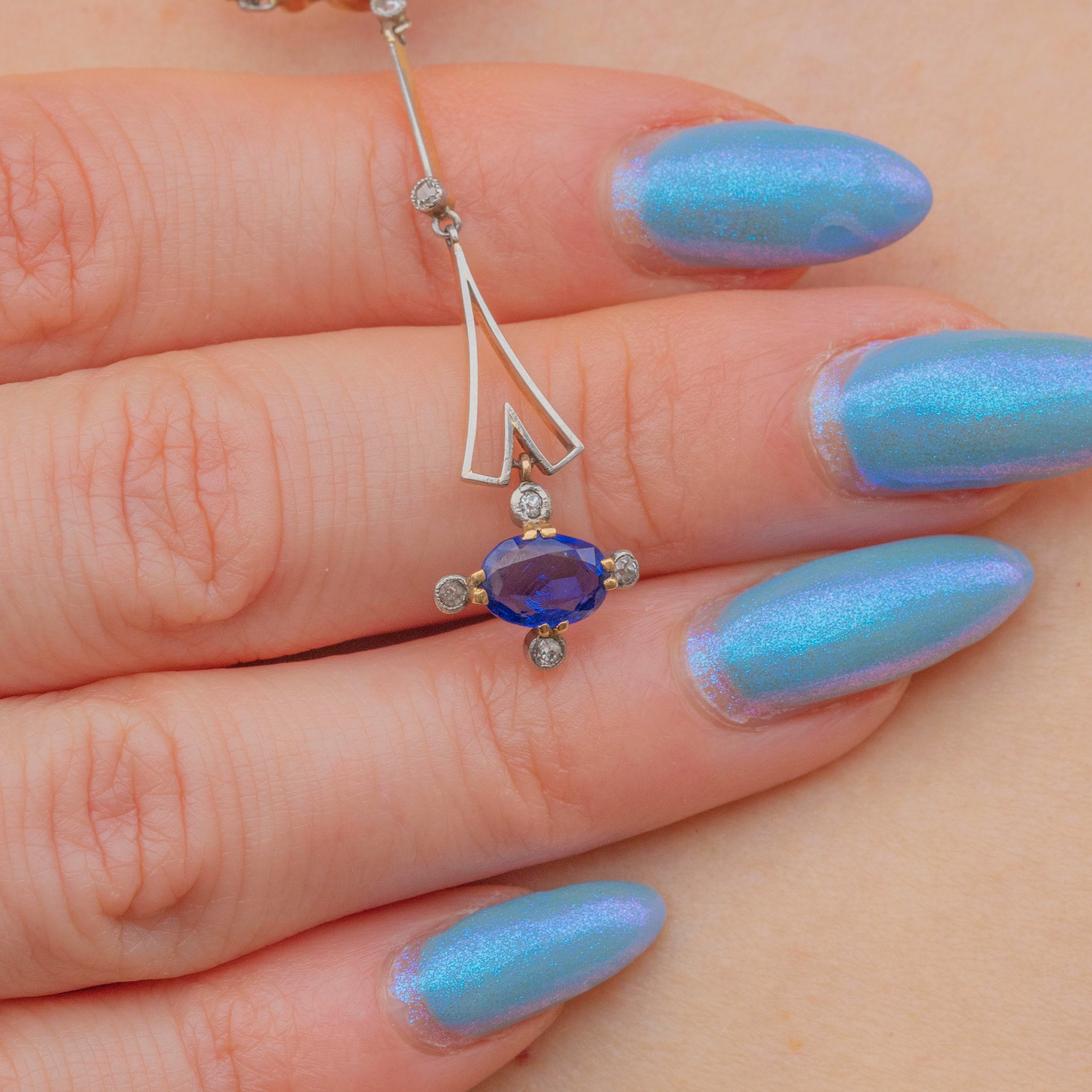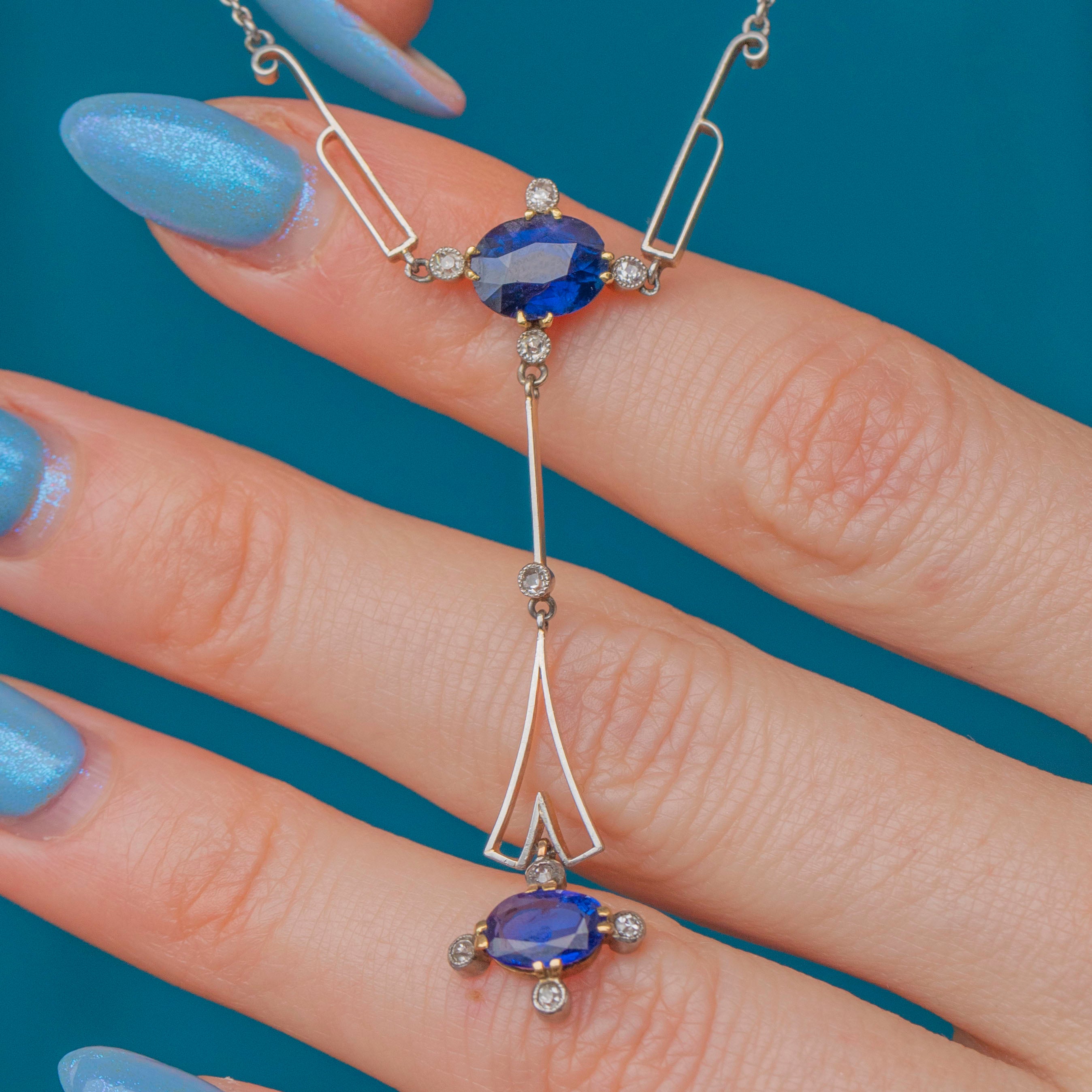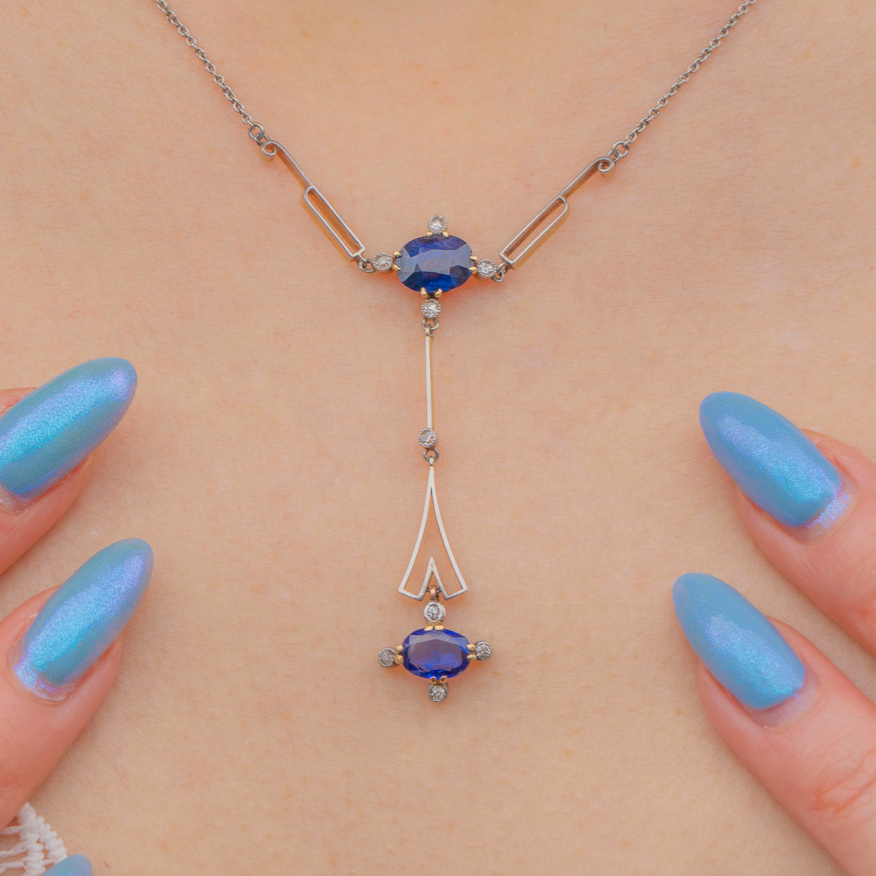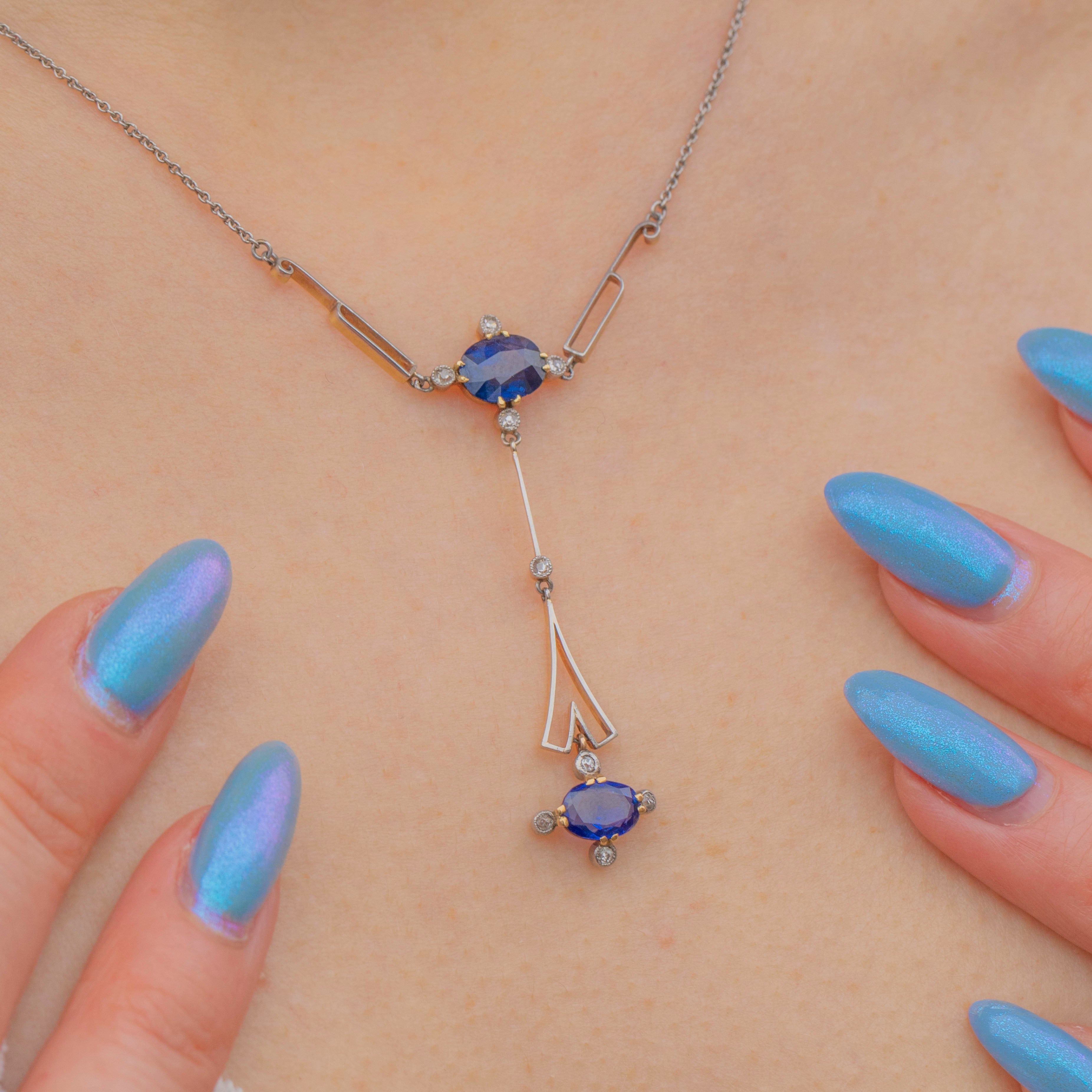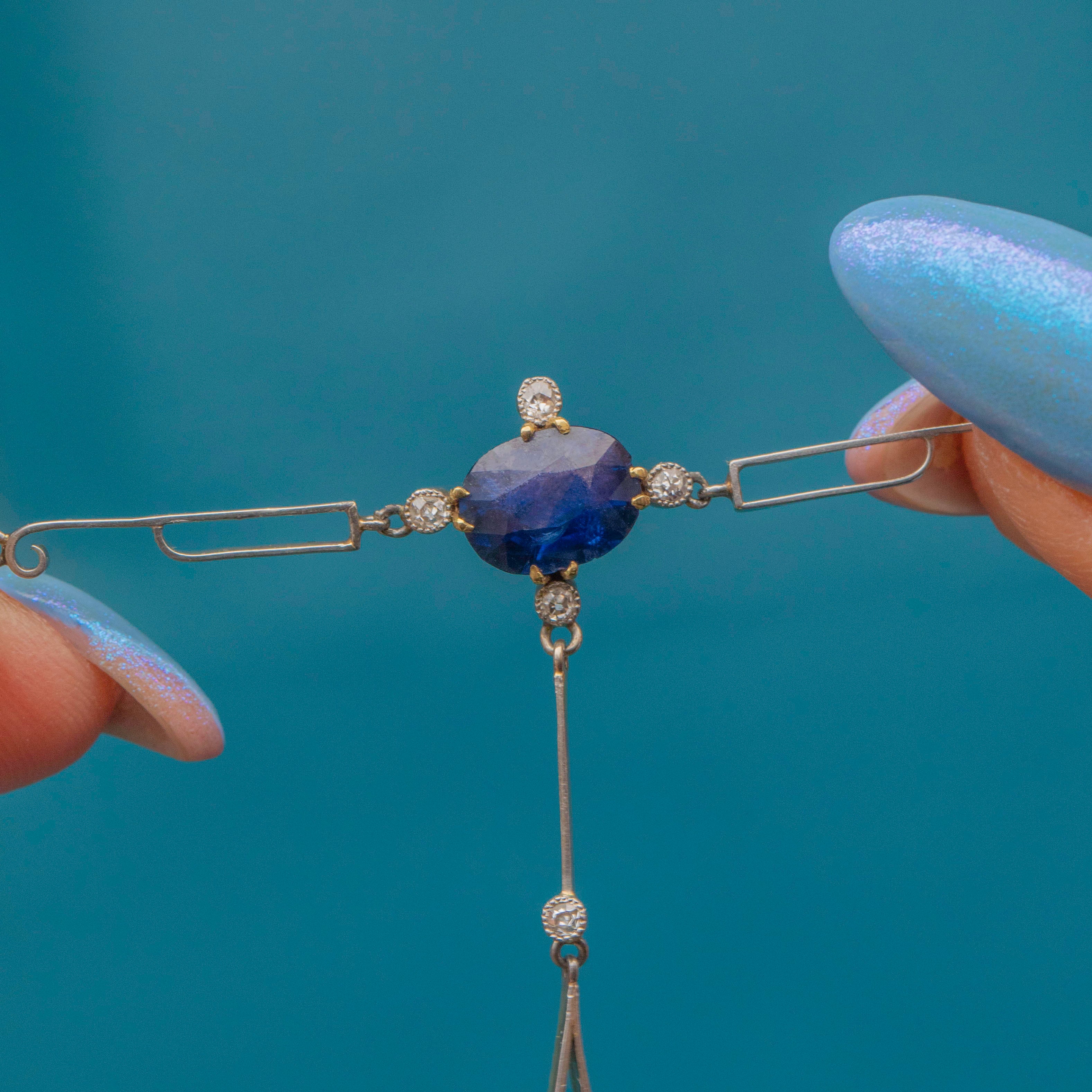 Edwardian Platinum Natural Sapphire Diamond Drop Necklace, 2.30ct Natural Sapphires