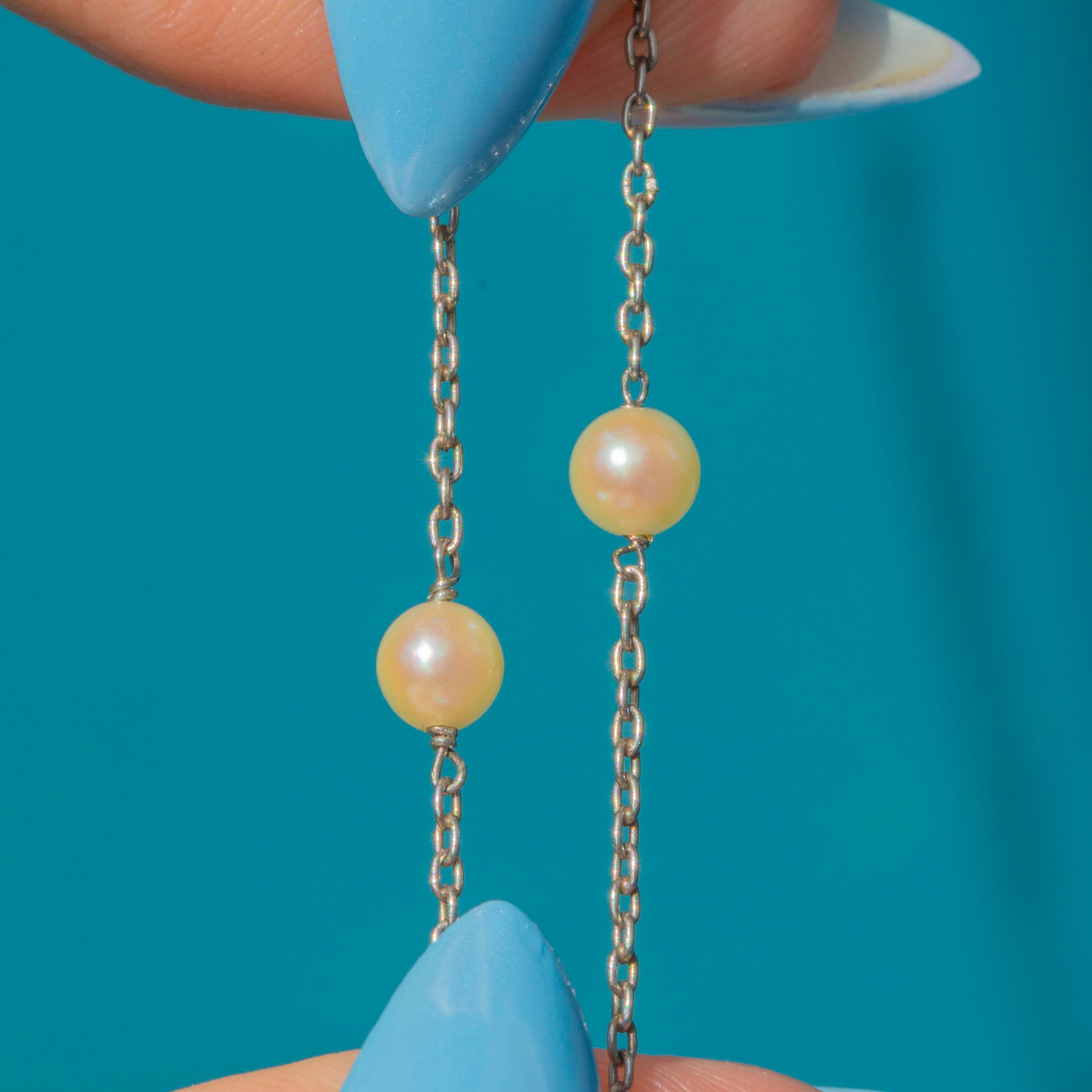 EXCELLENT: The Platinum links are bright and securely connected, with the smooth Pearls retaining their full nacre. Each Pearl is securely set, and the later-added 18ct Gold bolt ring clasp functions perfectly.