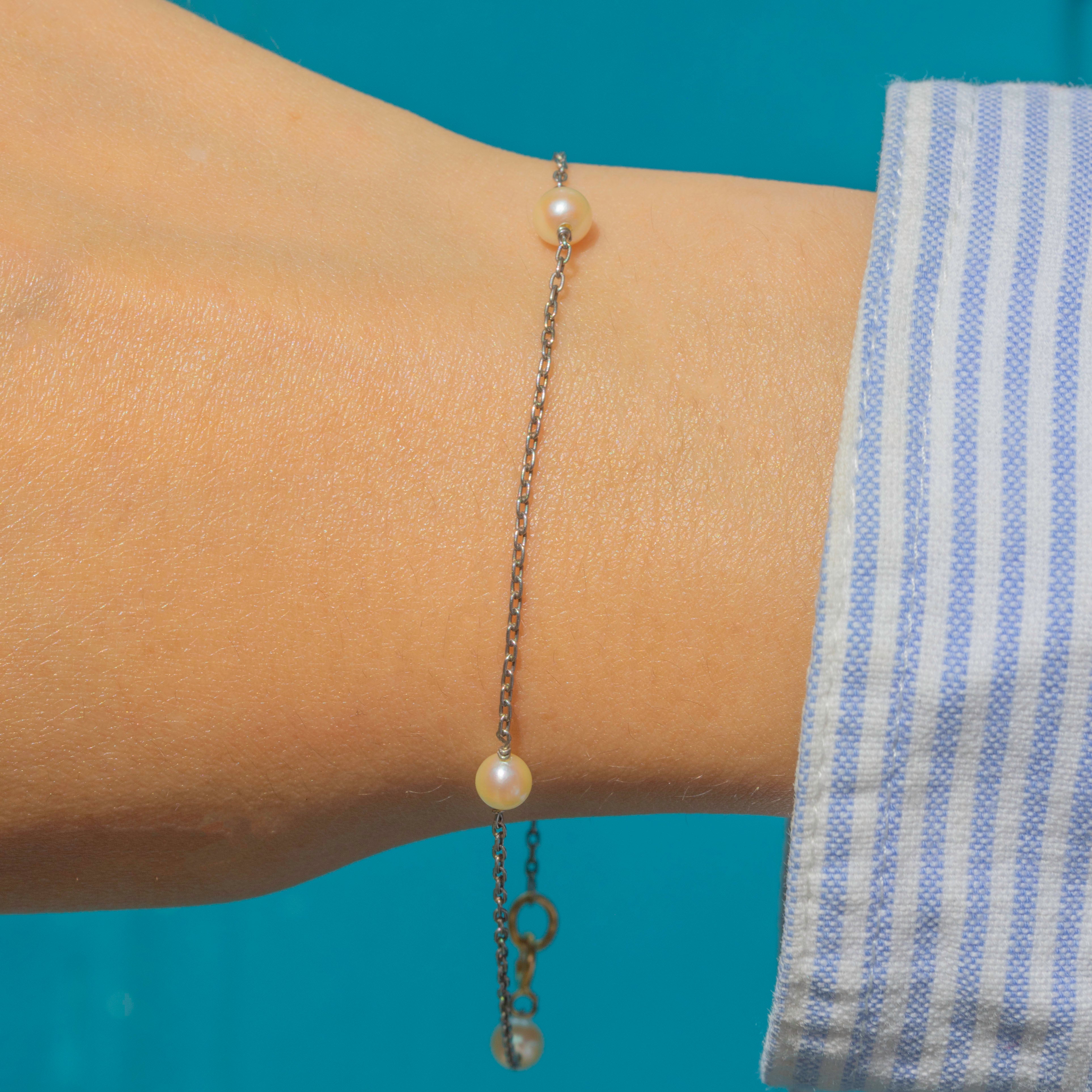 This elegant Edwardian Pearl bracelet is a timeless piece of wrist candy! Delicate Platinum links are interspersed with lustrous Pearls, each glowing with a soft iridescence.