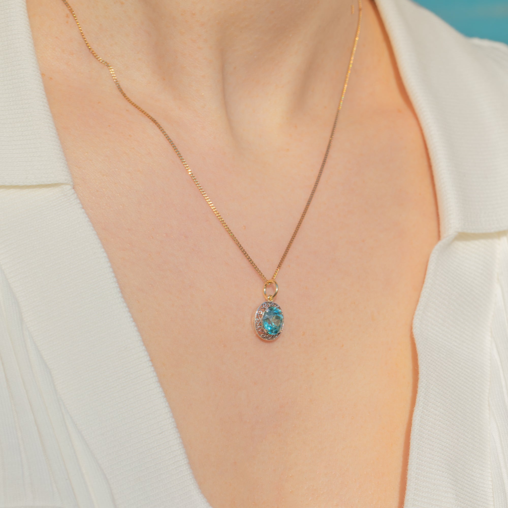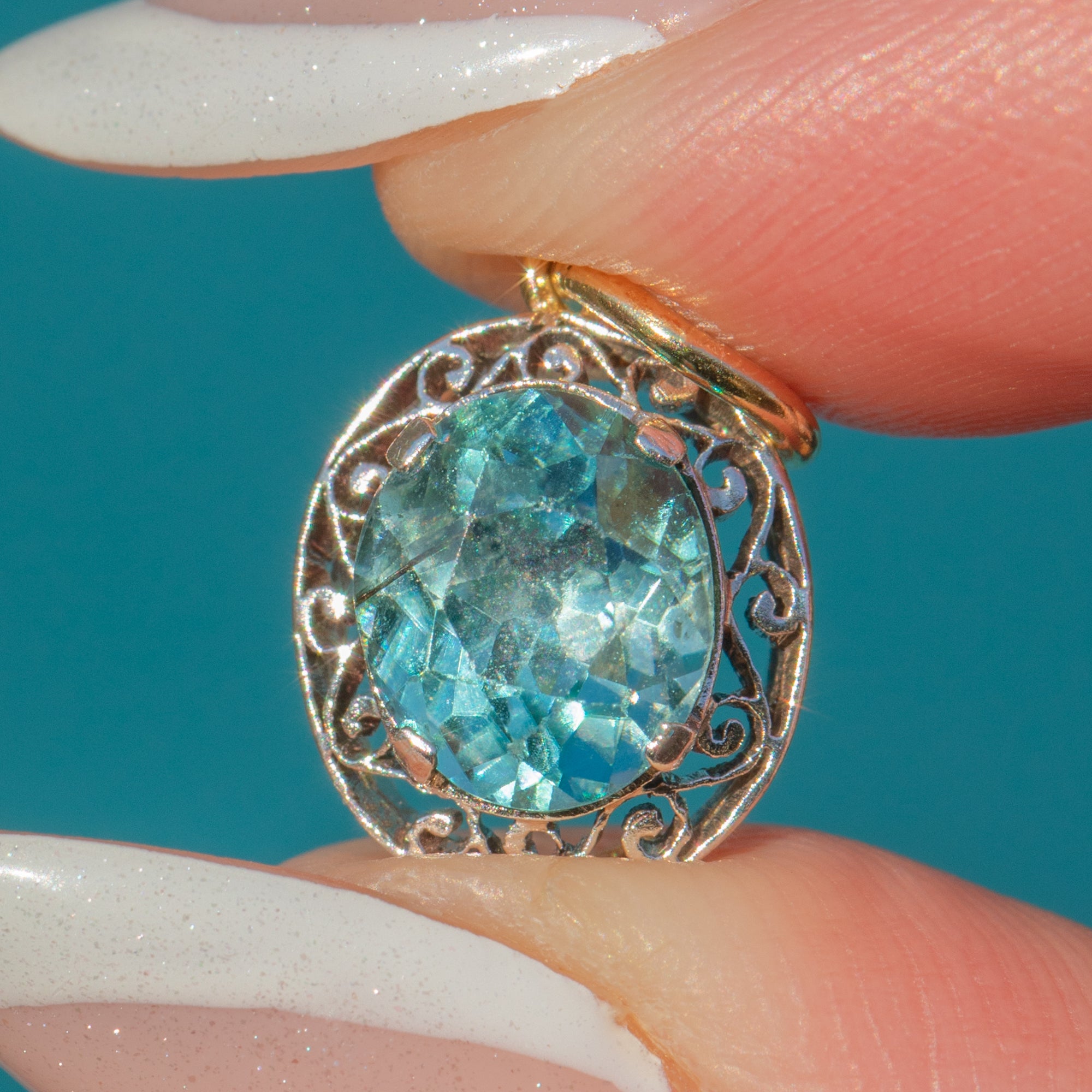 This Edwardian Silver & 9ct Gold Blue Zircon charm is a glimmering little treasure! The crispy faceted 1.80ct Zircon boasts icy blue hues that glint magnificently under the light.
