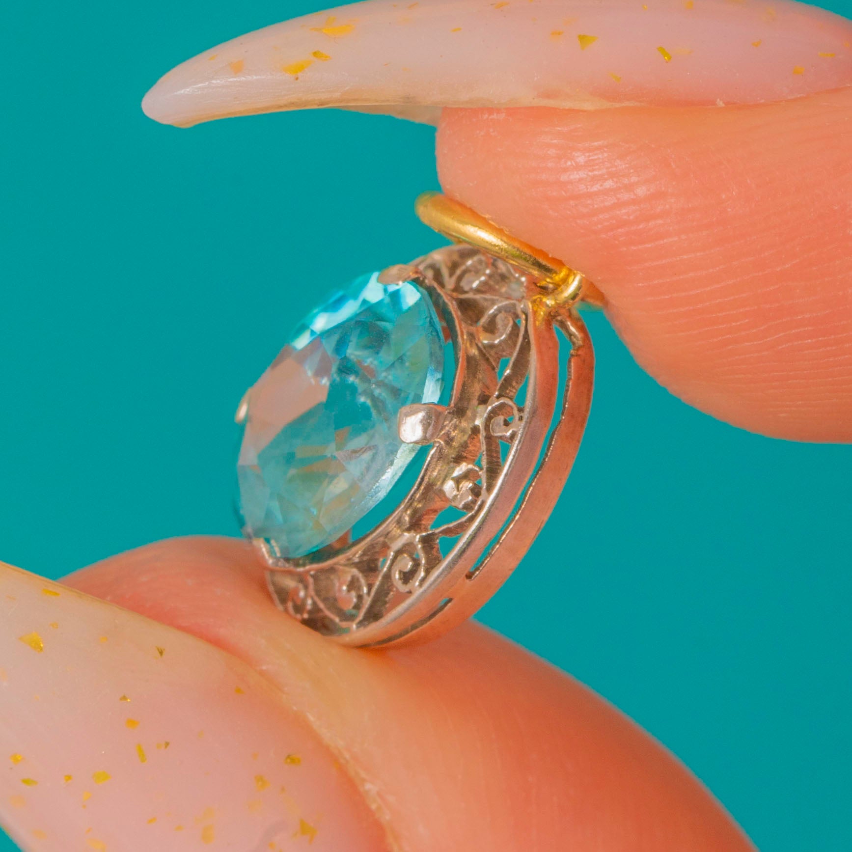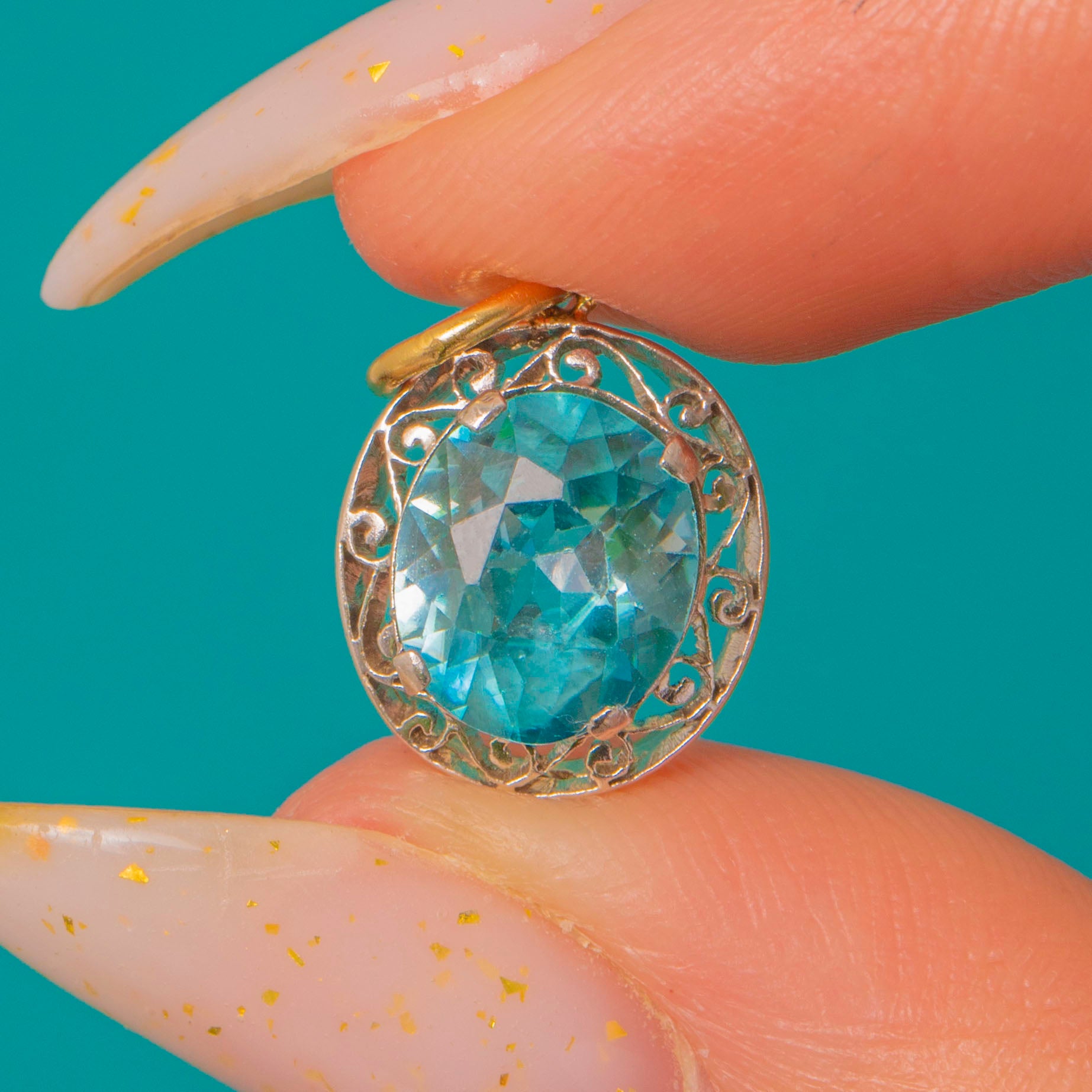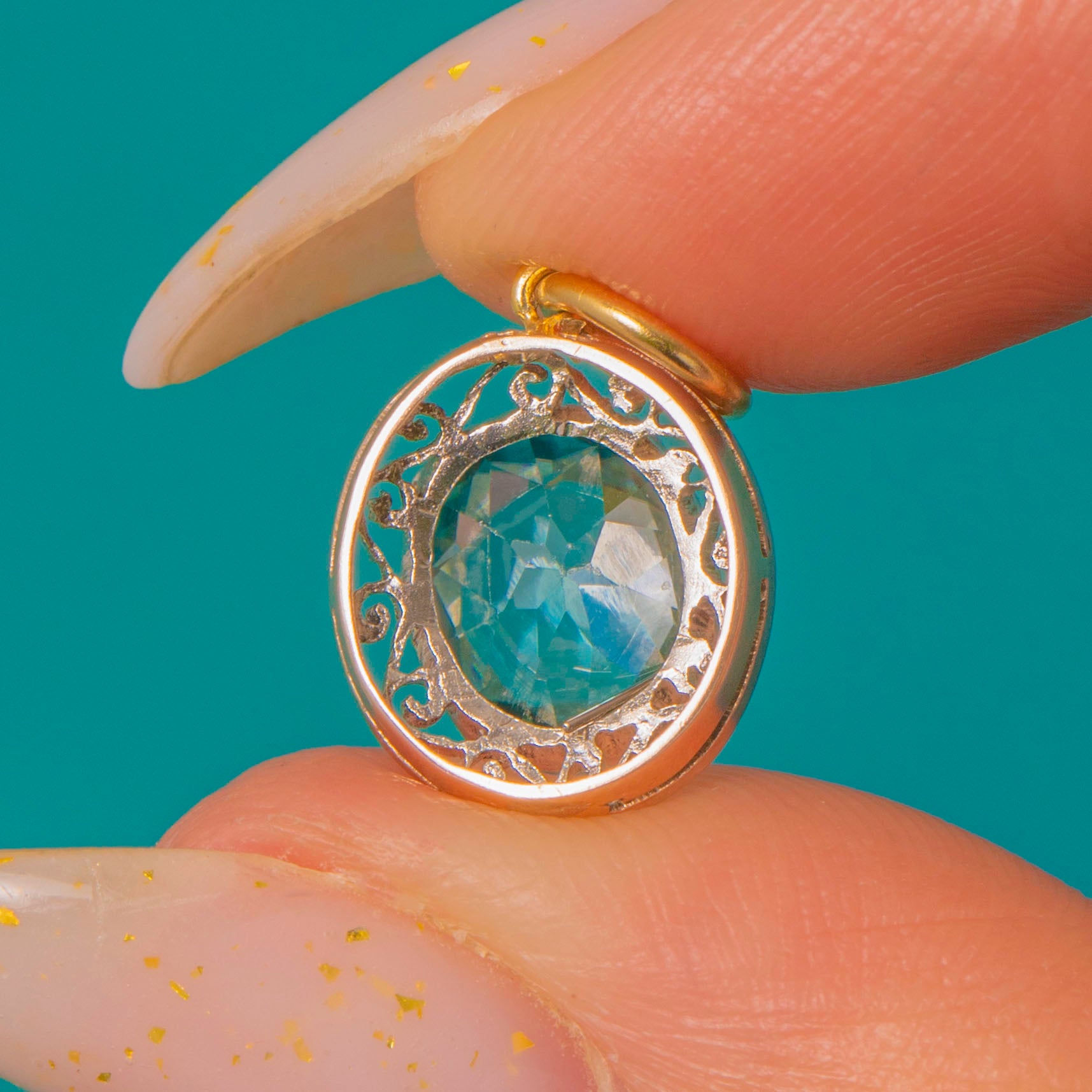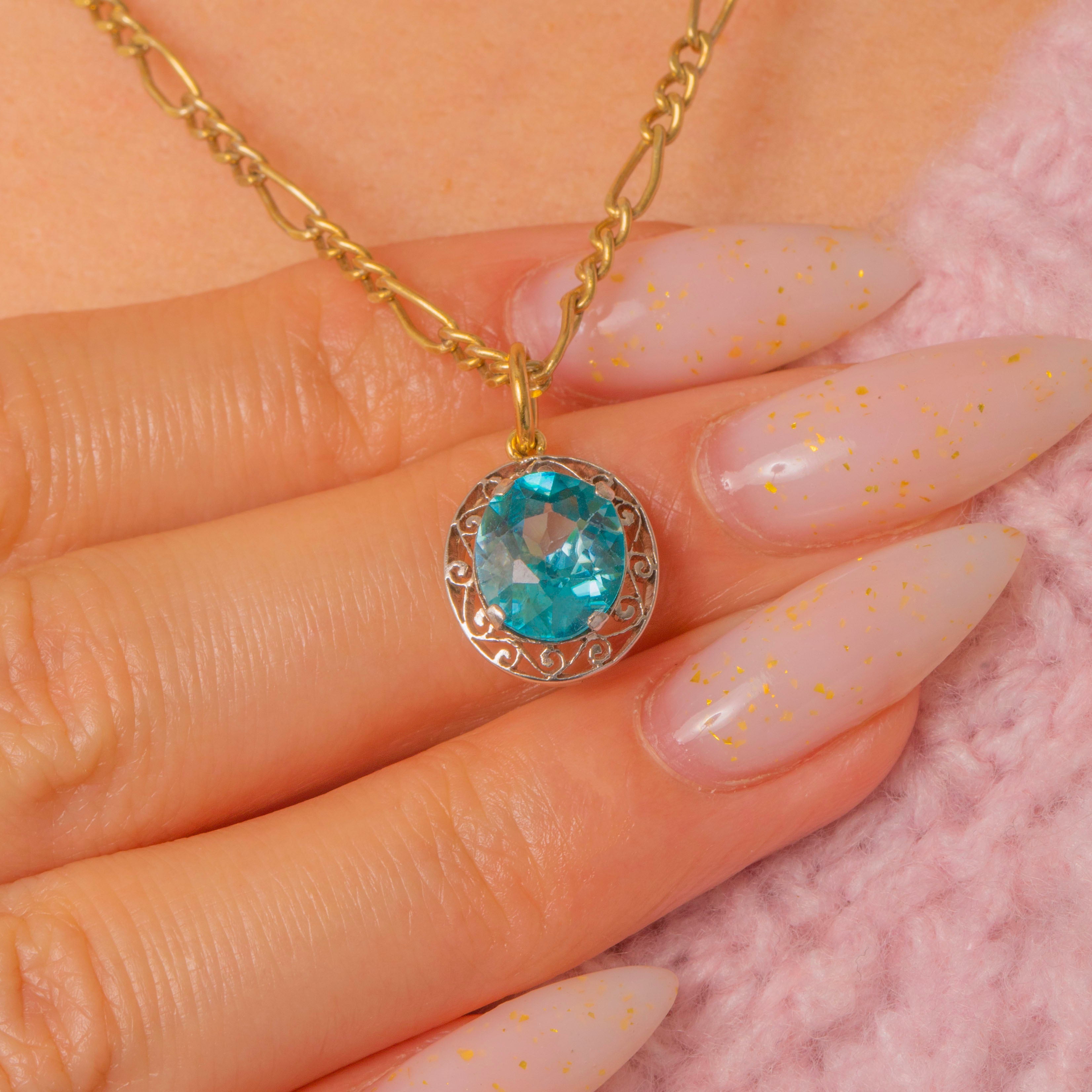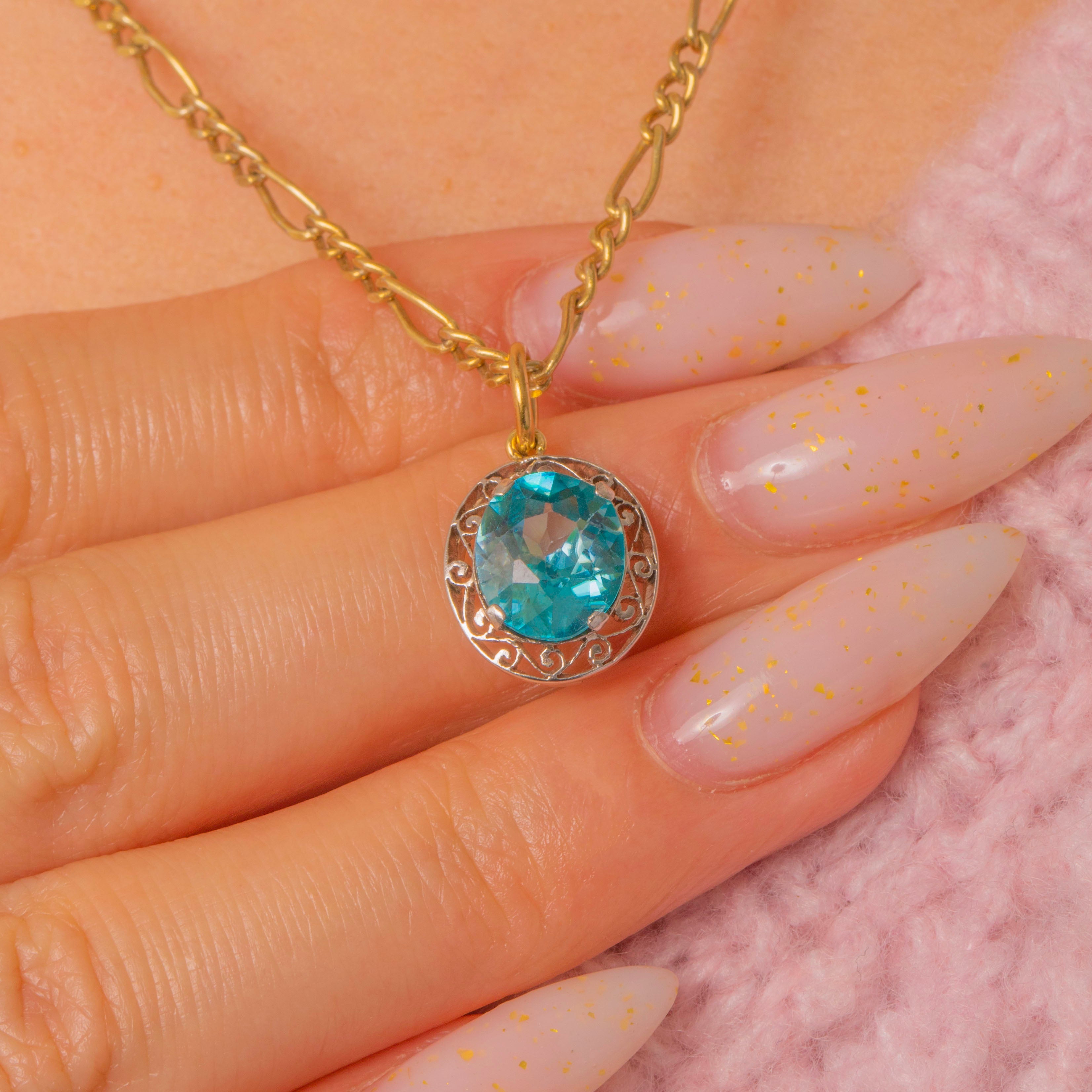 A petite two‑tone charm that pairs ornate Edwardian‑inspired filigree with a bright, faceted Blue Zircon. The aqua‑teal zircon sits in a low collet within a pierced scroll and foliate surround, the openwork halo lending an airy, romantic silhouette. Delicate and refined on a fine chain, this charm reads as vintage revival—ornate yet dainty, perfect for everyday wear or layered styling.