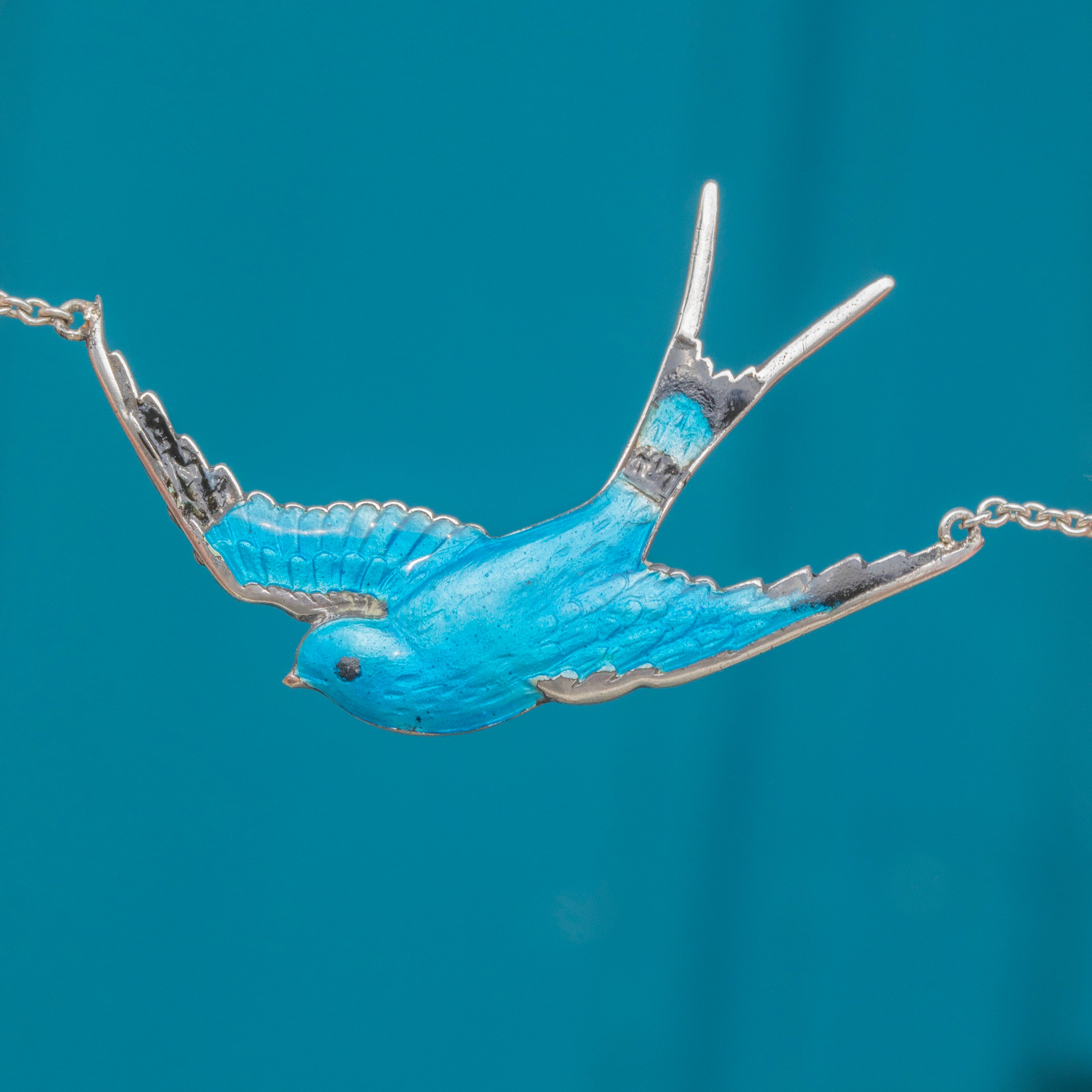 Edwardian Silver Blue Enamel Swallow Bird Necklace