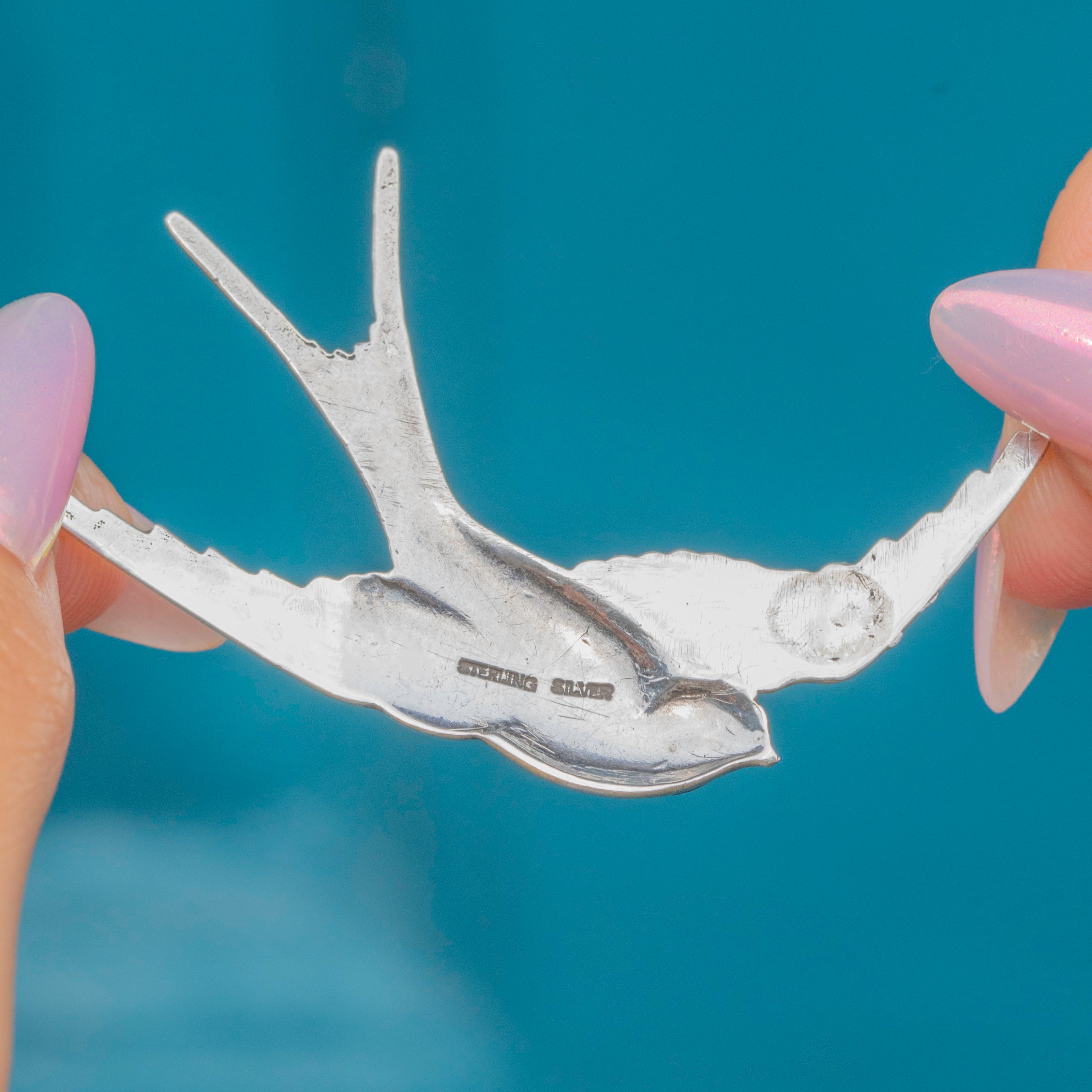 VERY GOOD-EXCELLENT: This Silver Enamel swallow bird necklace is in great condition. The swallow feature has been crafted beautifully, though there are some specks of discolouration to the Enamel and some more notable signs of wear to the back of the pendant. Despite this, the signs of wear are difficult to spot when wearing and do not affect her functionality. Complete with a chain in perfect condition, she is a must-have piece!