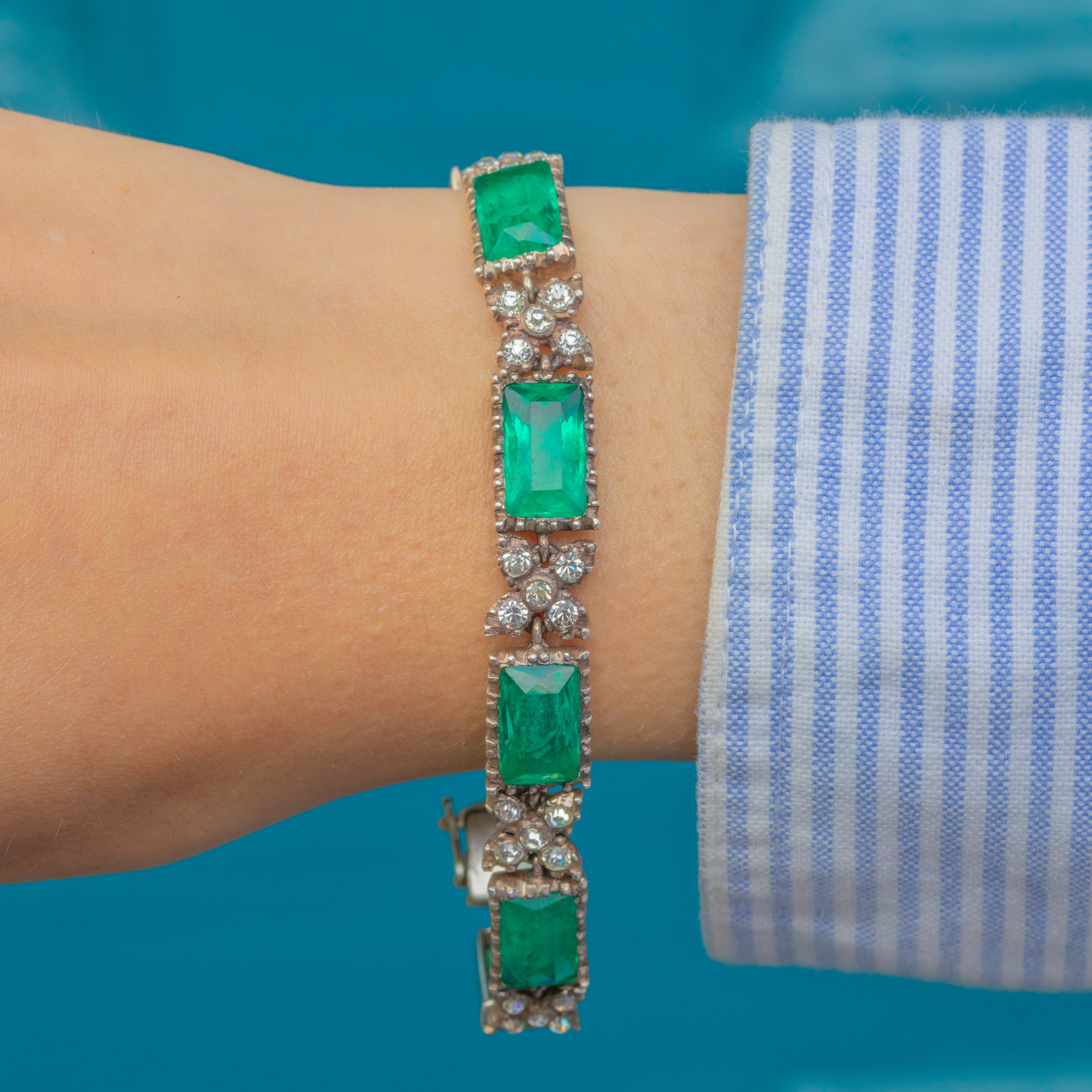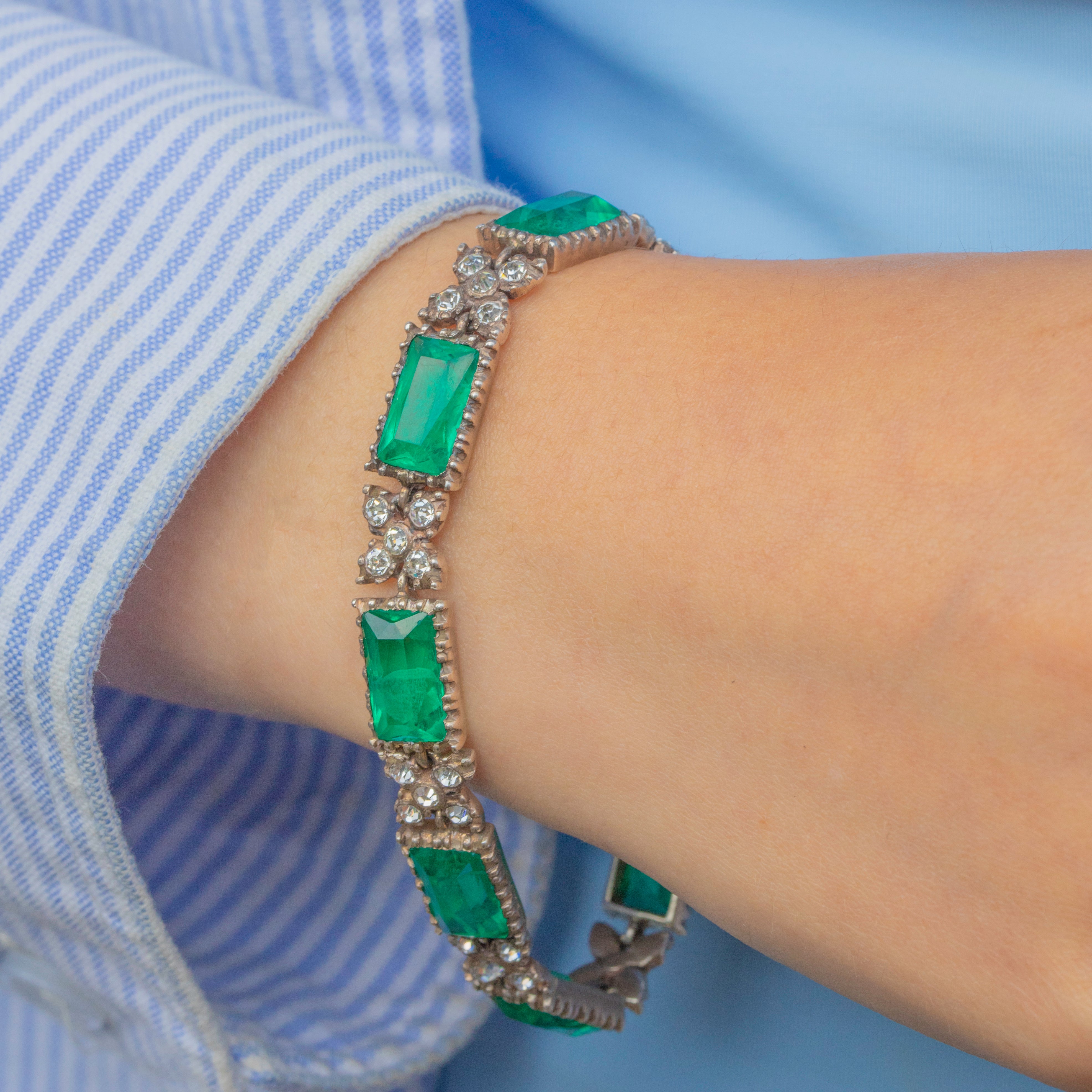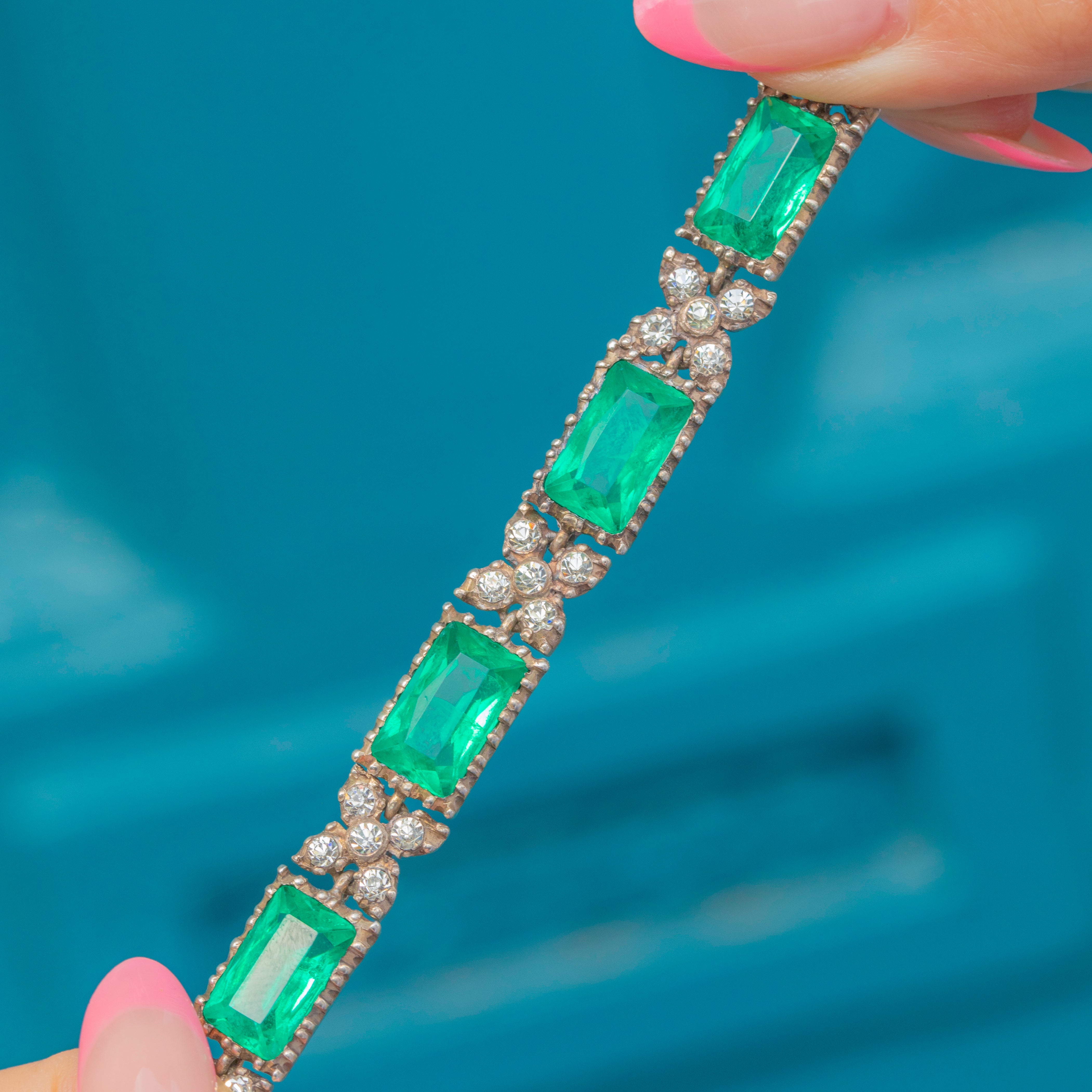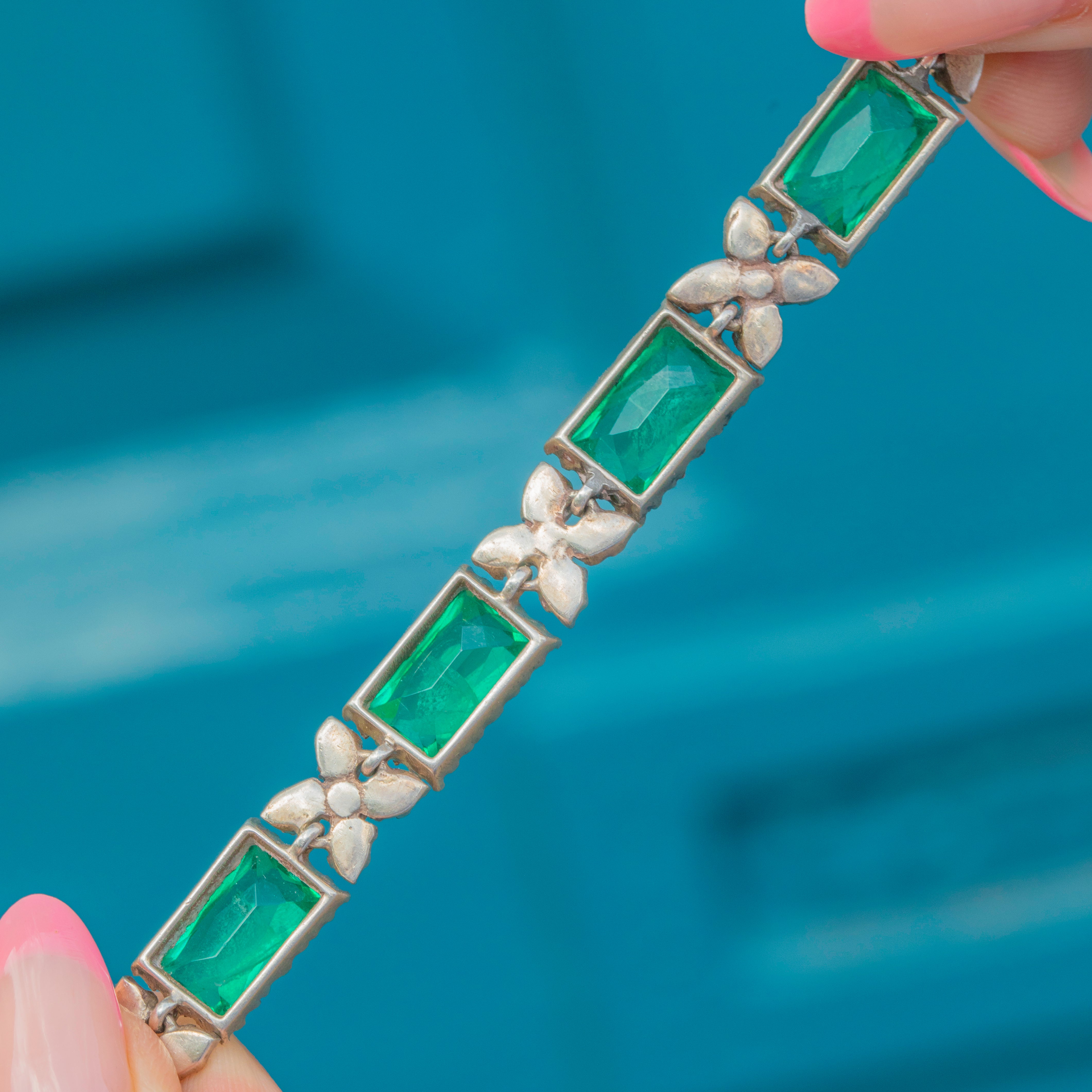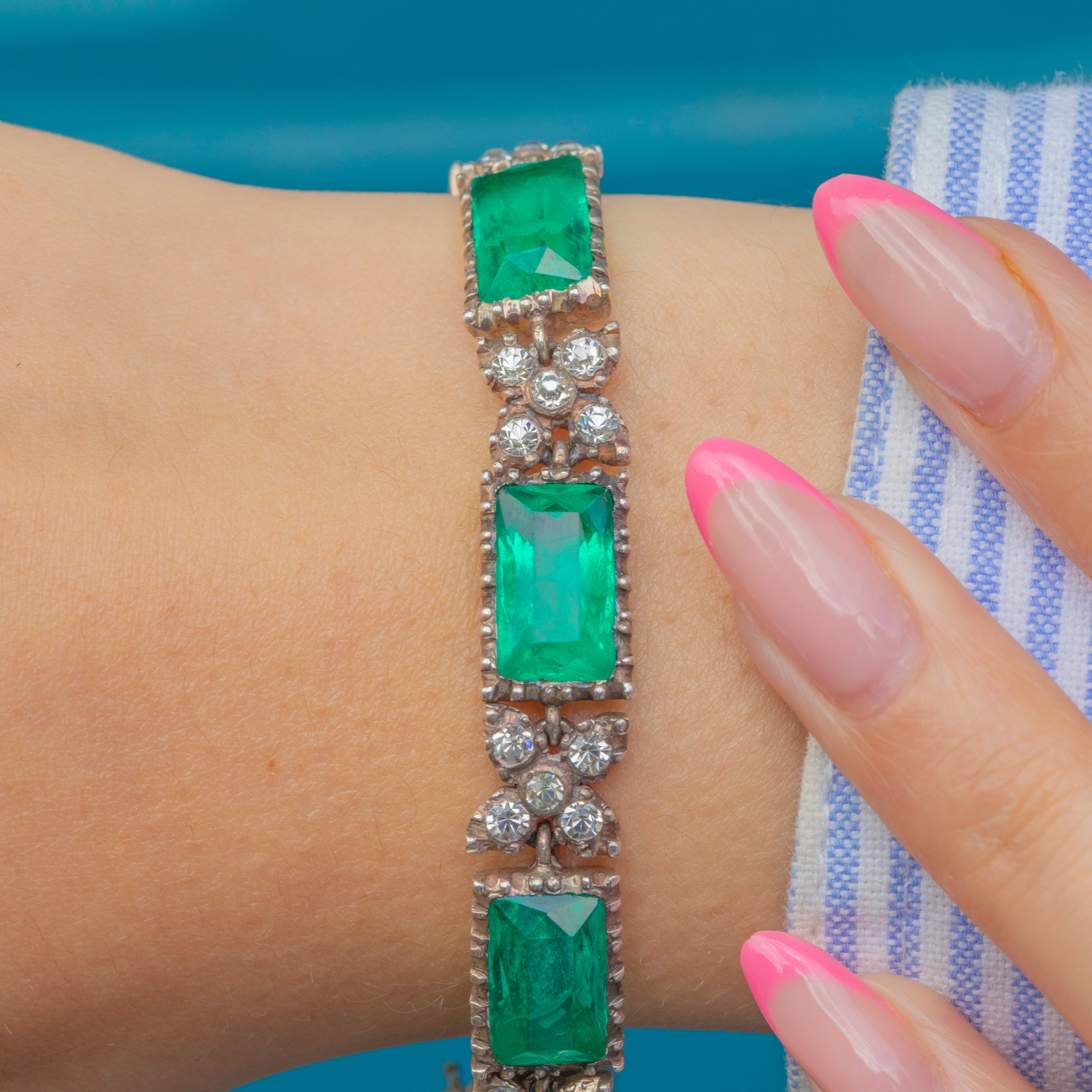 Comprised of vibrant green Lazarus Paste stones, each flanked by white Paste in floral settings, this antique bracelet is an exemplar piece of Edwardian craftsmanship. Each Paste has a dazzling sparkle and is set within glossy serrated Silver bezels, providing a lovely texture and depth.