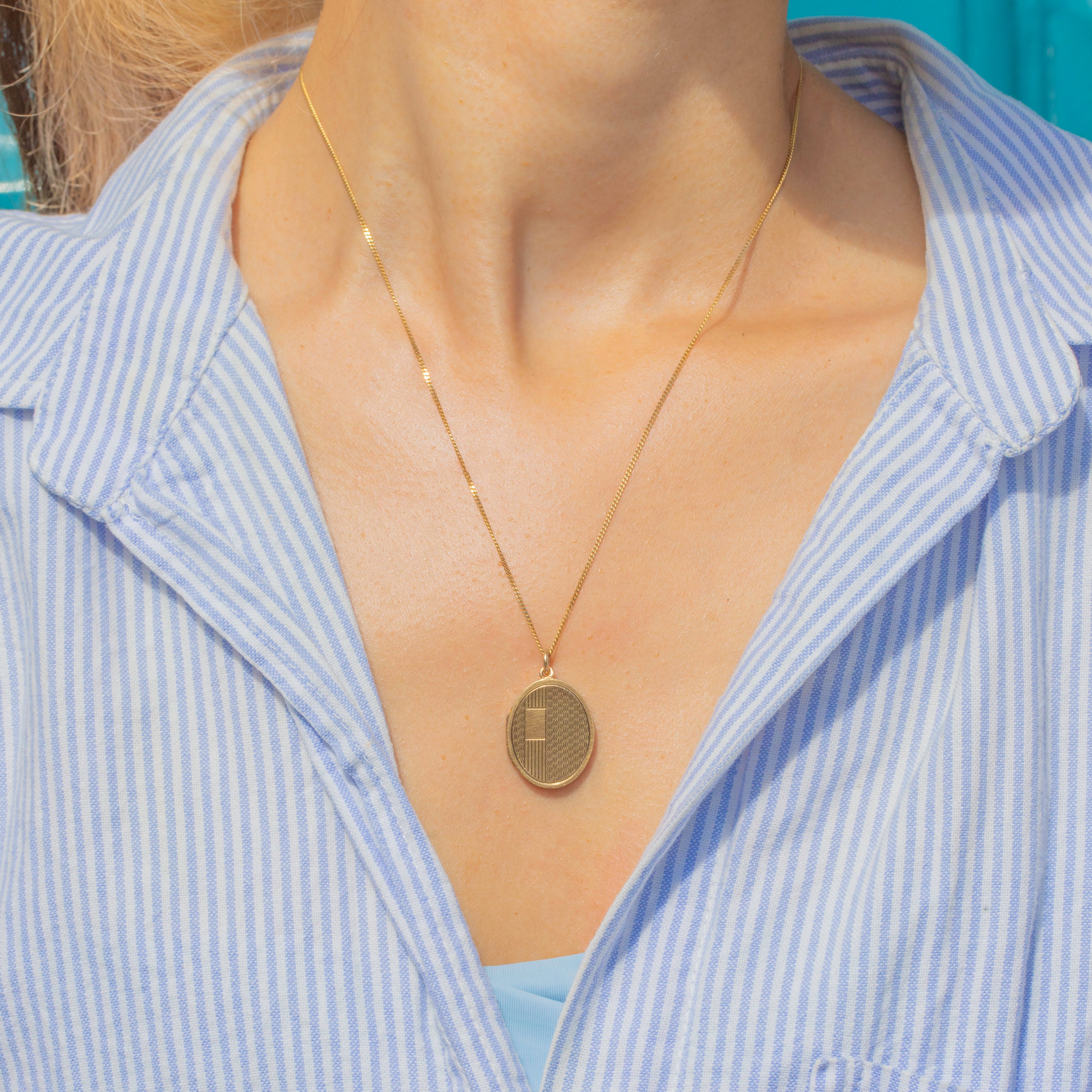 This antique solid Gold locket is inlaid with crisp engravings on its front, providing a lovely texture and depth as it catches the light.