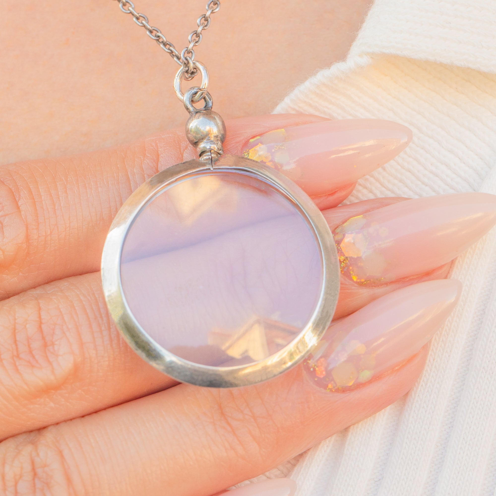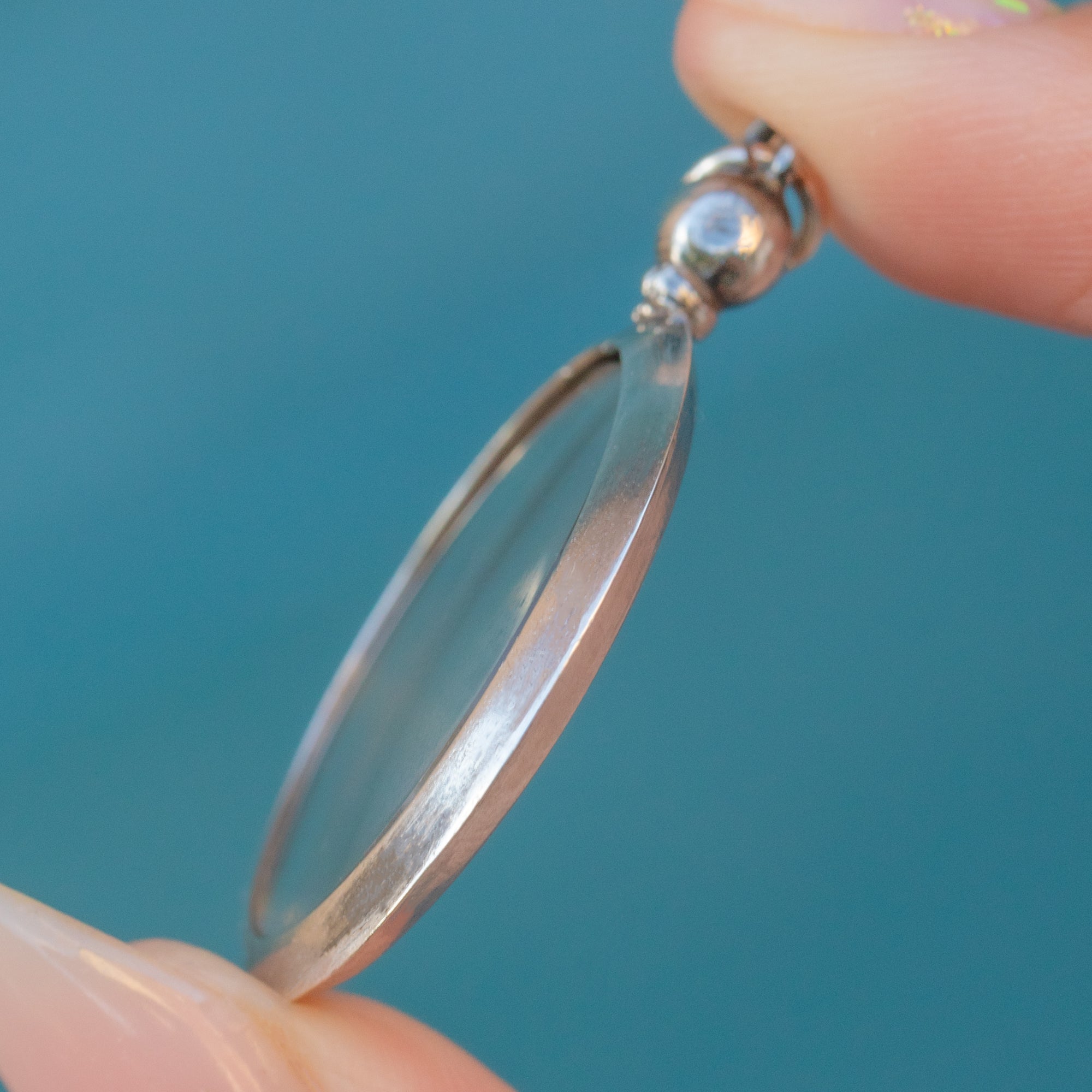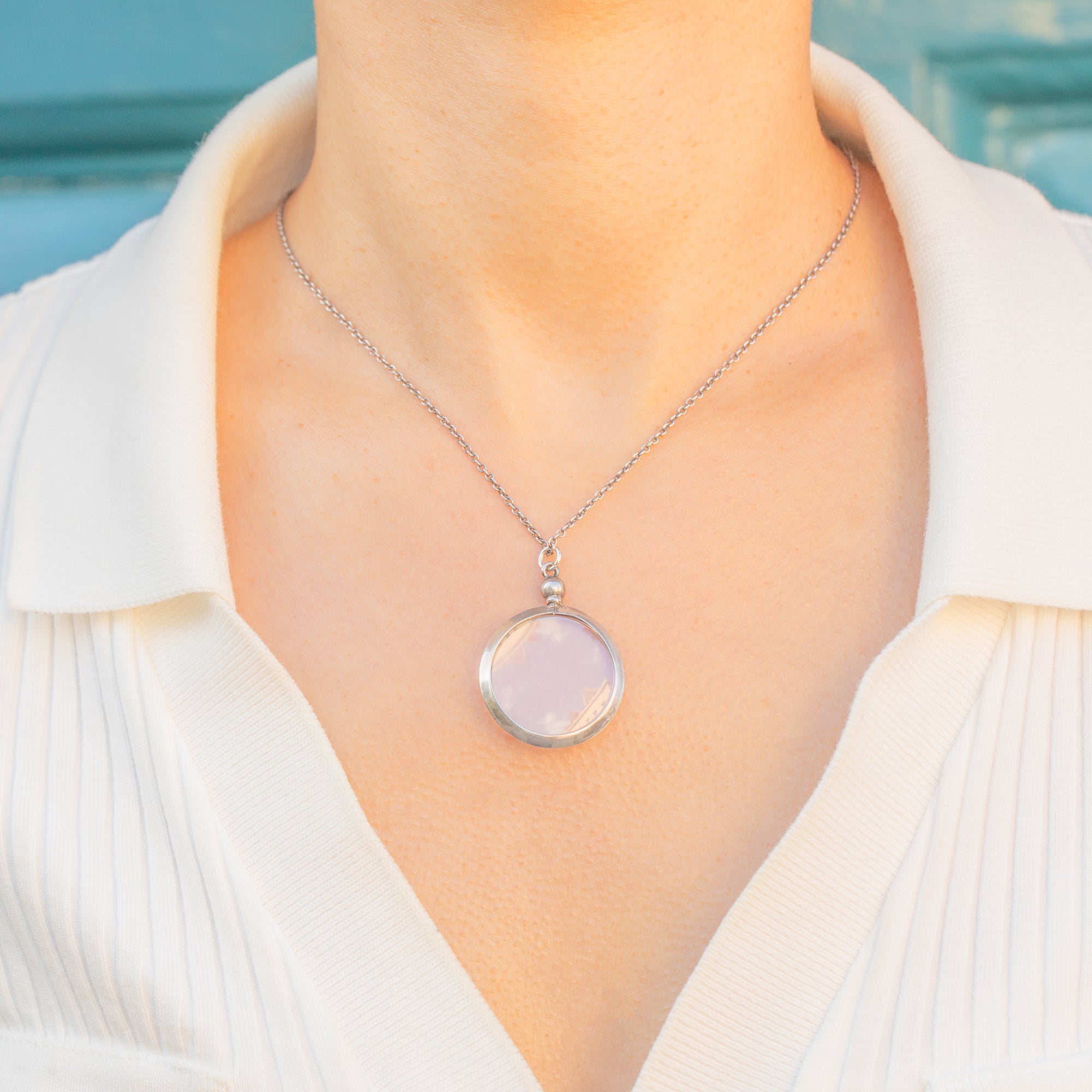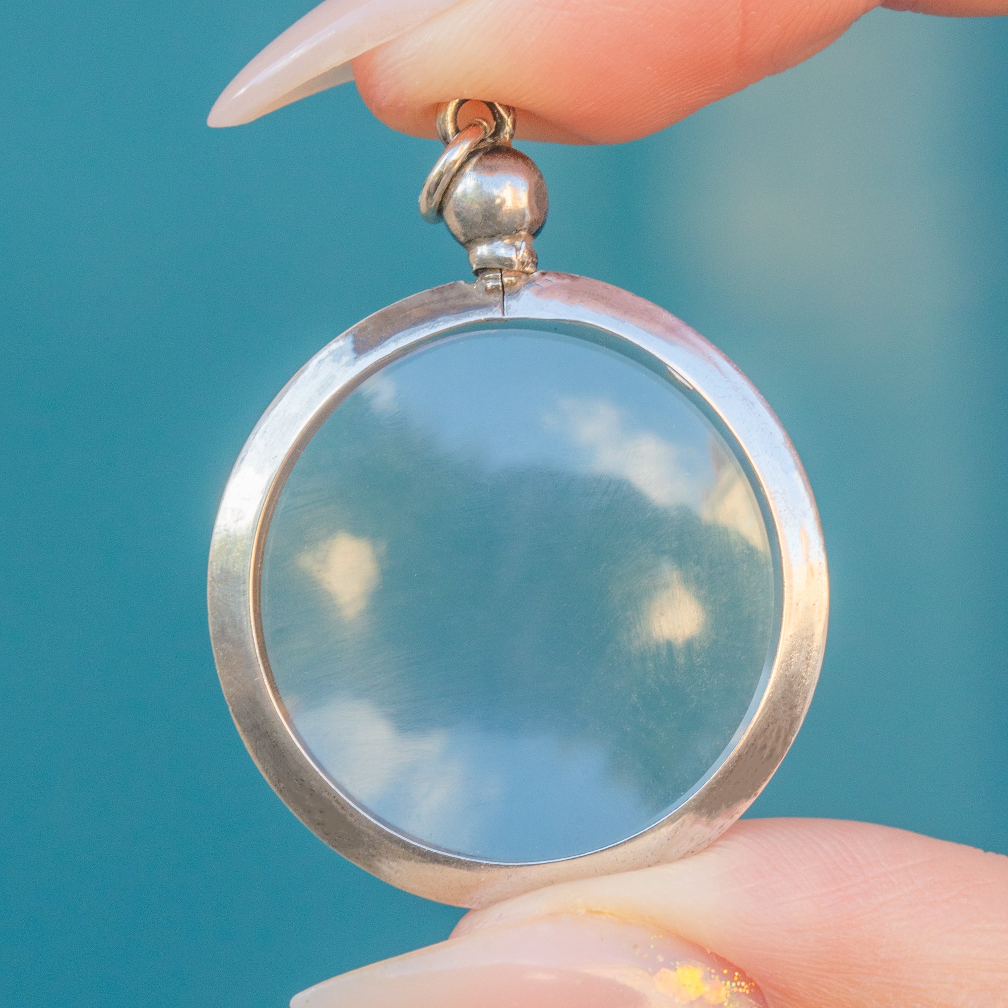 This elegant Edwardian locket pendant is a wonderful example of early 20th-century jewellery design. Crafted in Sterling Silver, the locket features a perfectly circular frame with clear glass windows, ideal for holding and protecting a cherished photograph or keepsake. Its screw-top mechanism remains tight and secure, making it both practical and charming.