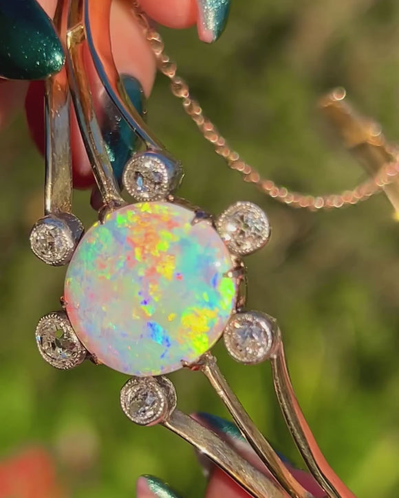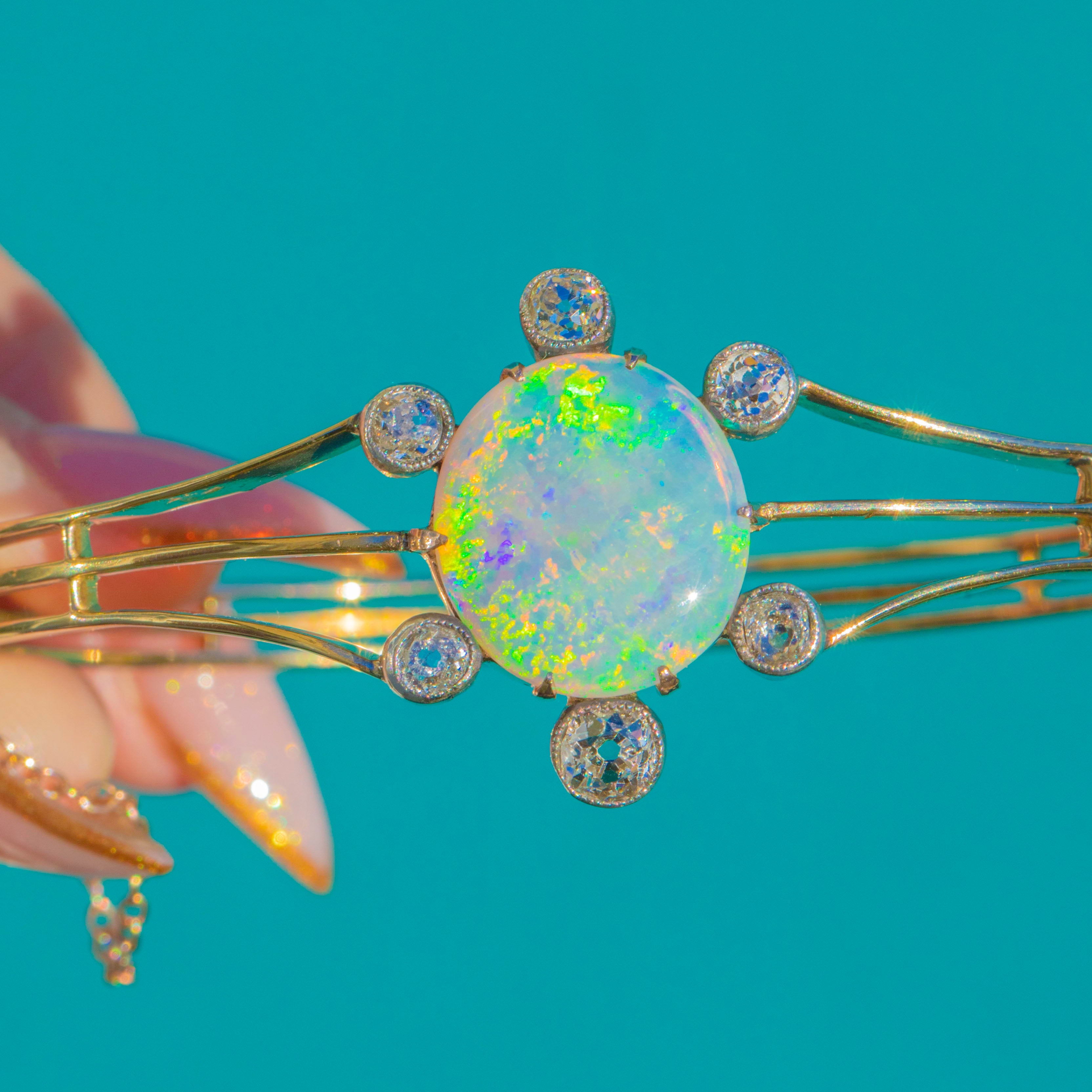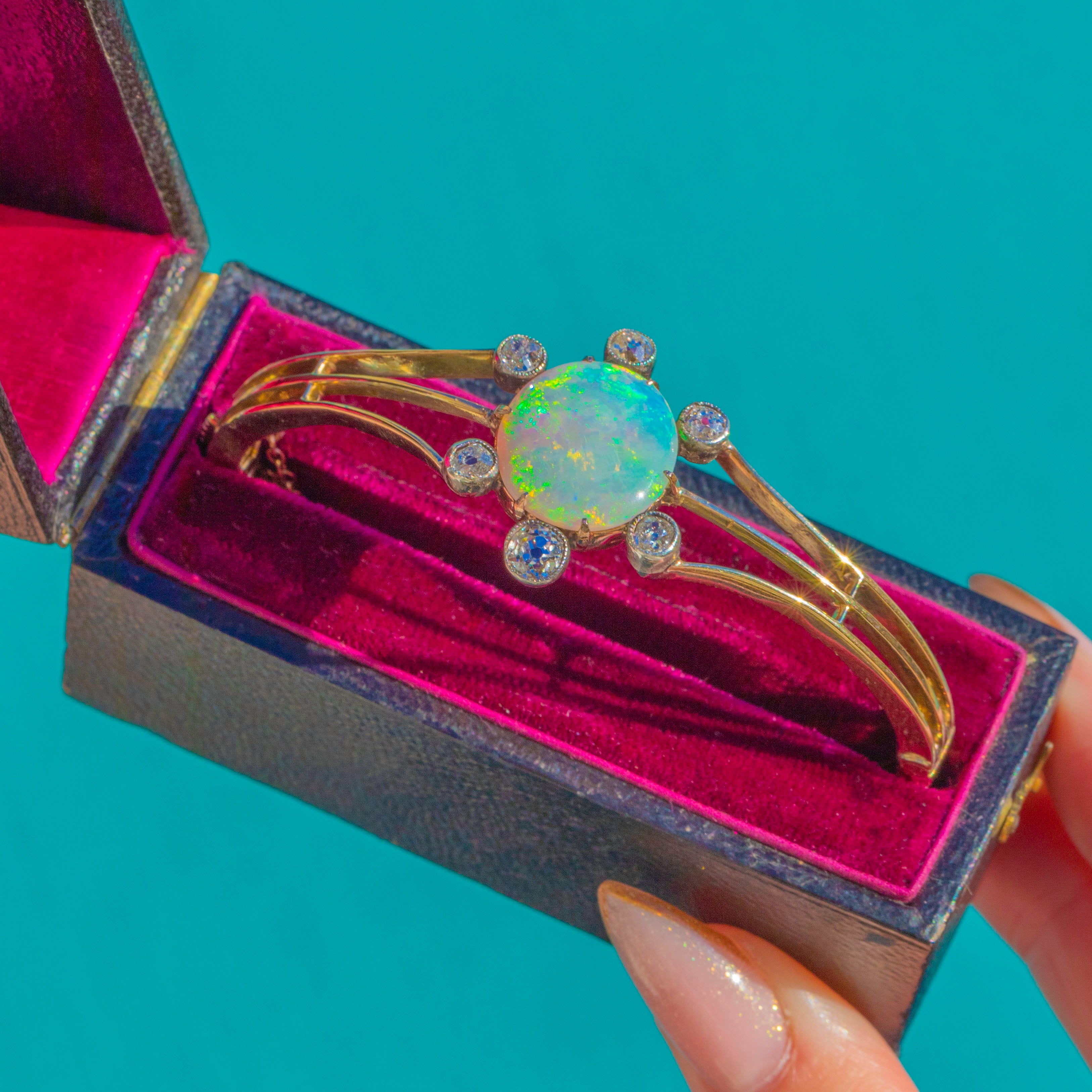 This phenomenal Edwardian celestial bangle is crafted in rich 15ct Gold and set with a spectacular 2.37ct Opal surrounded by Diamond-set star rays. The Opal glows with vibrant flashes of green, blue and neon fire, creating a mesmerising centrepiece. Each ray of the star holds a bright old-cut Diamond, with a total Diamond weight of approximately 0.85cts.